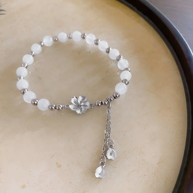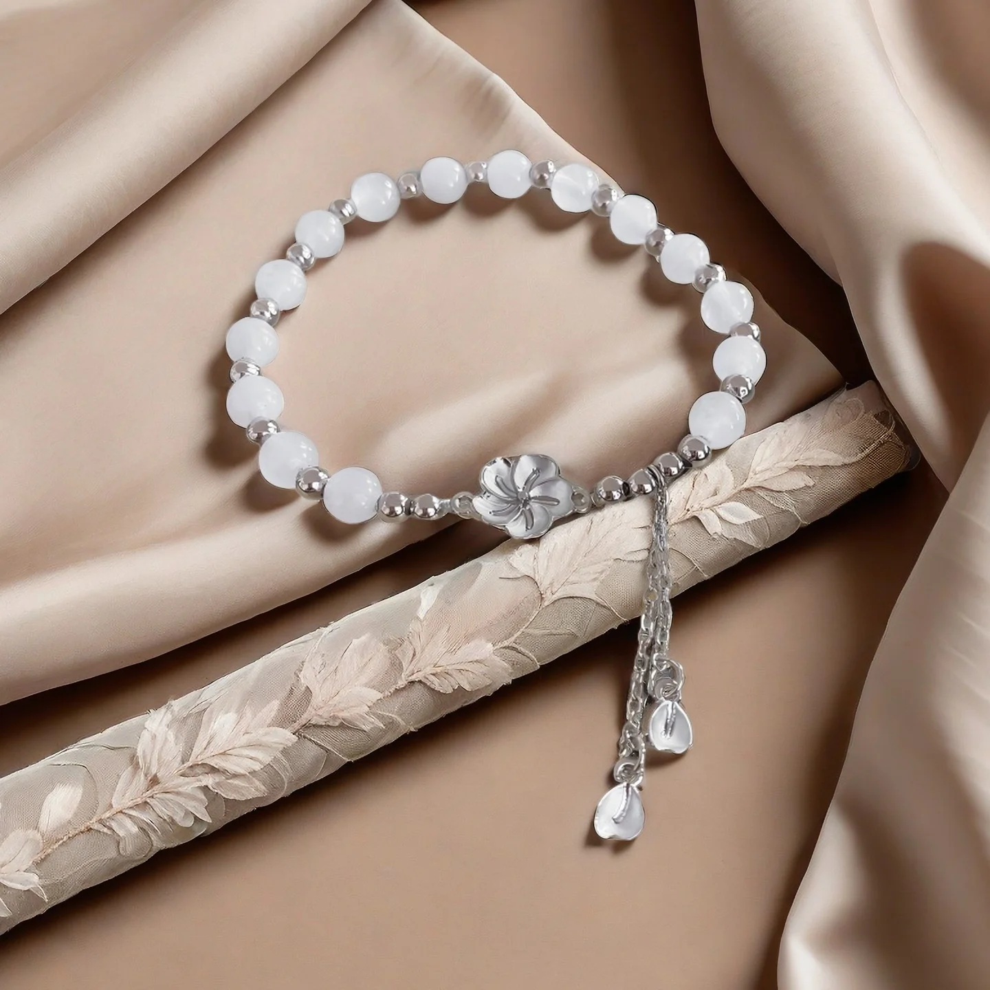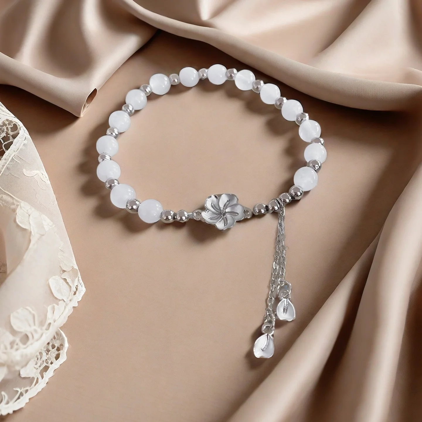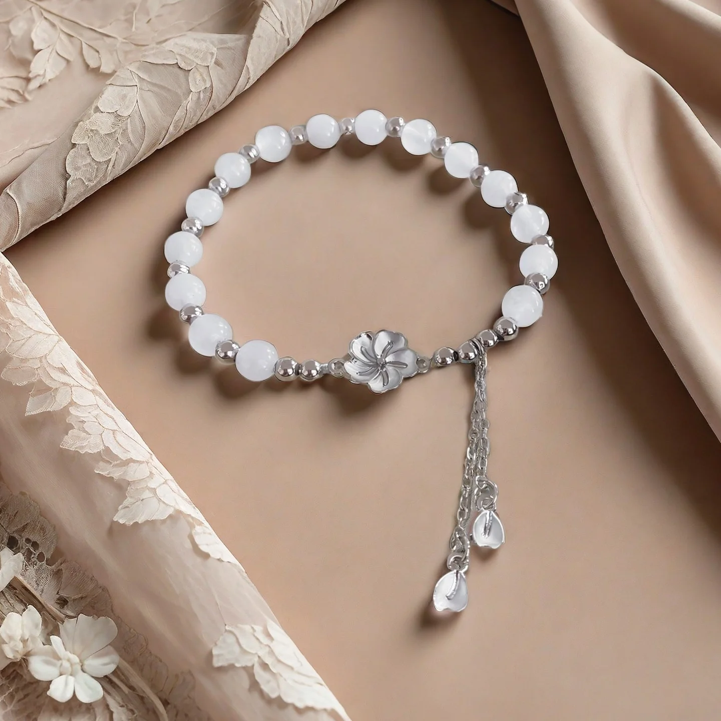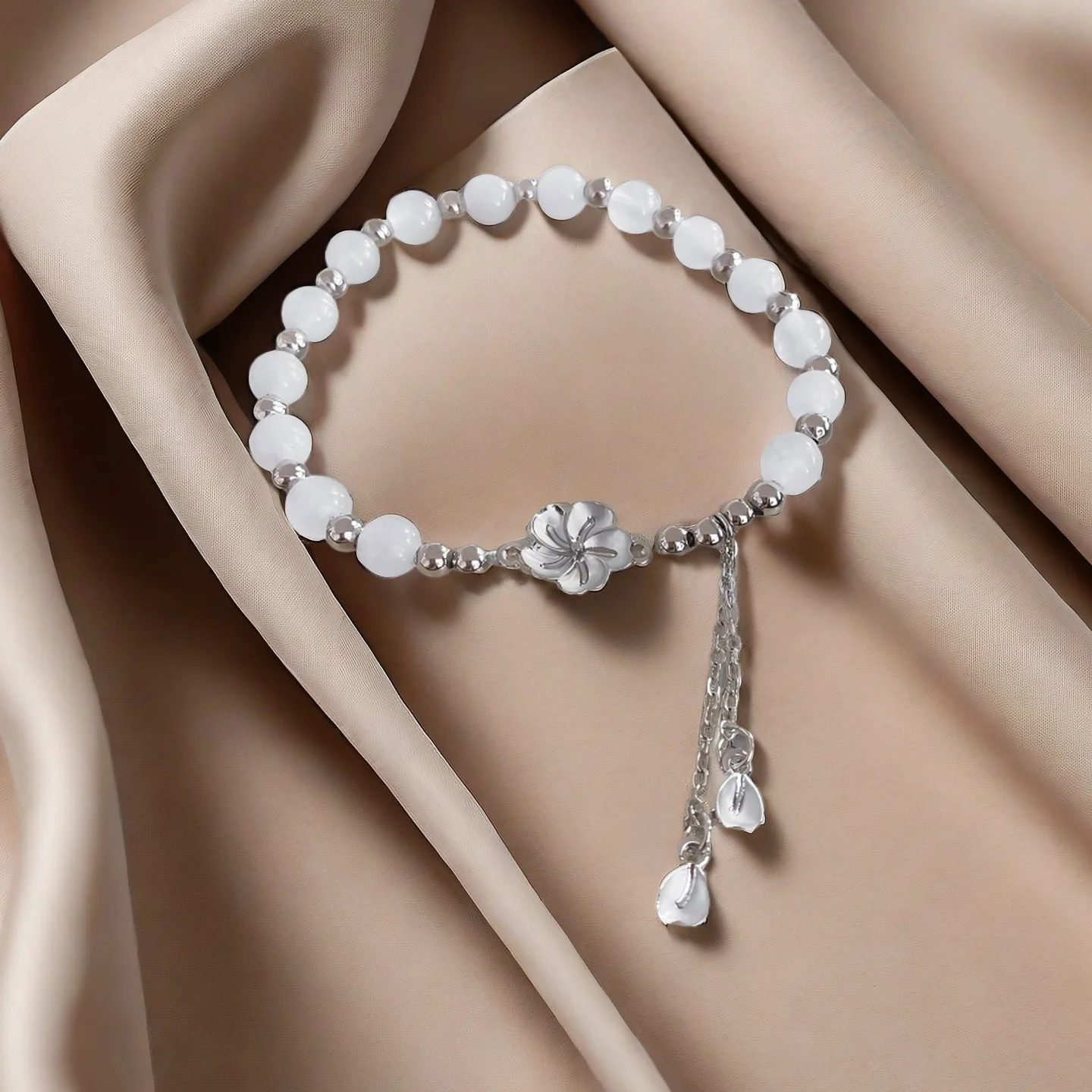 Elegant White Beaded Bracelet with Silver Flower Petal Tassel Charm Fashionable Women's Jewelry Perfect for Daily Wear Gifting