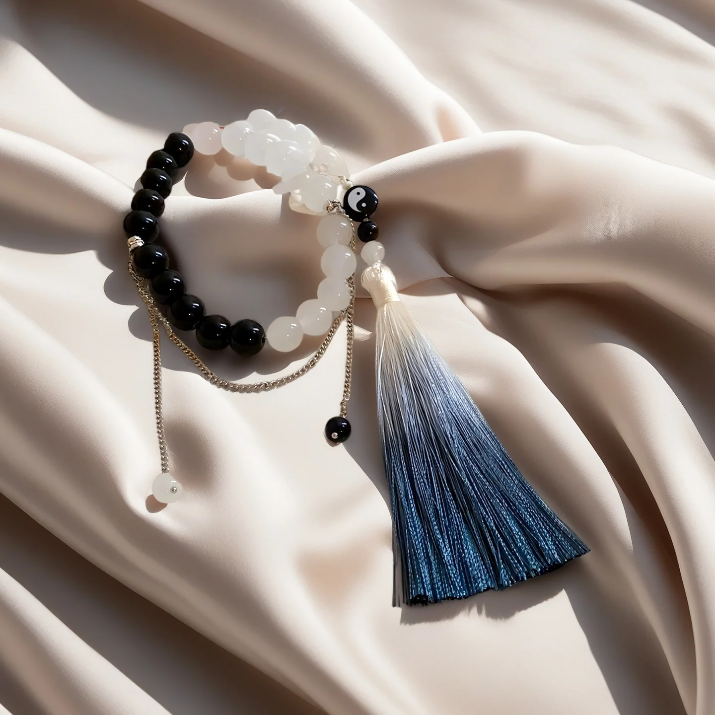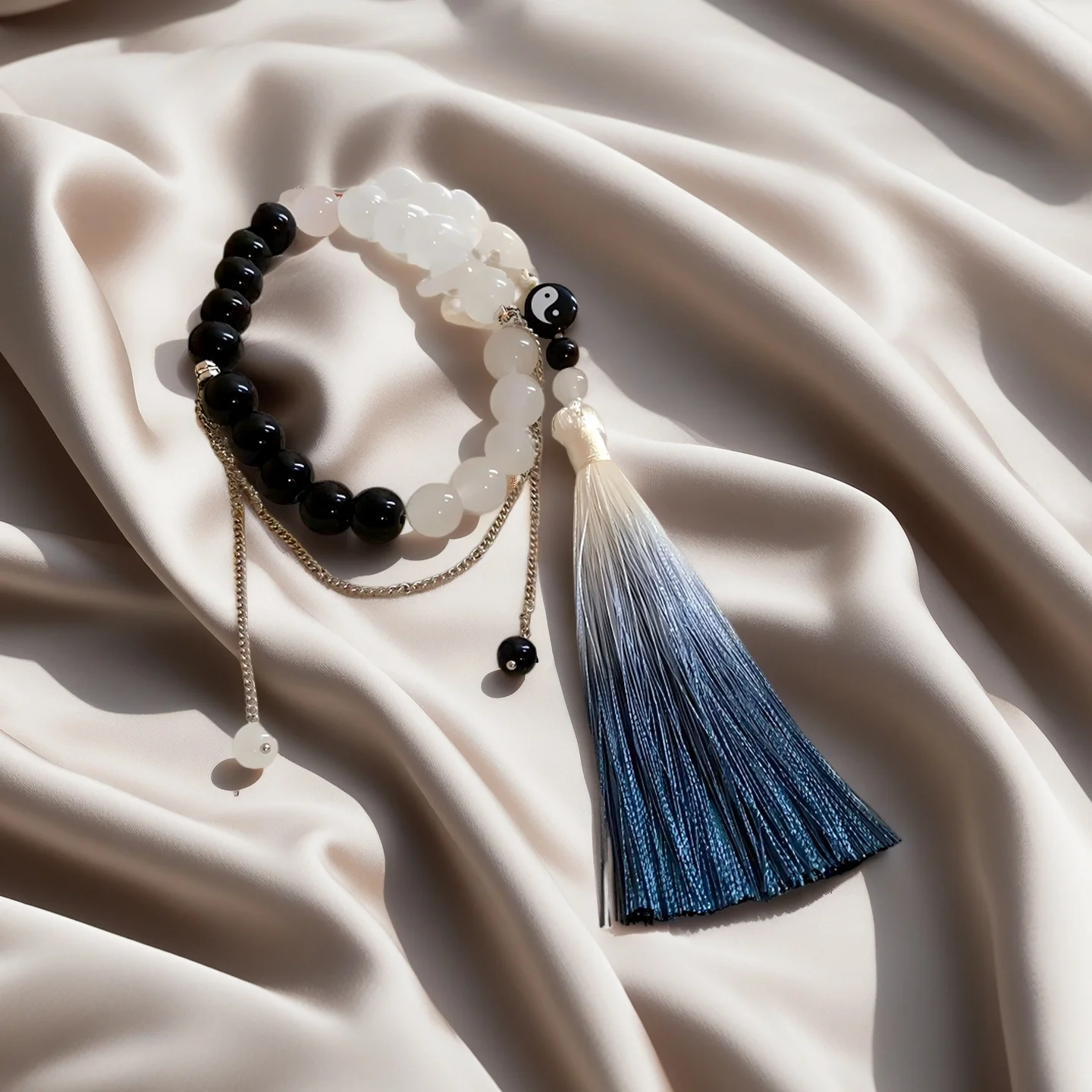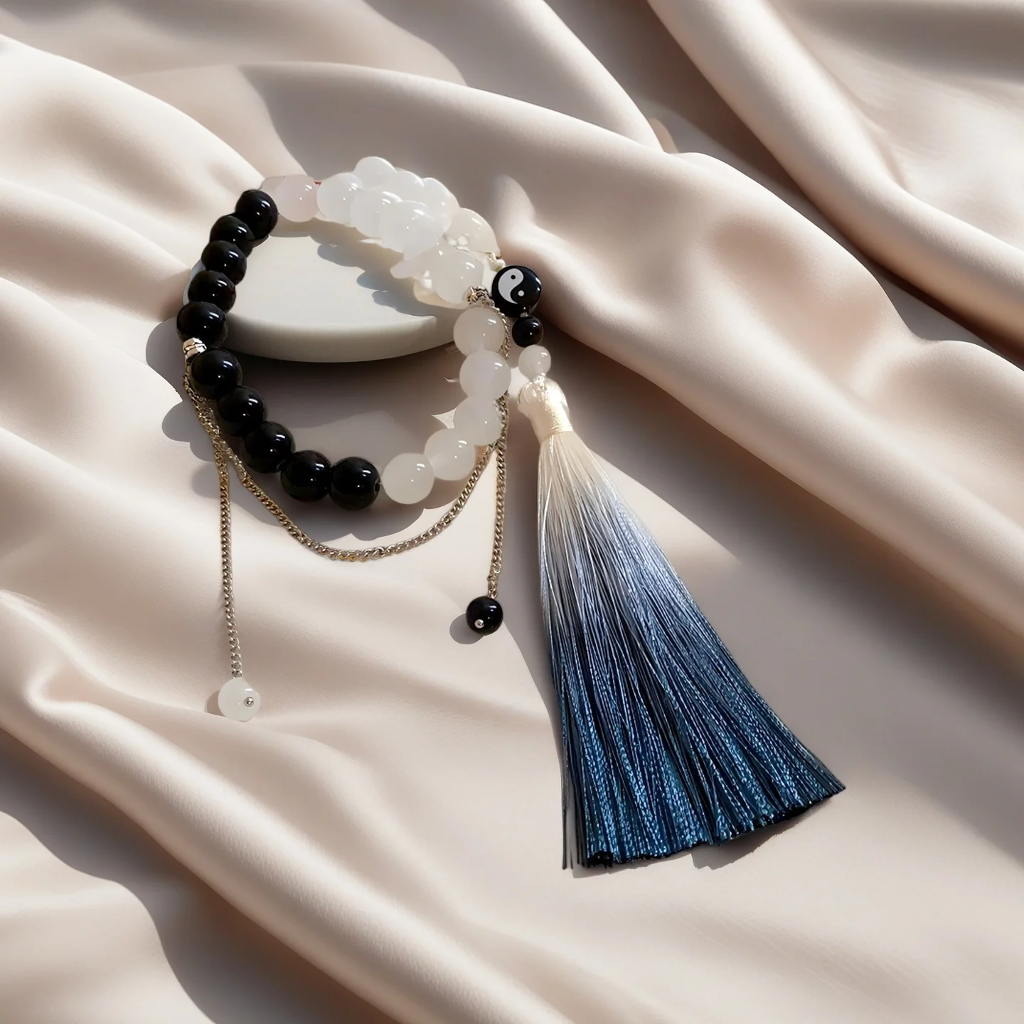Yin Yang Style Beaded Bracelet with Gradient Tassel Black White Bead Bracelet Unique Chinese Style Jewelry for Women Gift