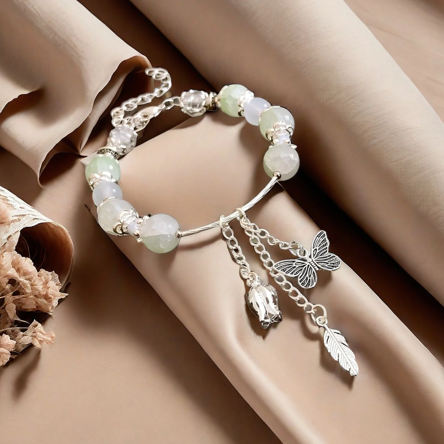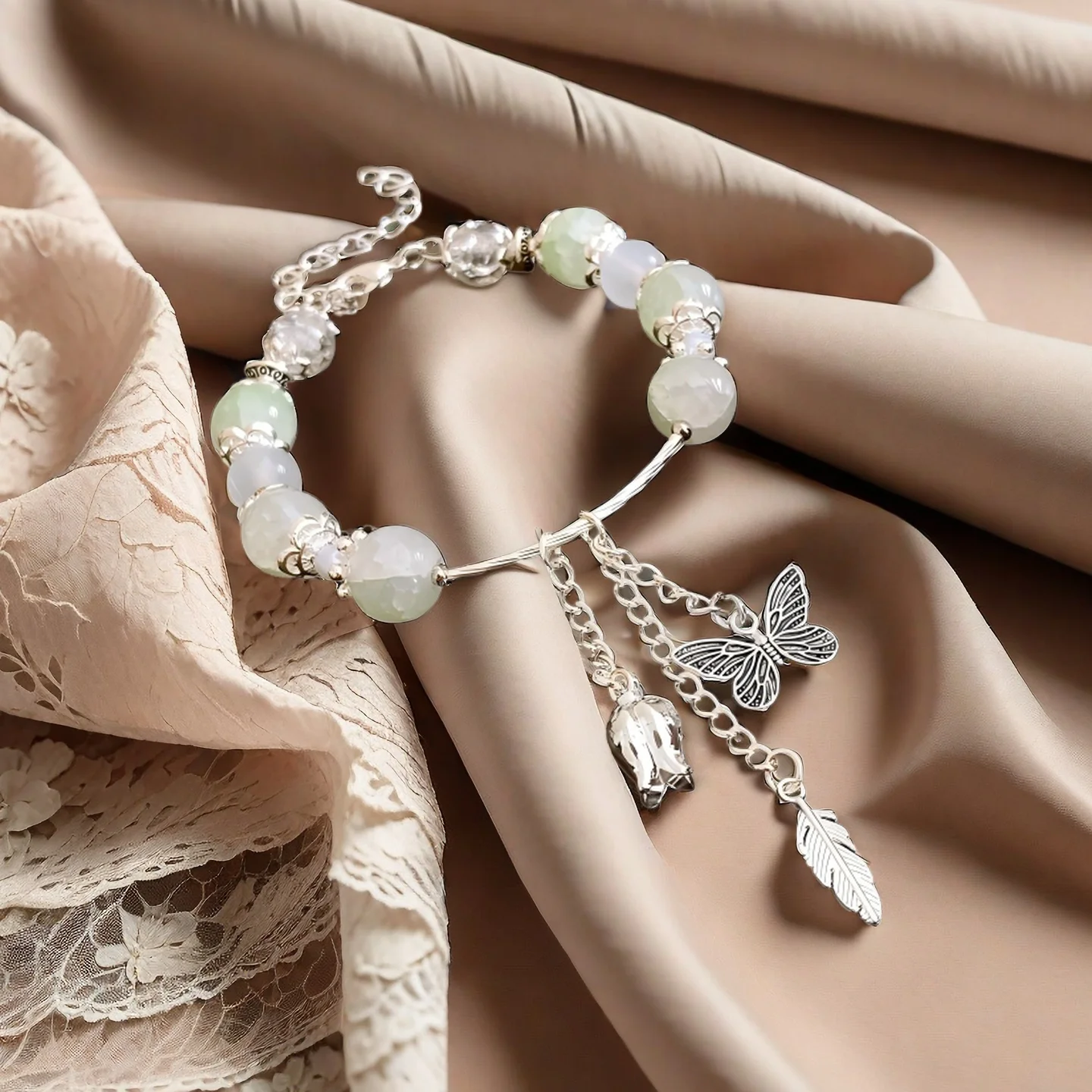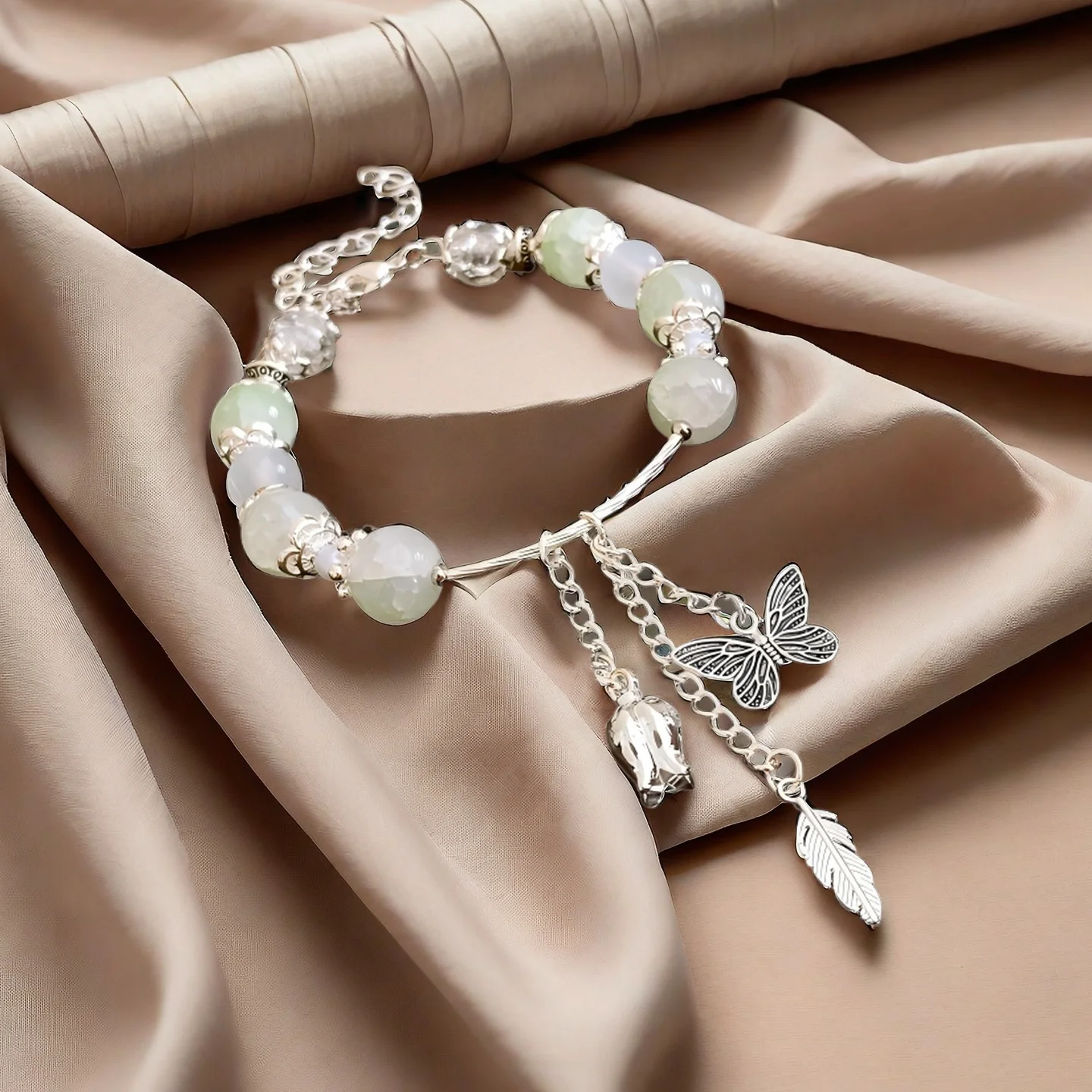 Elegant Bracelet with Light Green Jade Beads Butterfly Bell Feather Charms Unique Handmade Jewelry for Women Daily Wear Gifting