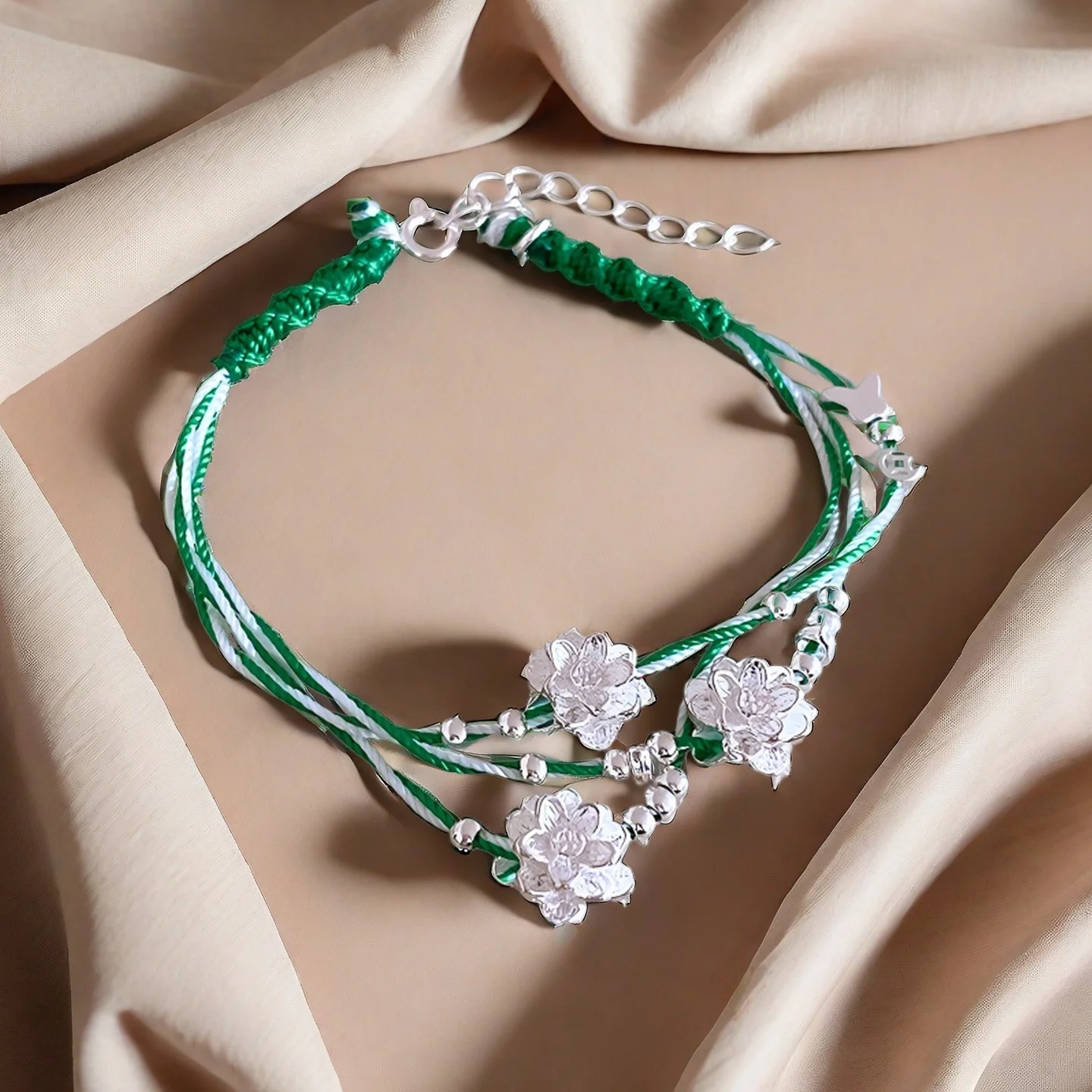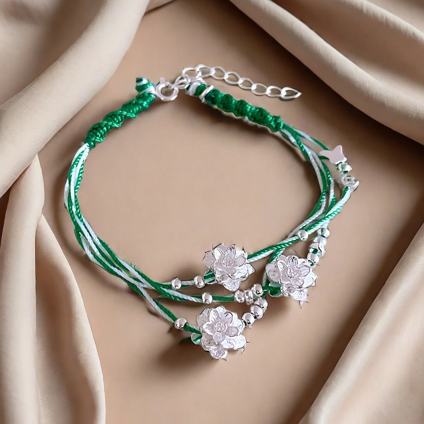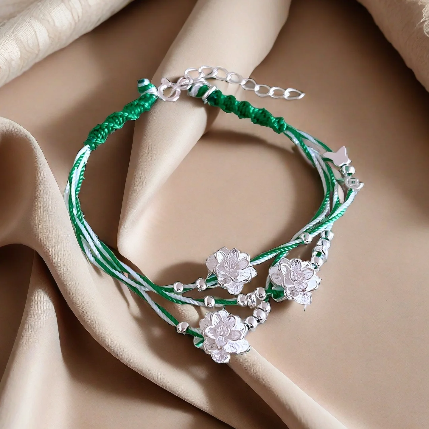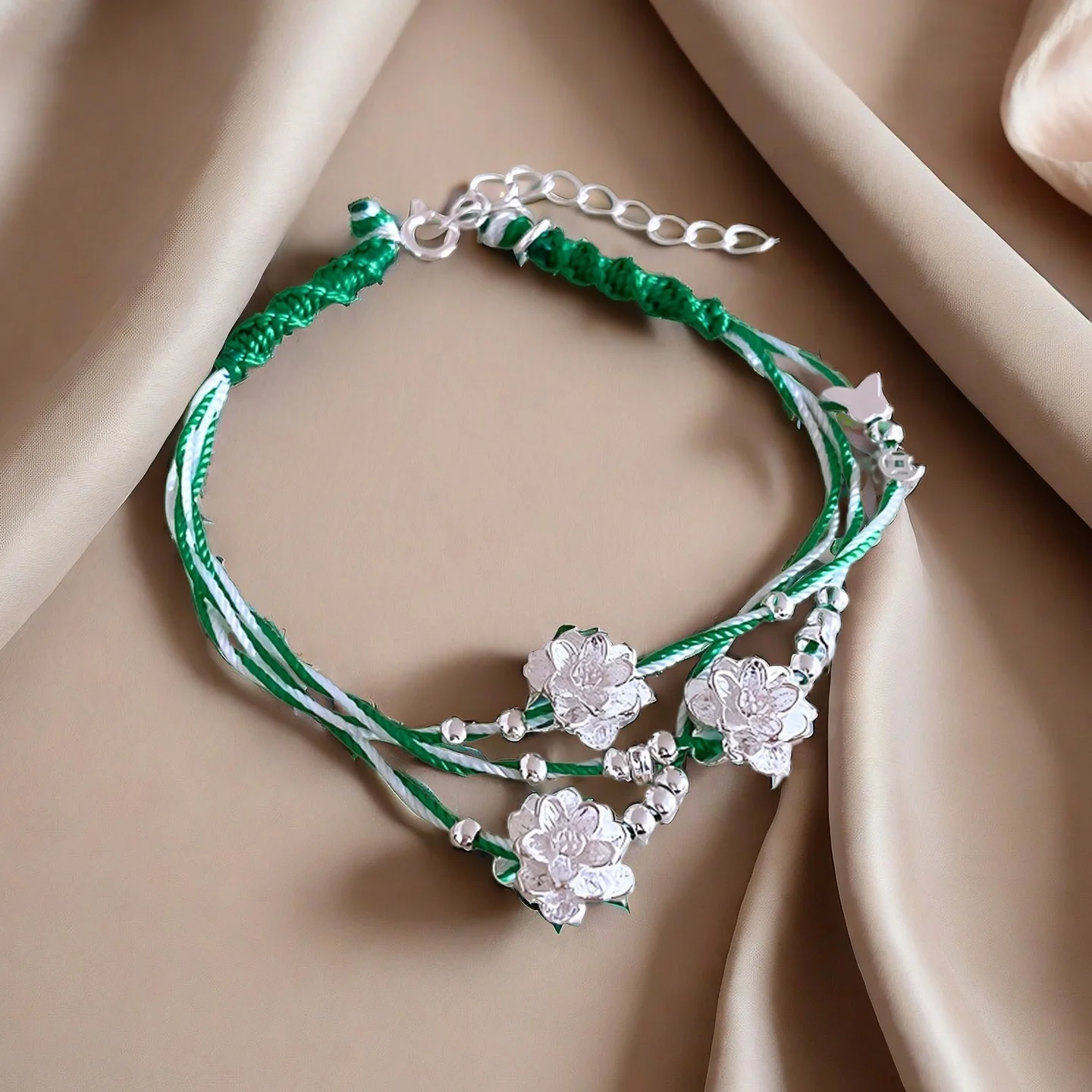 Handmade Braided Bracelet with Silver Flower Charms Green White Thread Woven Bracelet Exquisite Ethnic Style Jewelry for Women