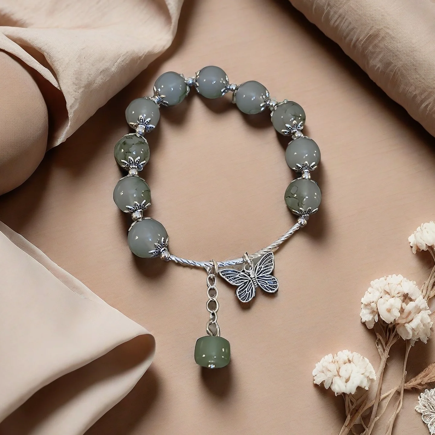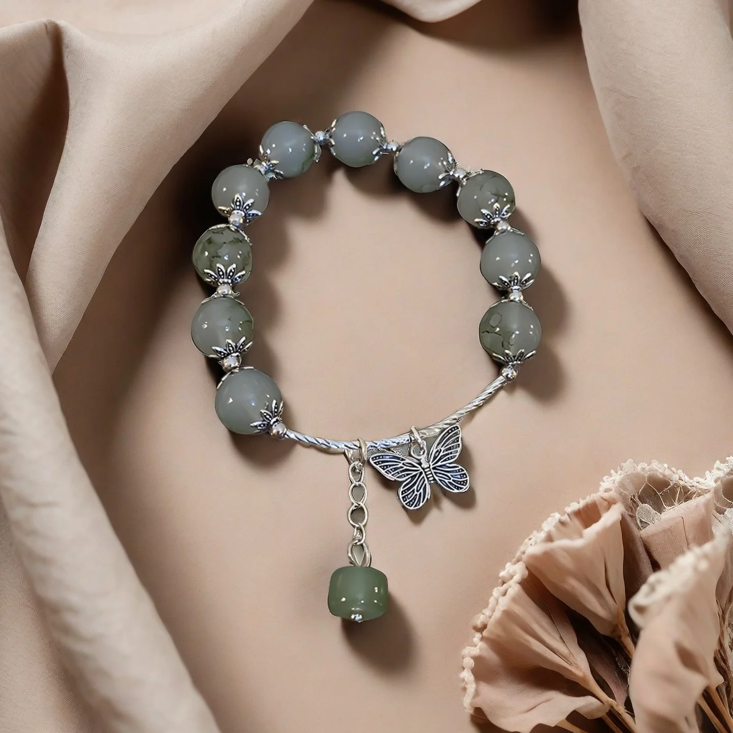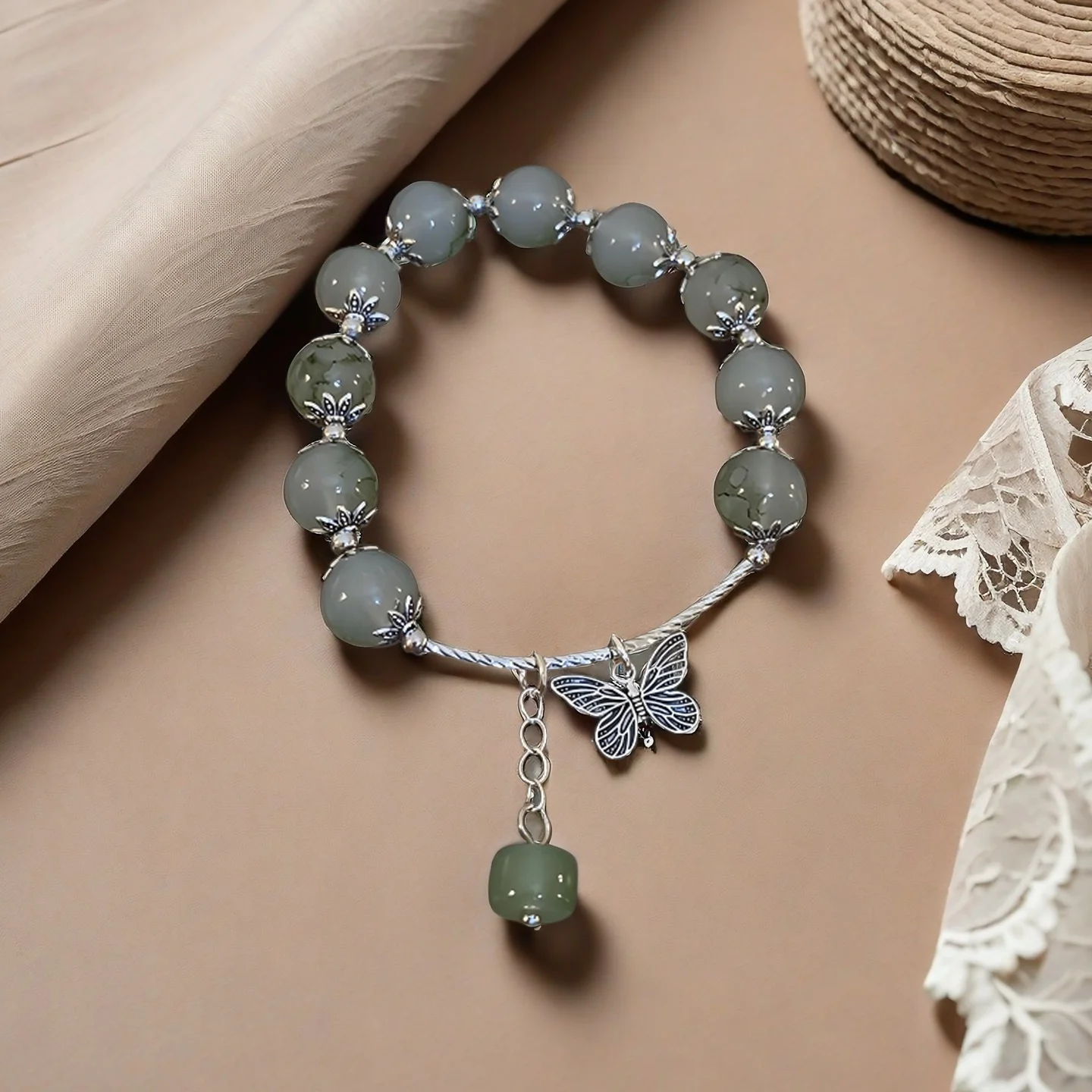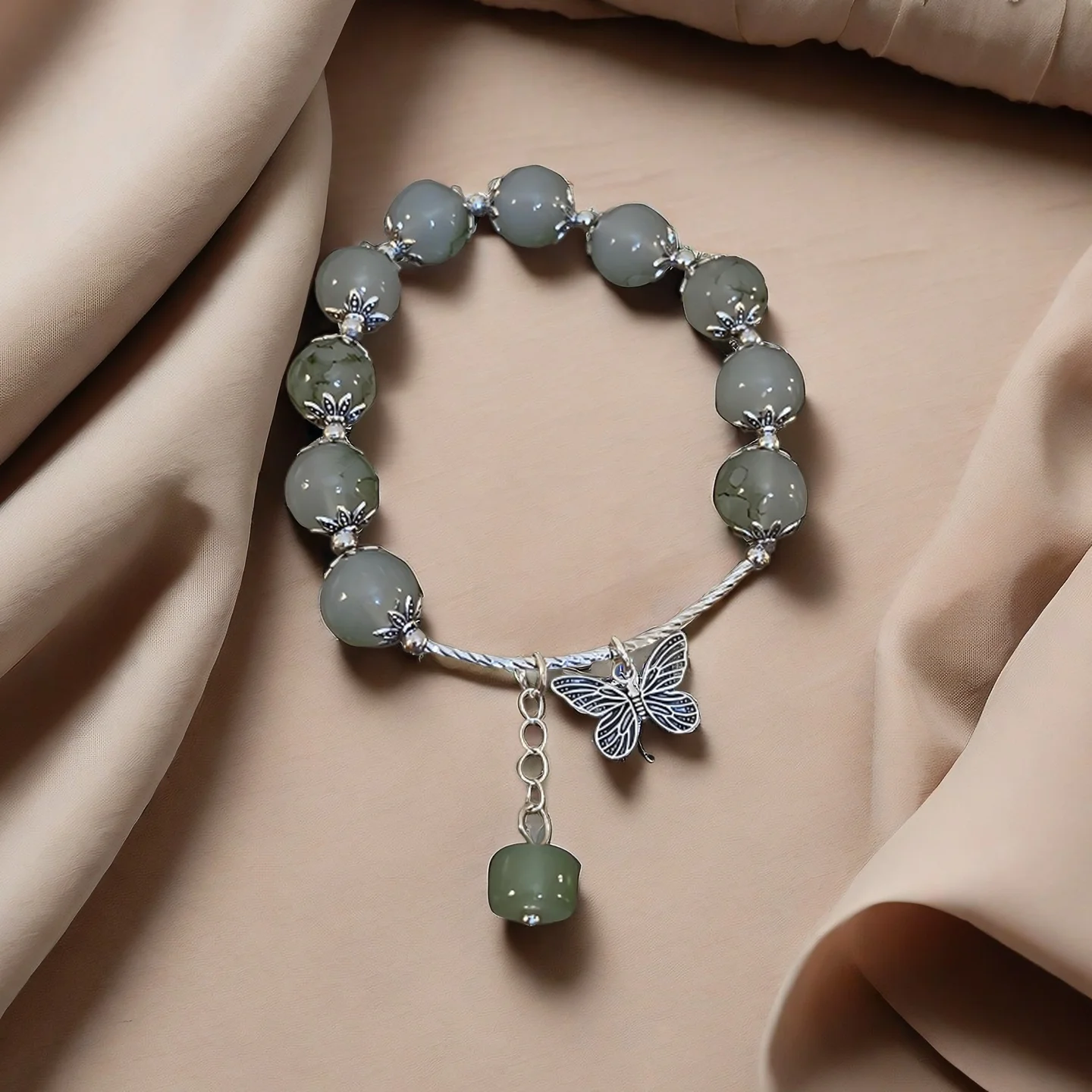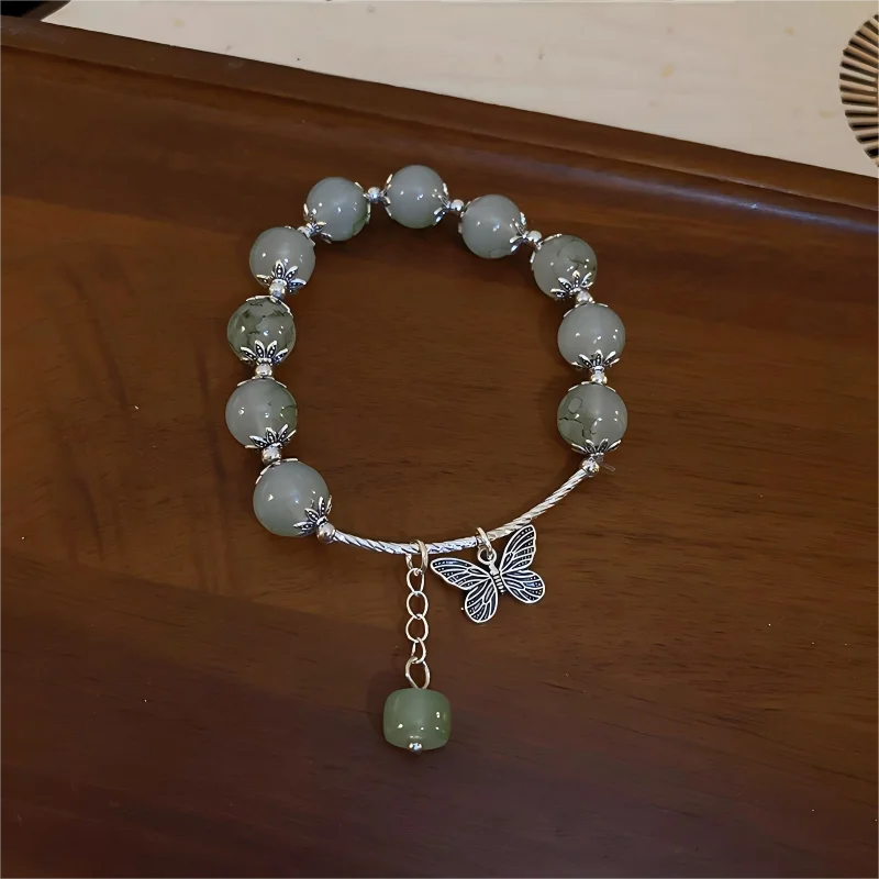 Vintage Style Beaded Bracelet with Green Beads Silver Butterfly Charm Pendant Elegant Design for Women's Daily Wear Gifts