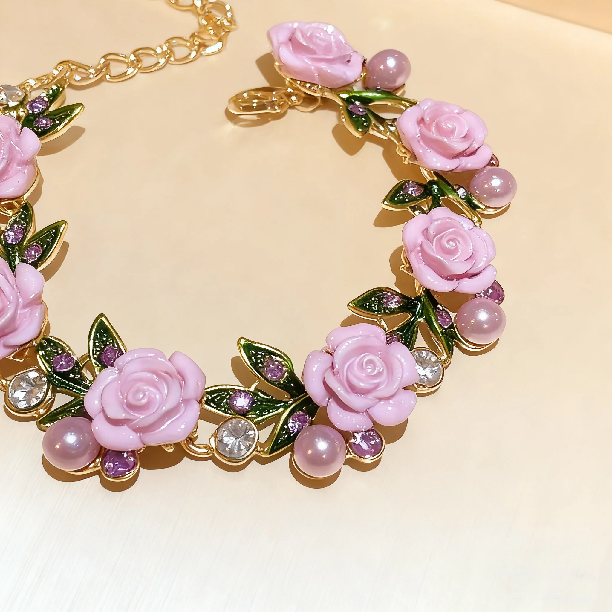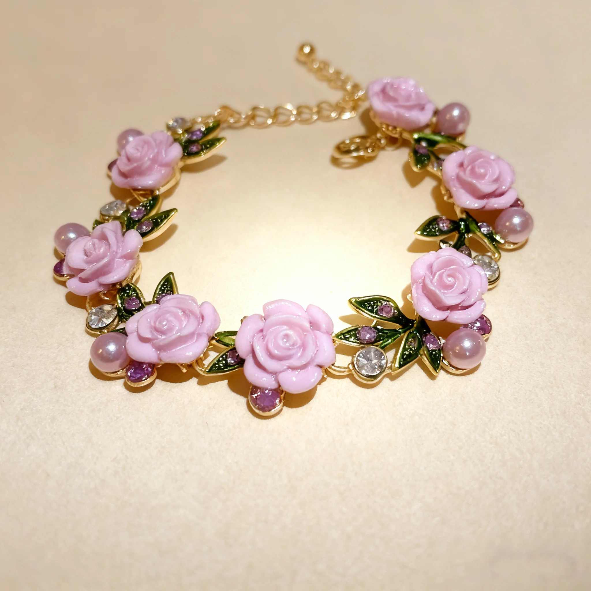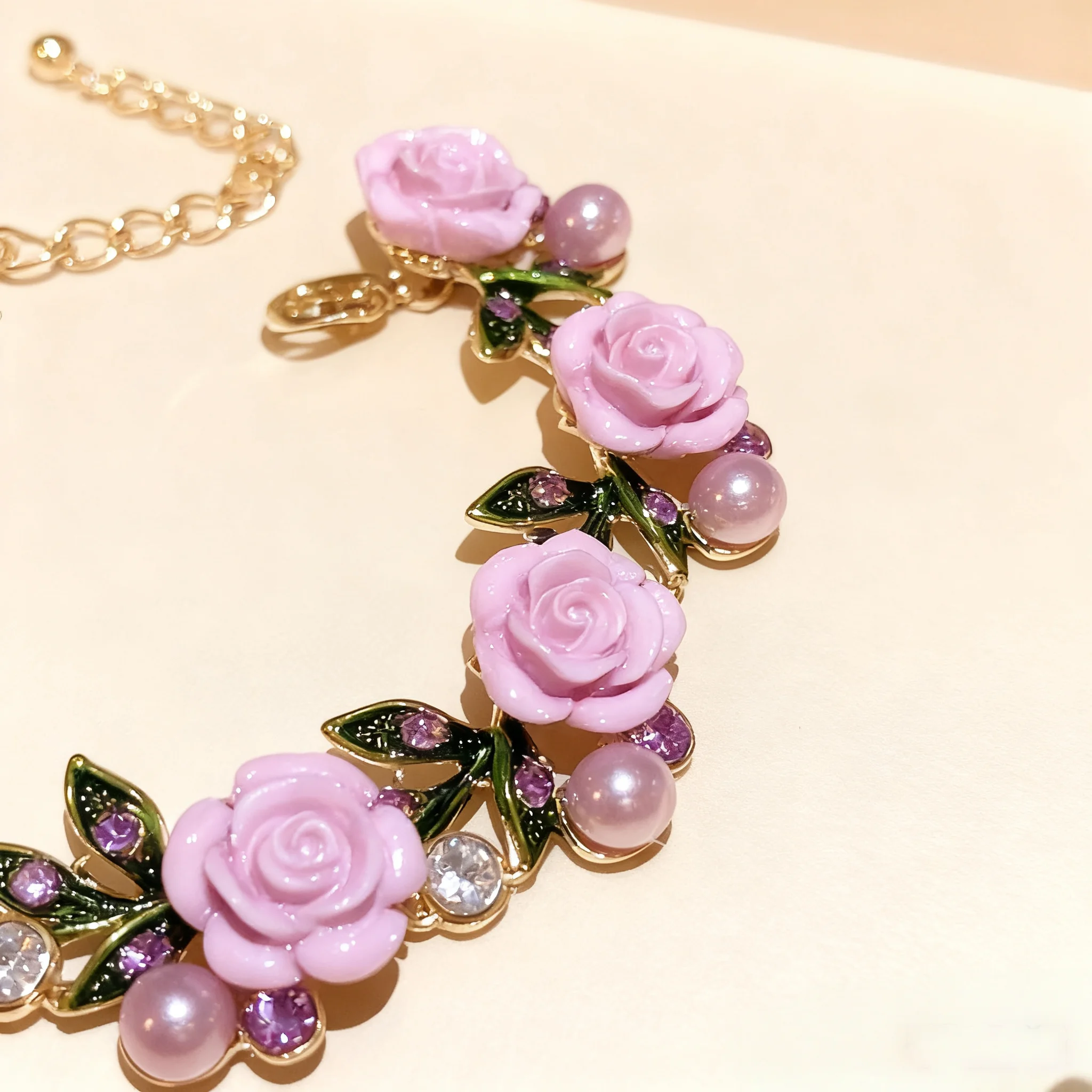Exquisite Pink Rose Bracelet with Pearls and Crystals Elegant Floral Design Jewelry for Women Parties Daily Wear