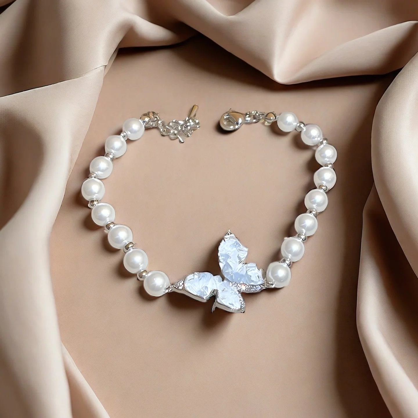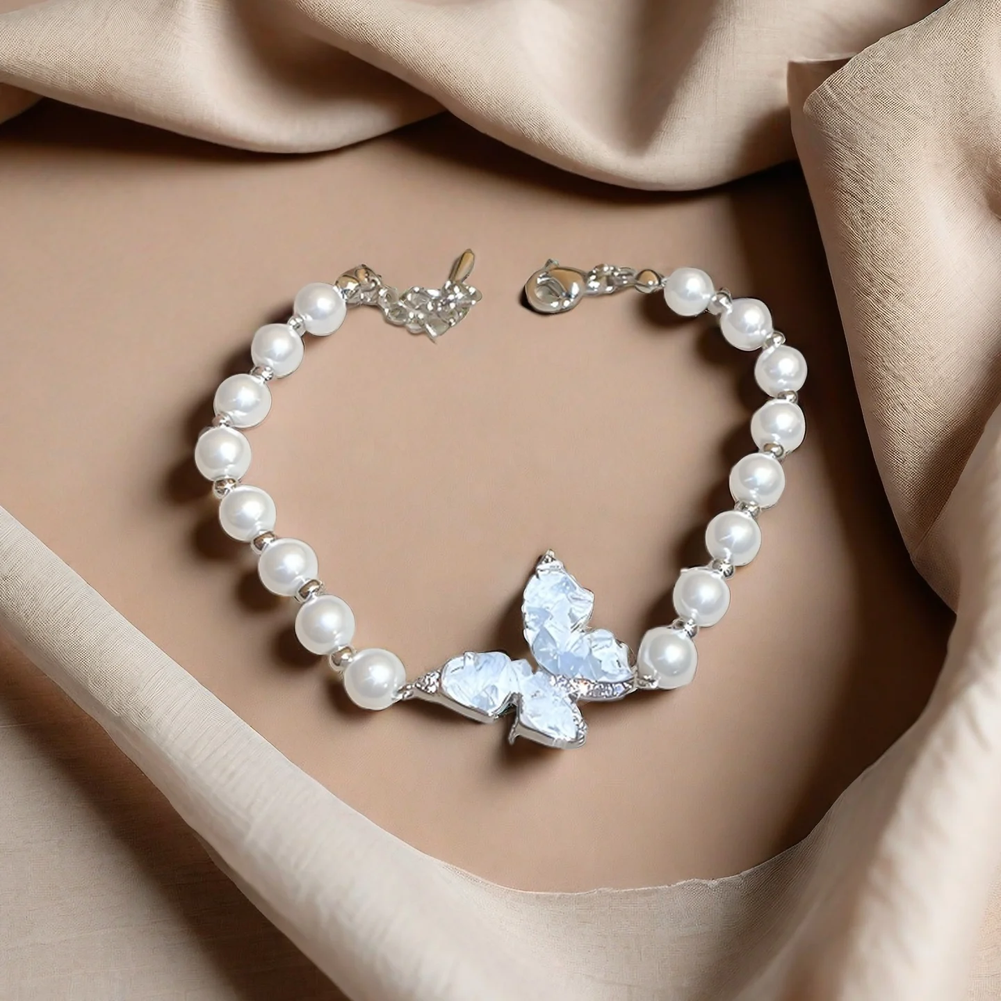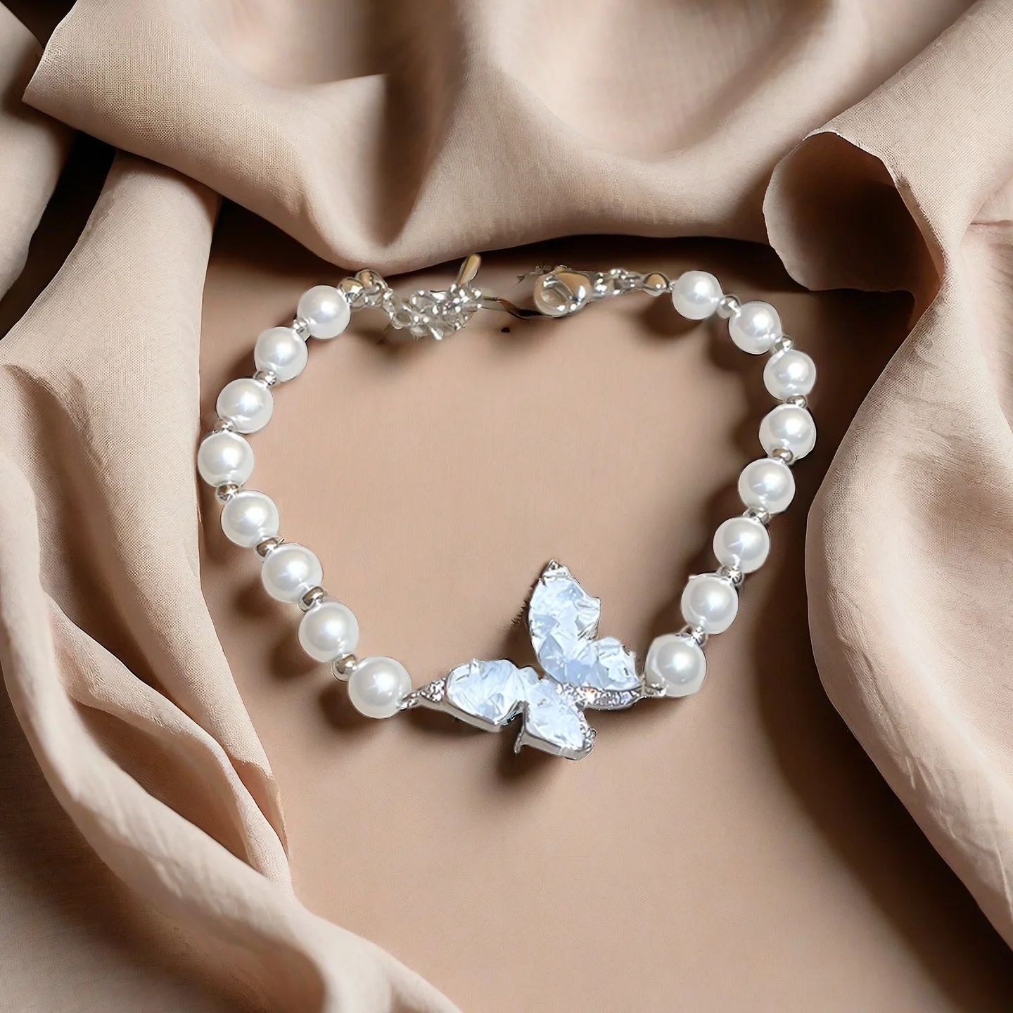 Elegant Butterfly Bracelet with Simulated Pearls Crystal Inlays Fashionable Silver Tone Charm Bracelet Women's Delicate Jewelry