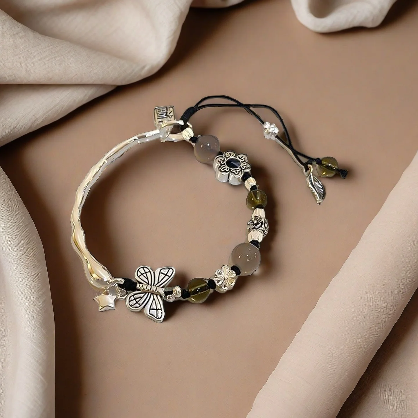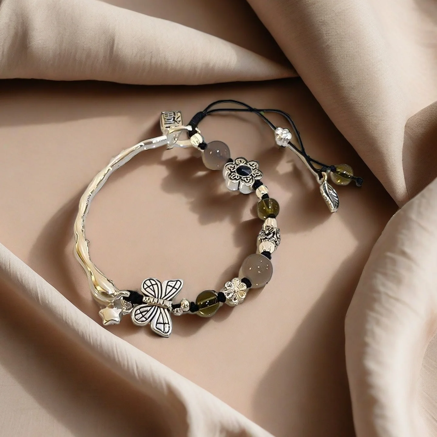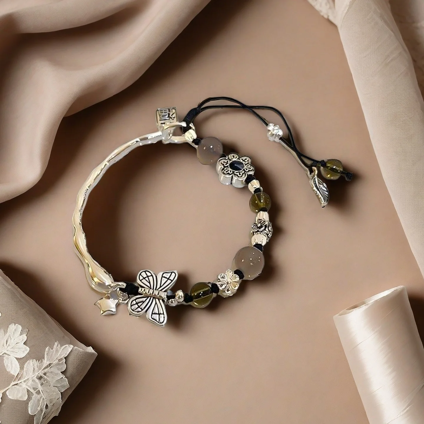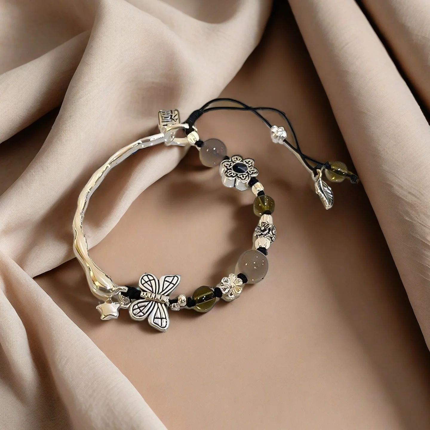 Vintage Style Silver Tone Bracelet with Butterfly Flower Charms Colored Beads Adjustable Boho Bracelet Women's Fashion Jewelry
