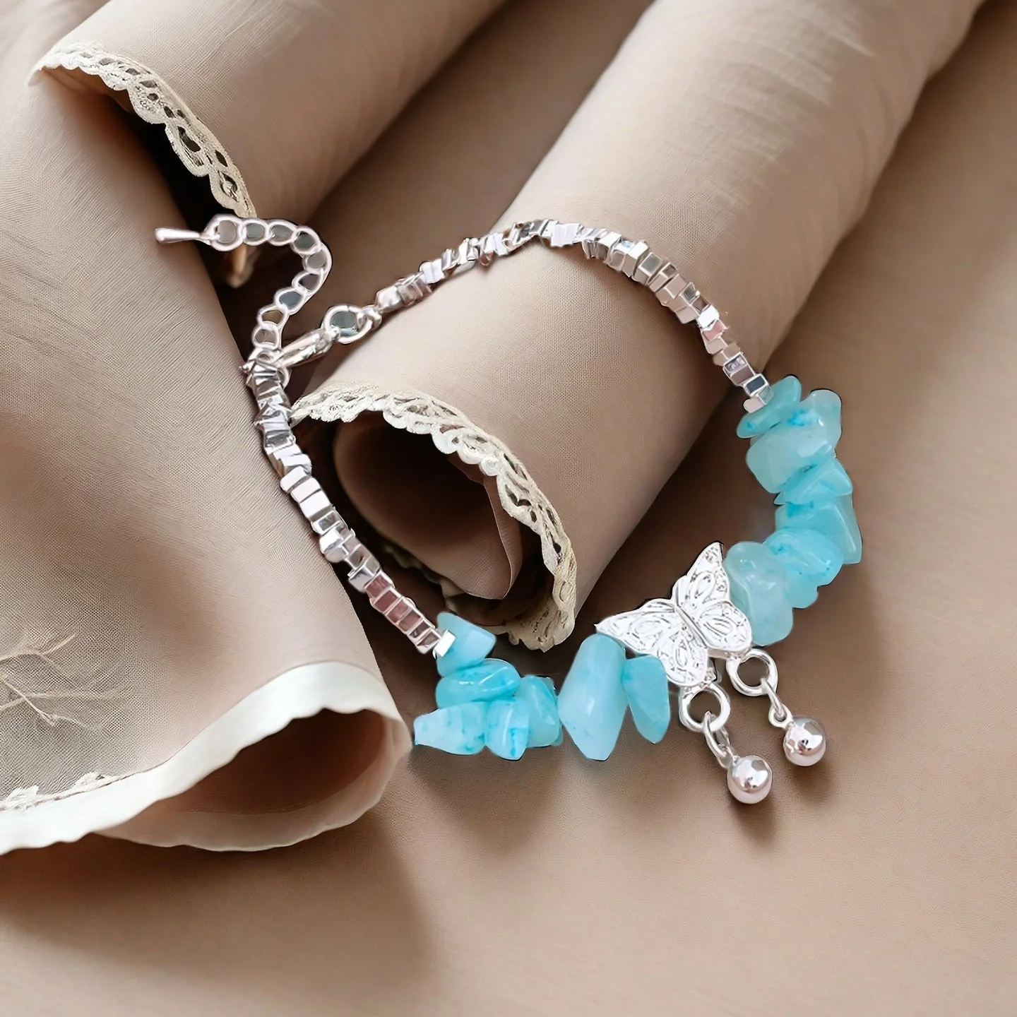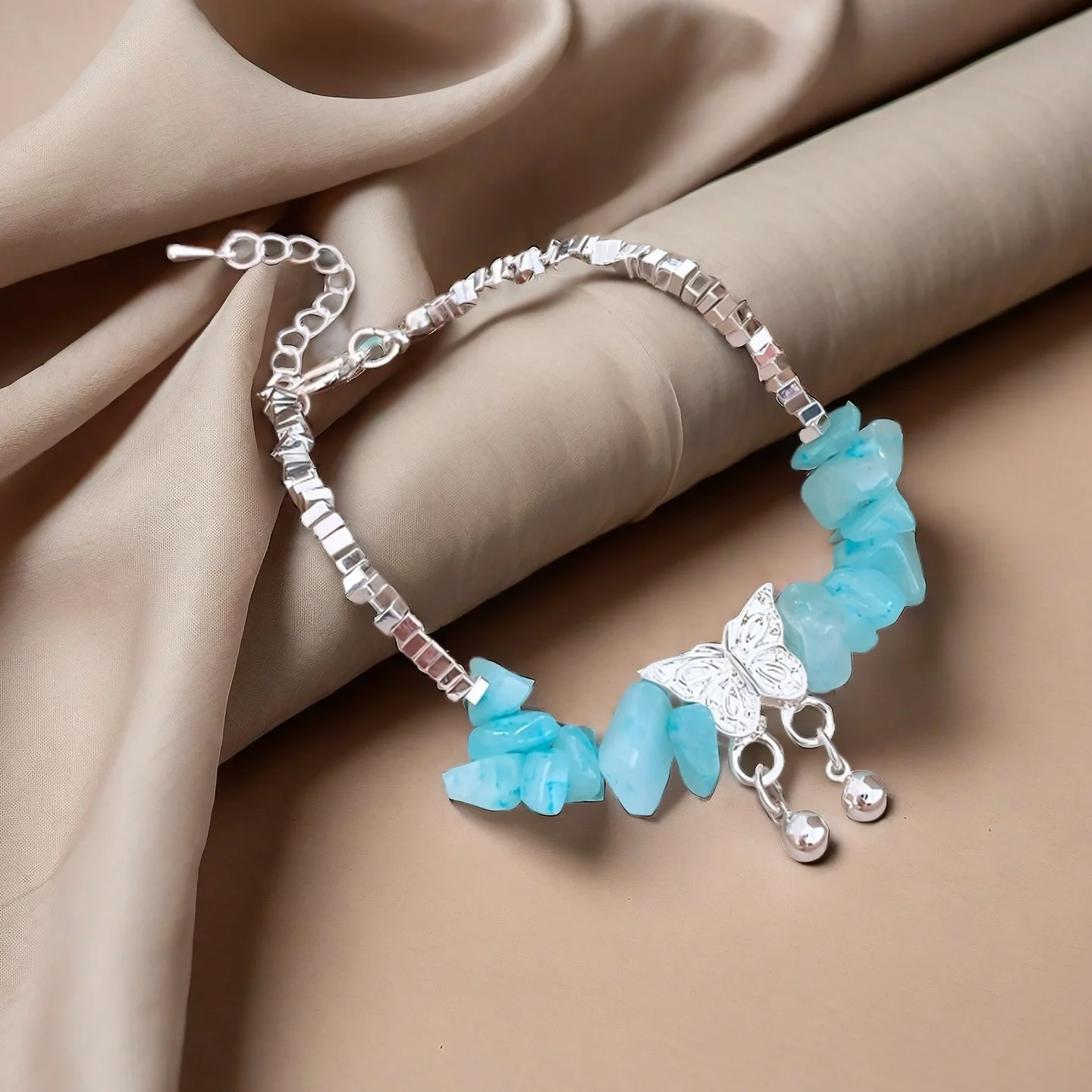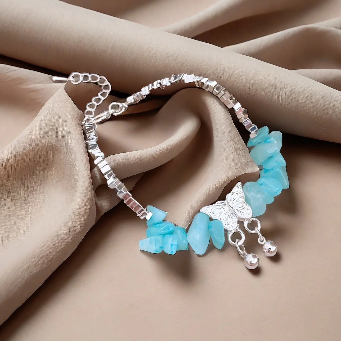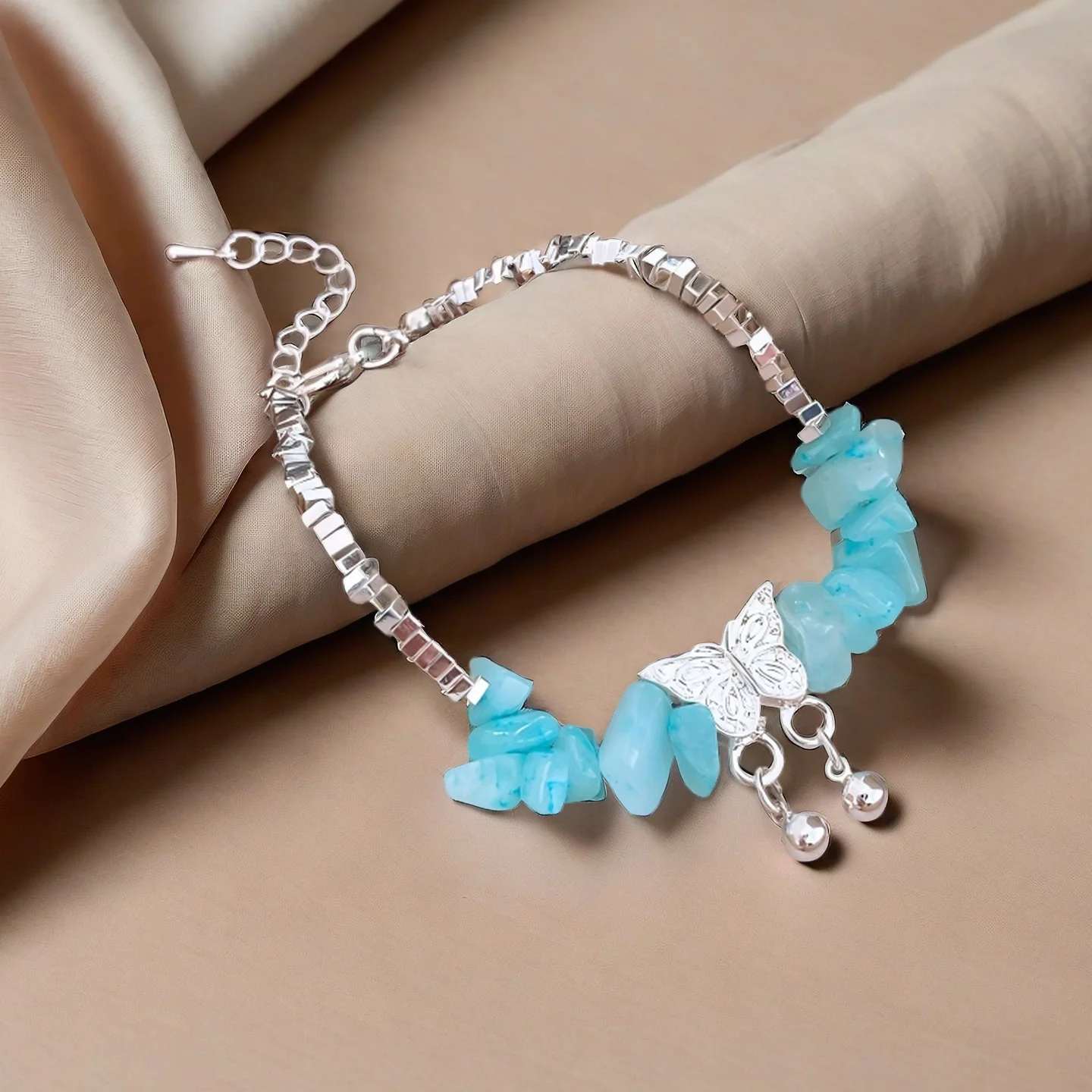 Bohemian Style Blue Stone Beaded Bracelet with Silver Butterfly Bell Charms Handmade Adjustable Women Elegant Jewelry Gift