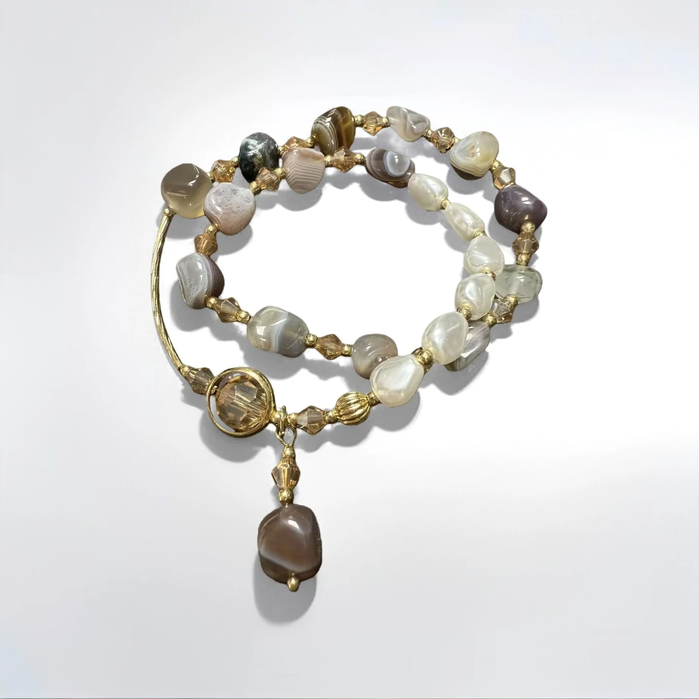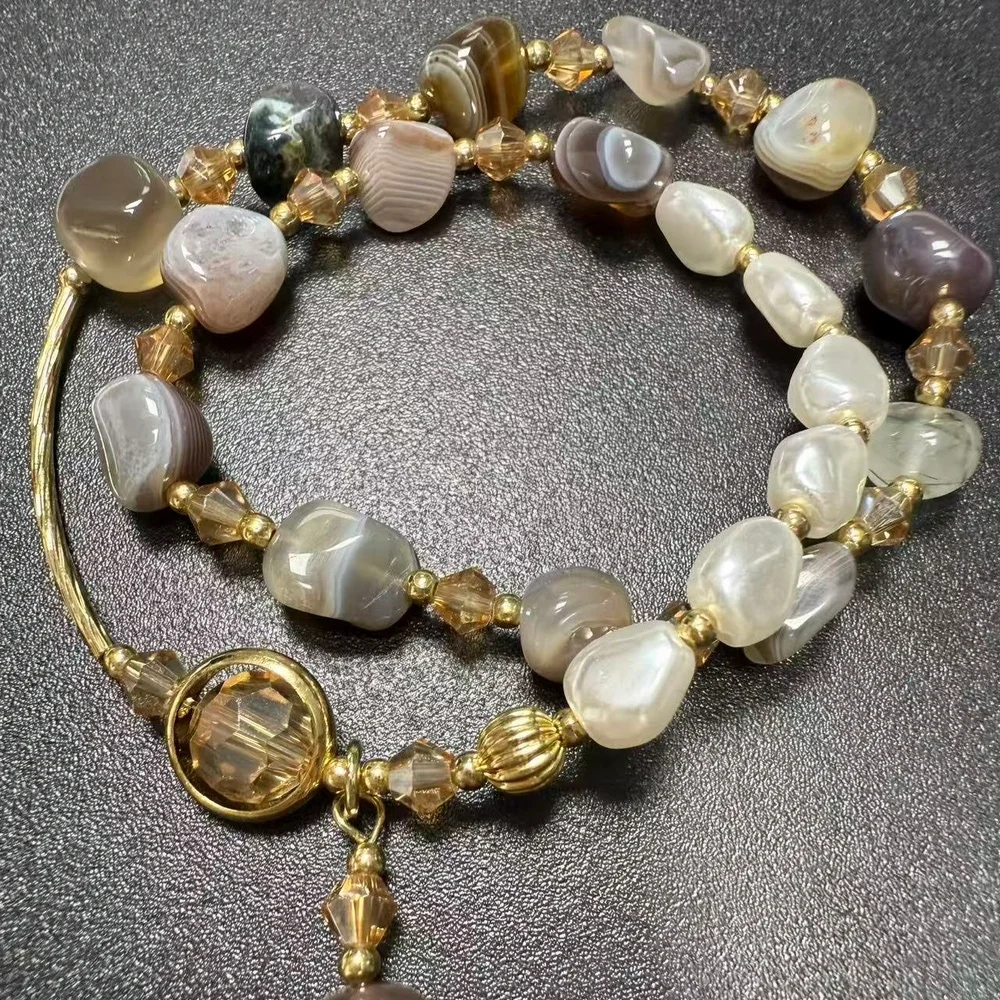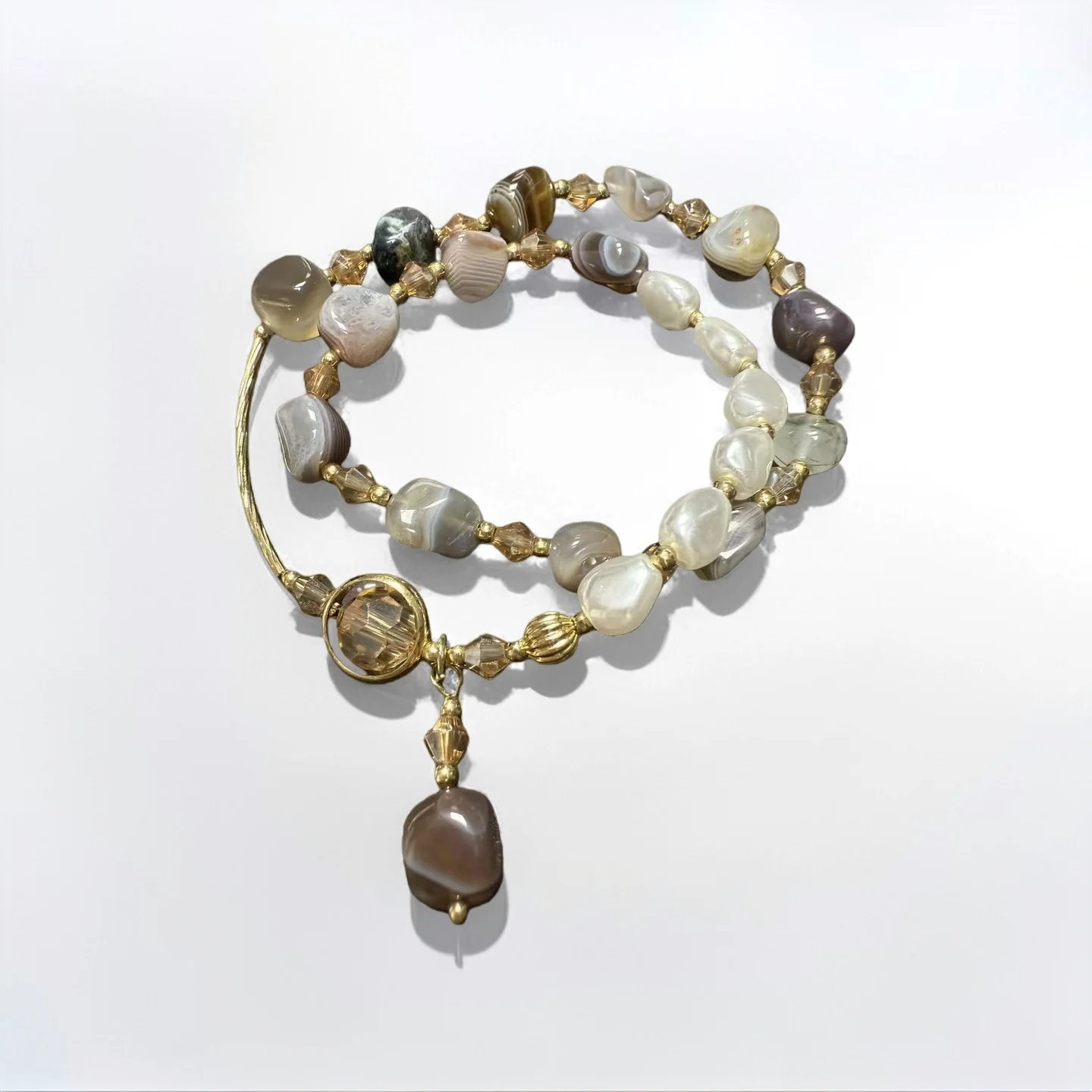 Handmade Natural Agate Pearl Beaded Bracelet with Gold Tone Accents Unique Irregular Stone Design Vintage Inspired Statement