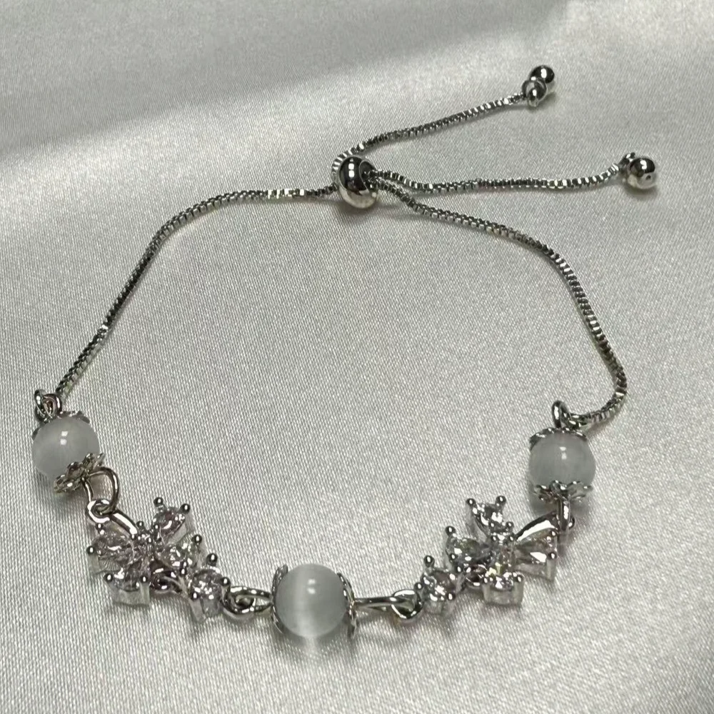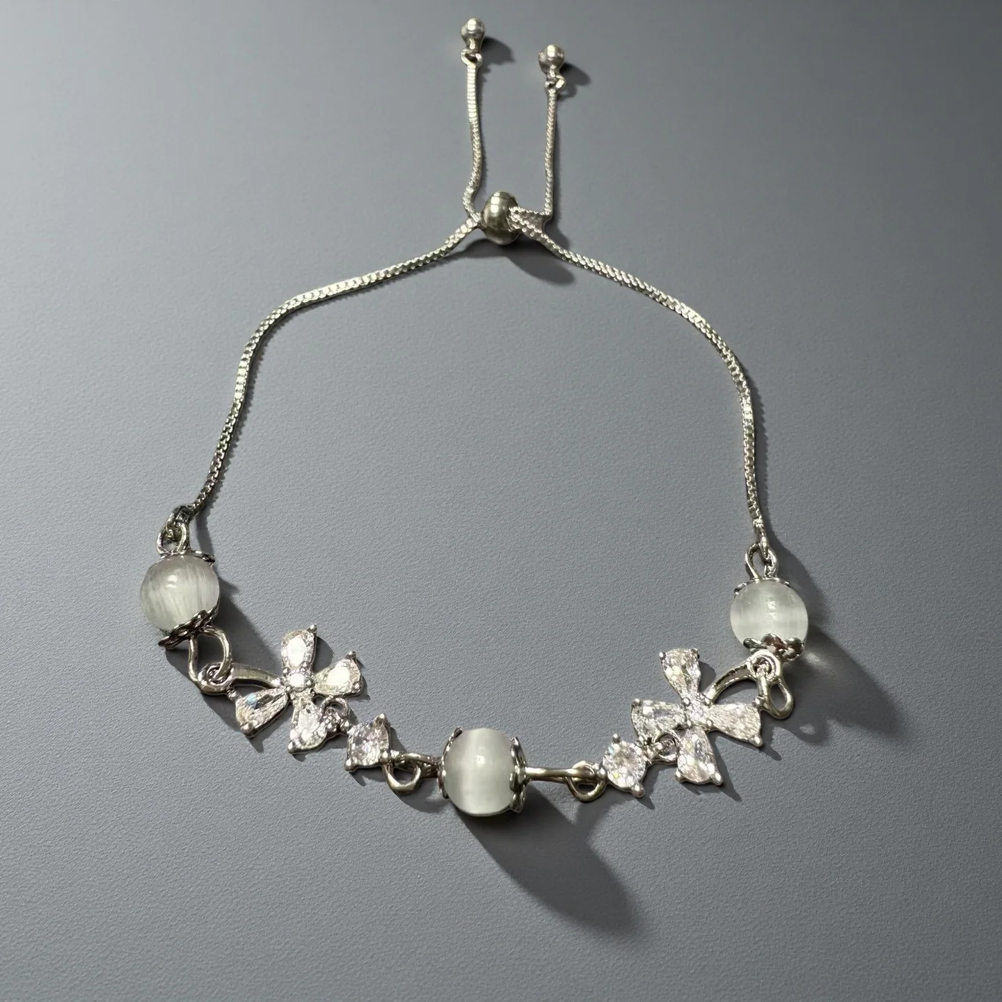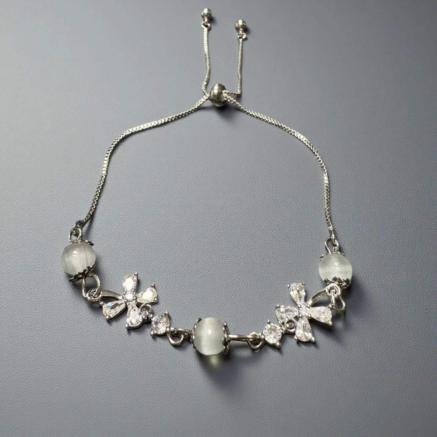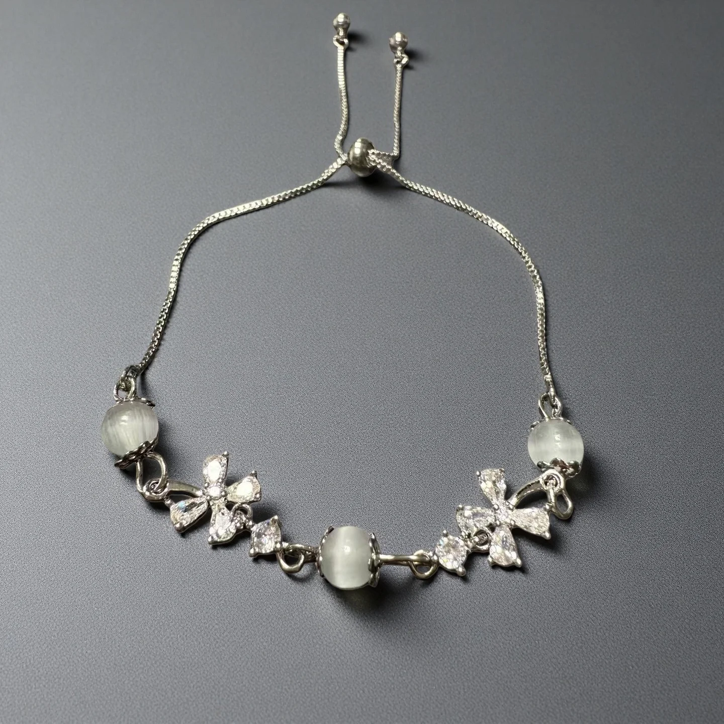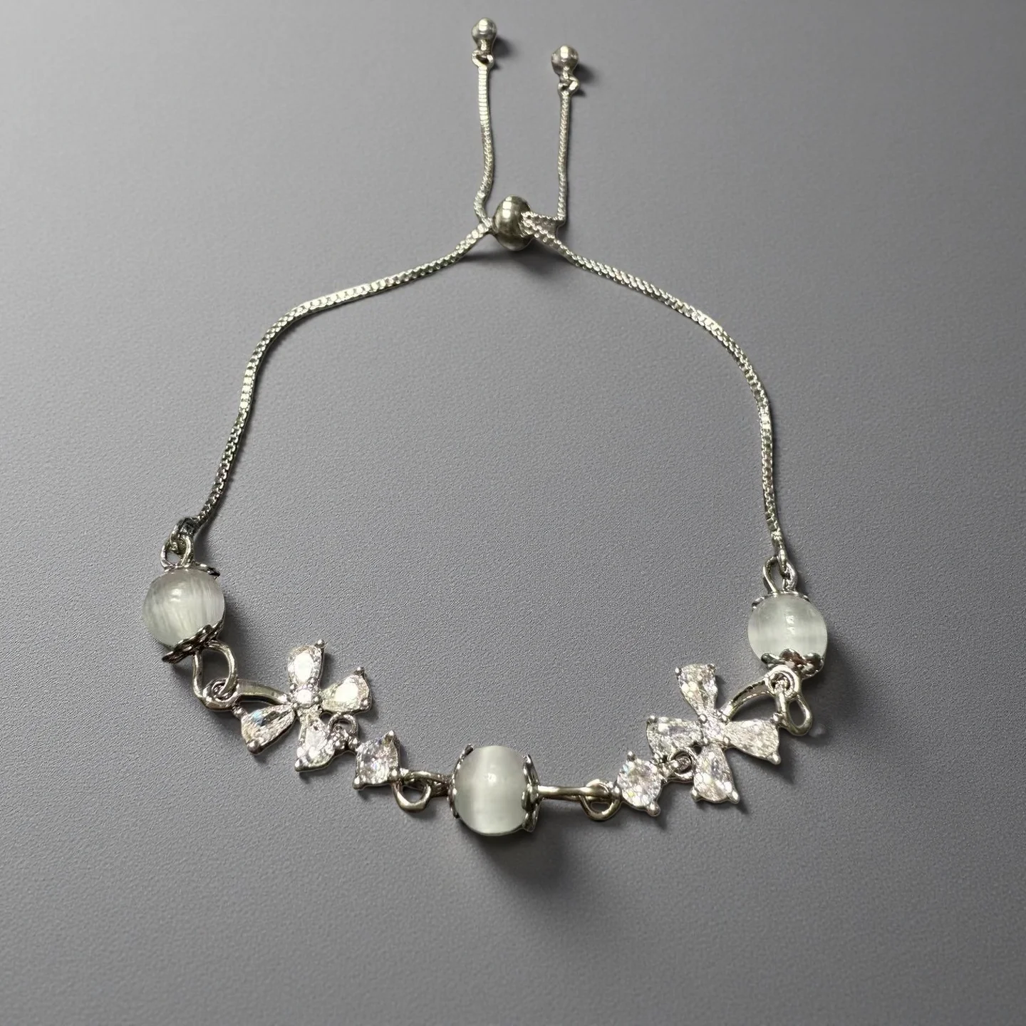 Women Adjustable Silver Tone Bracelet with Cat's Eye Beads Zircon Butterfly Design Fashionable Dainty Jewelry Daily Wear Gift