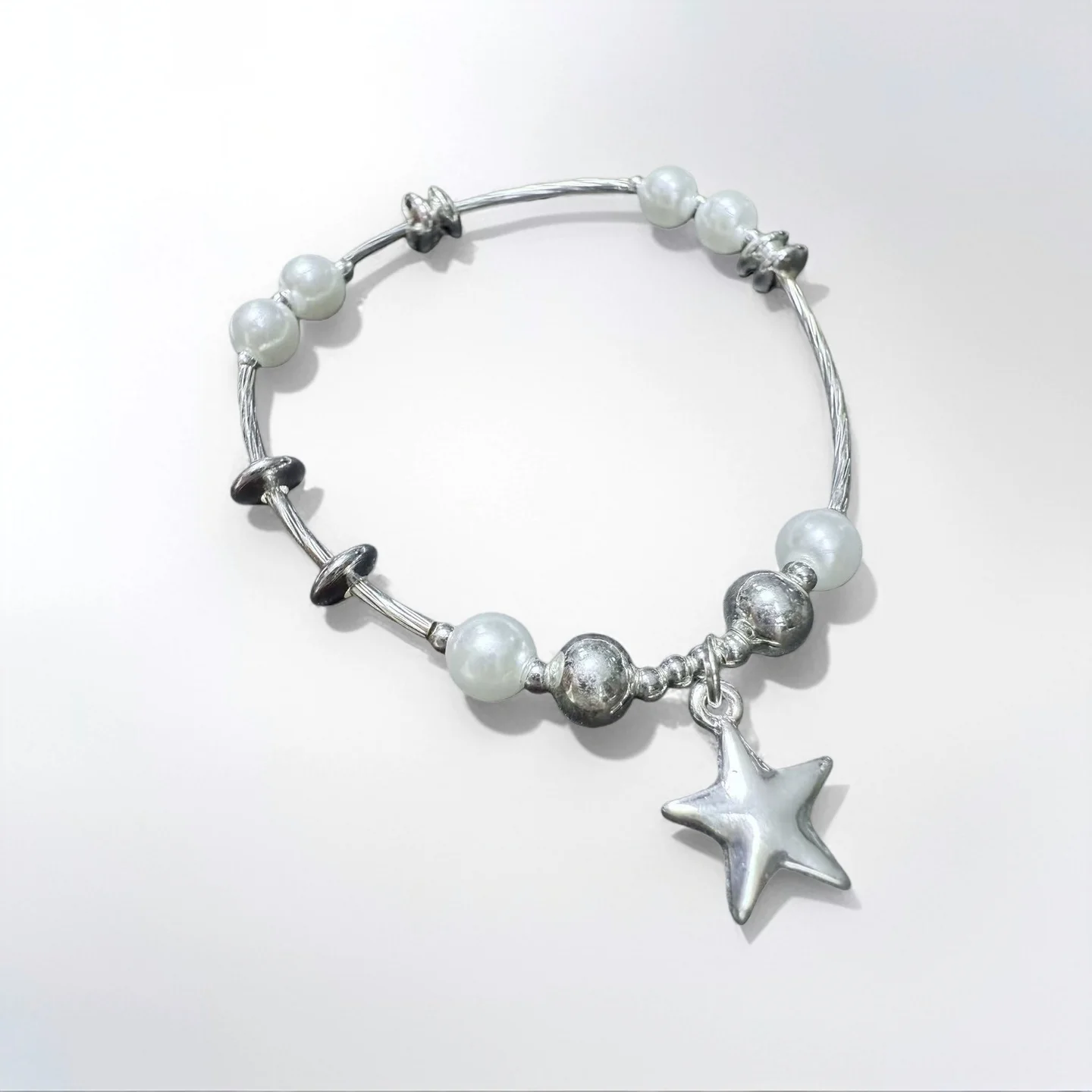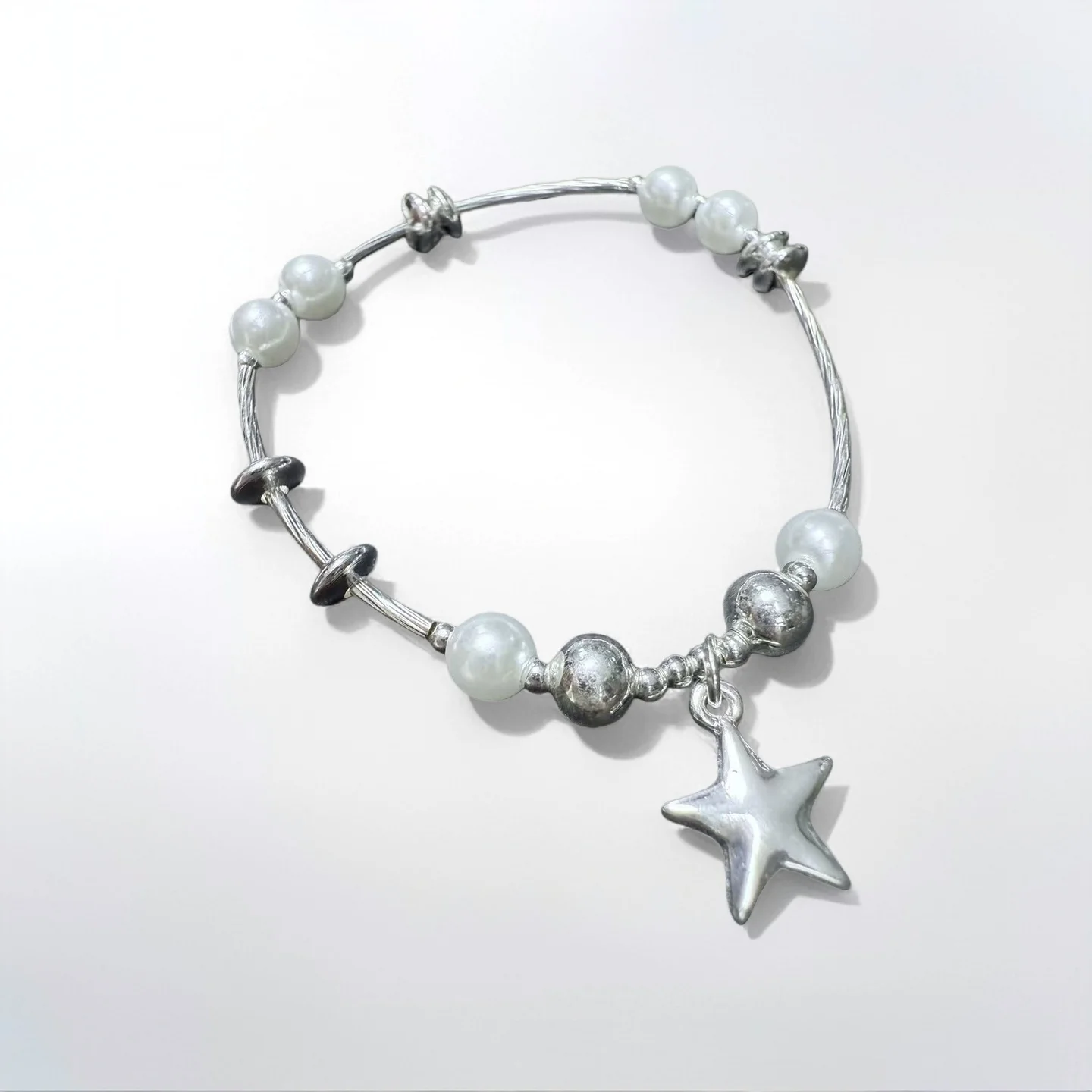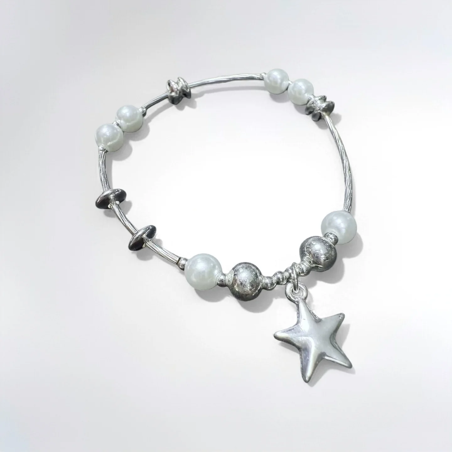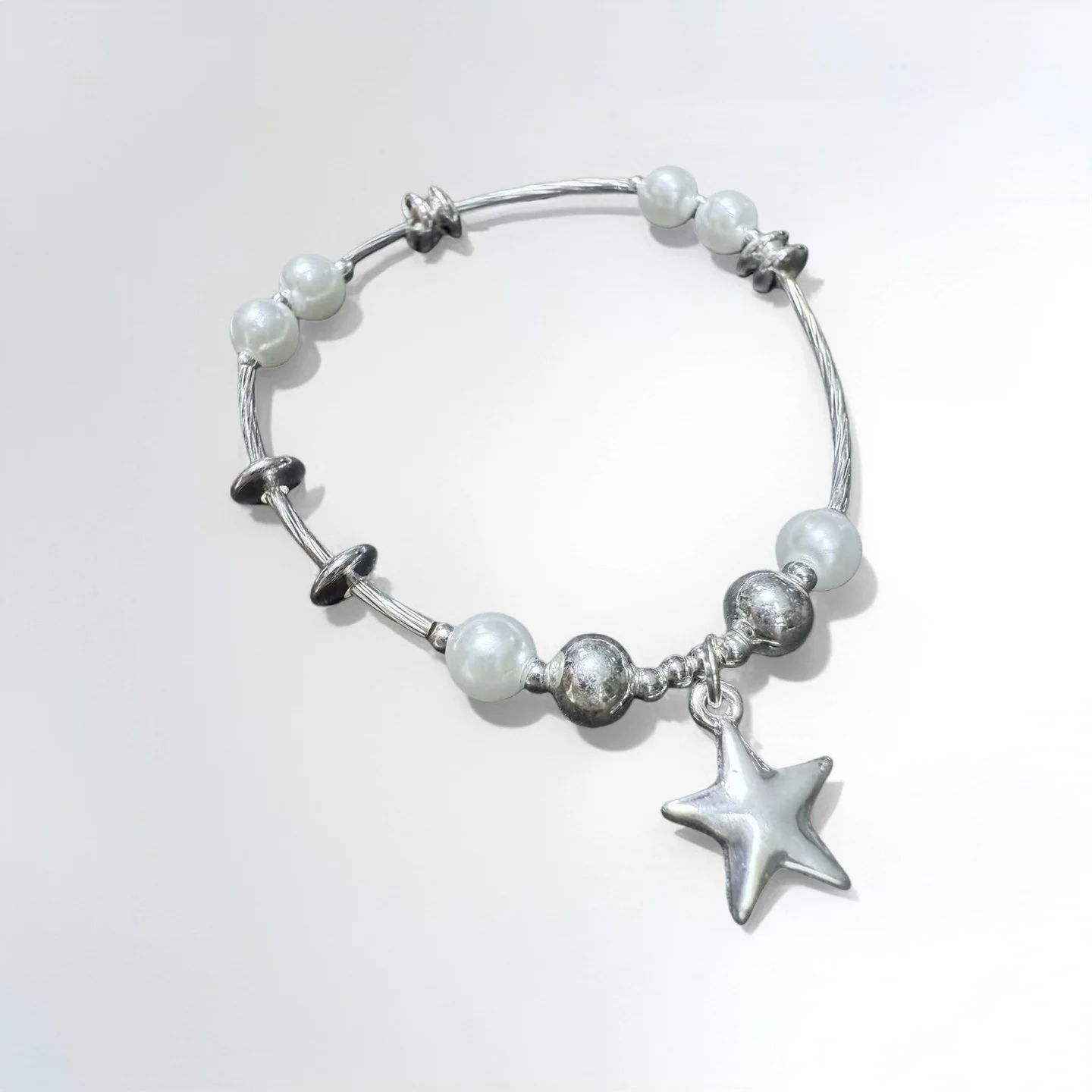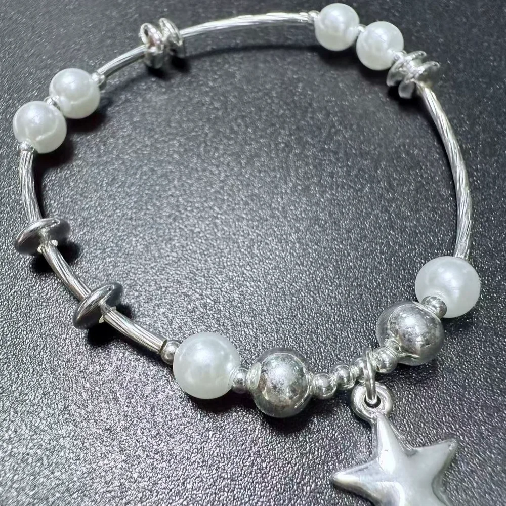 Women's Fashion Bracelet with Silver Tone Star Charm Faux Pearl Beads Unique Adjustable Wire Design Trendy Daily Wear Jewelry