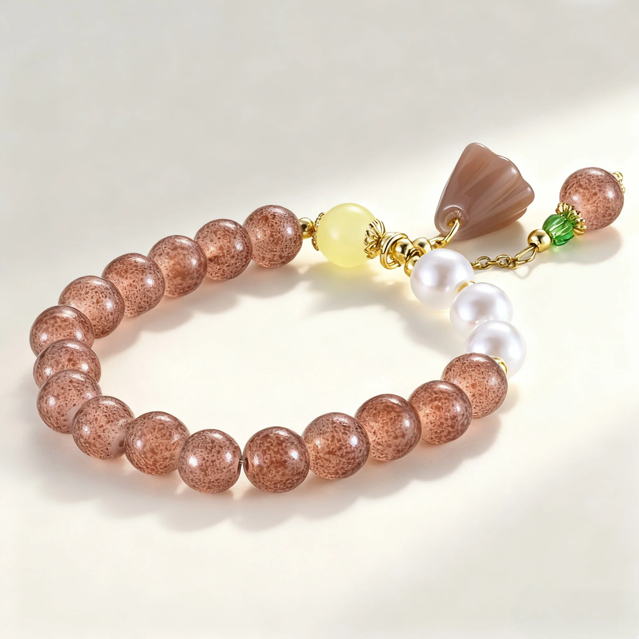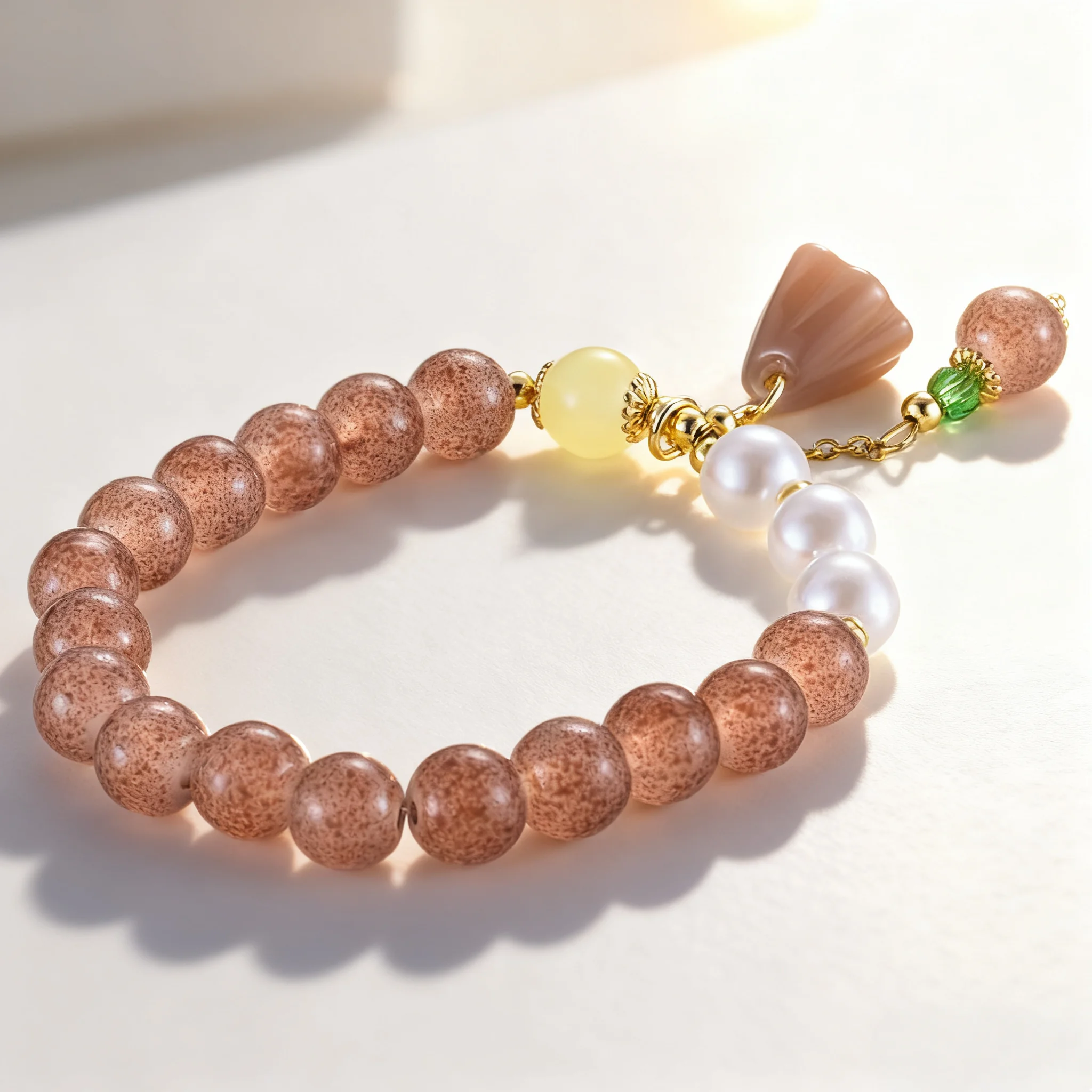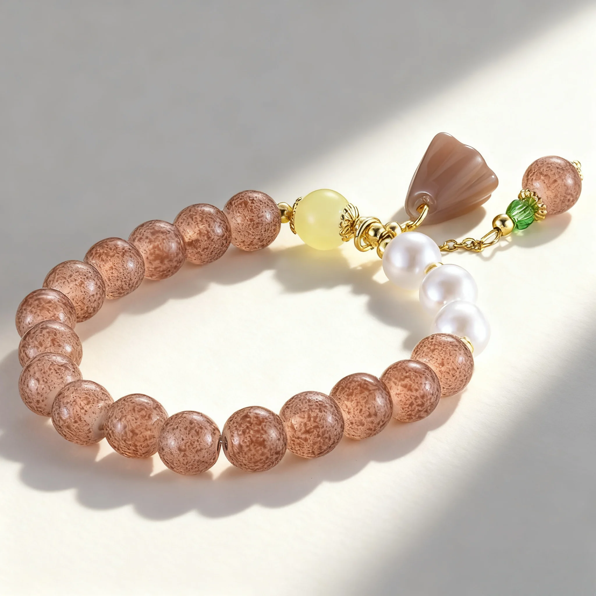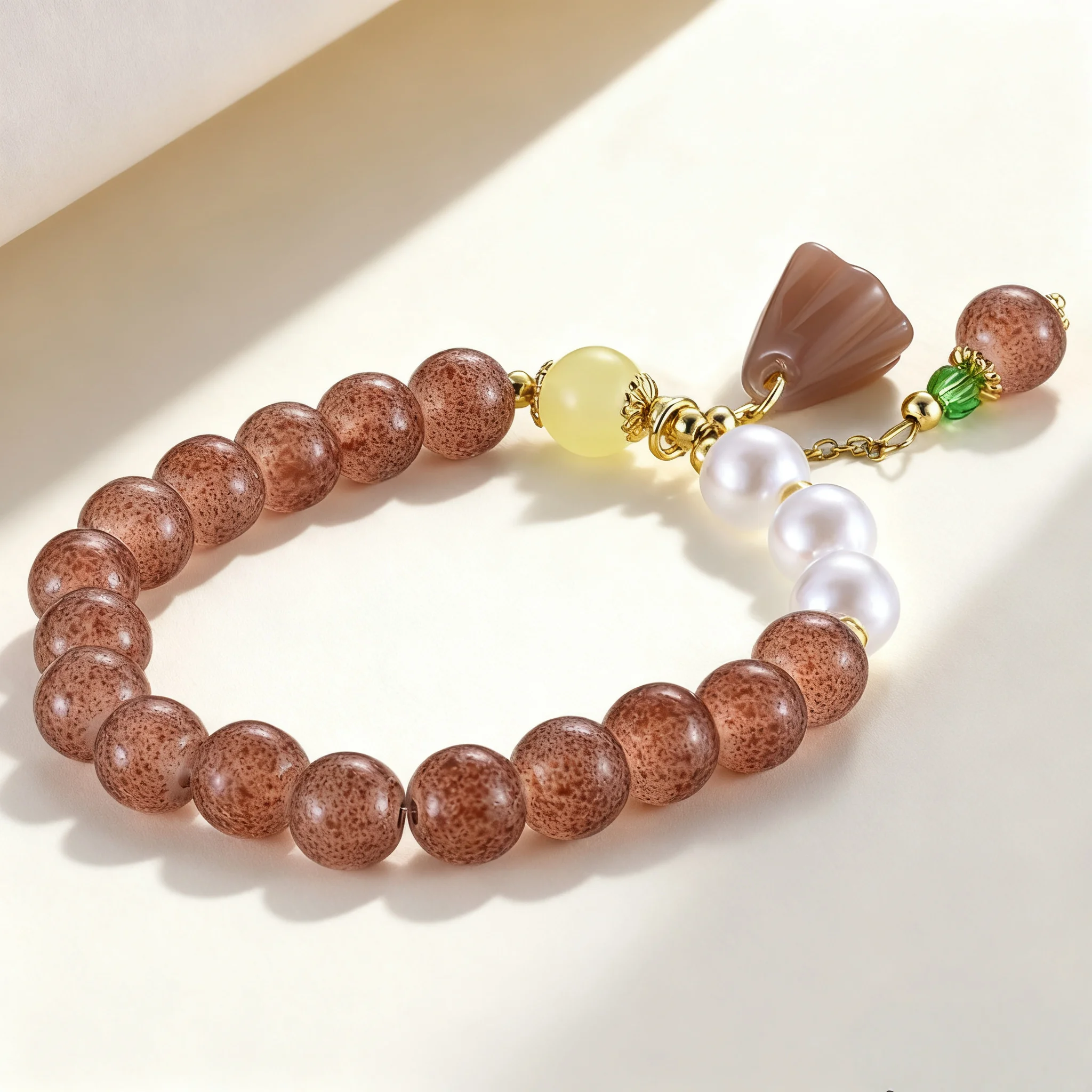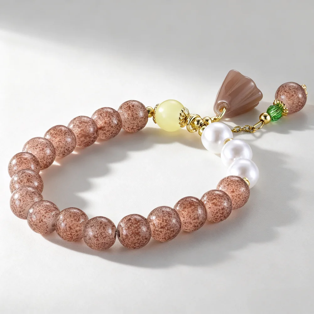 Women's Vintage Style Bracelet with Speckled Brown Beads Pearl Agate Lotus Charm Elegant Elastic Jewelry for Daily Wear Gift