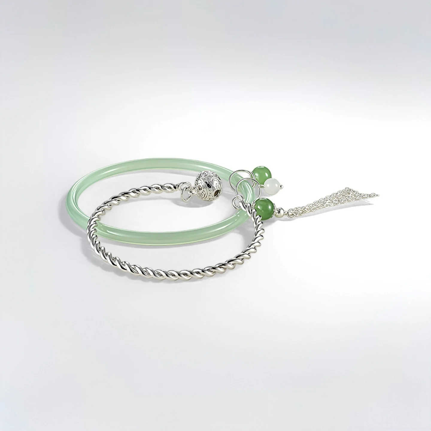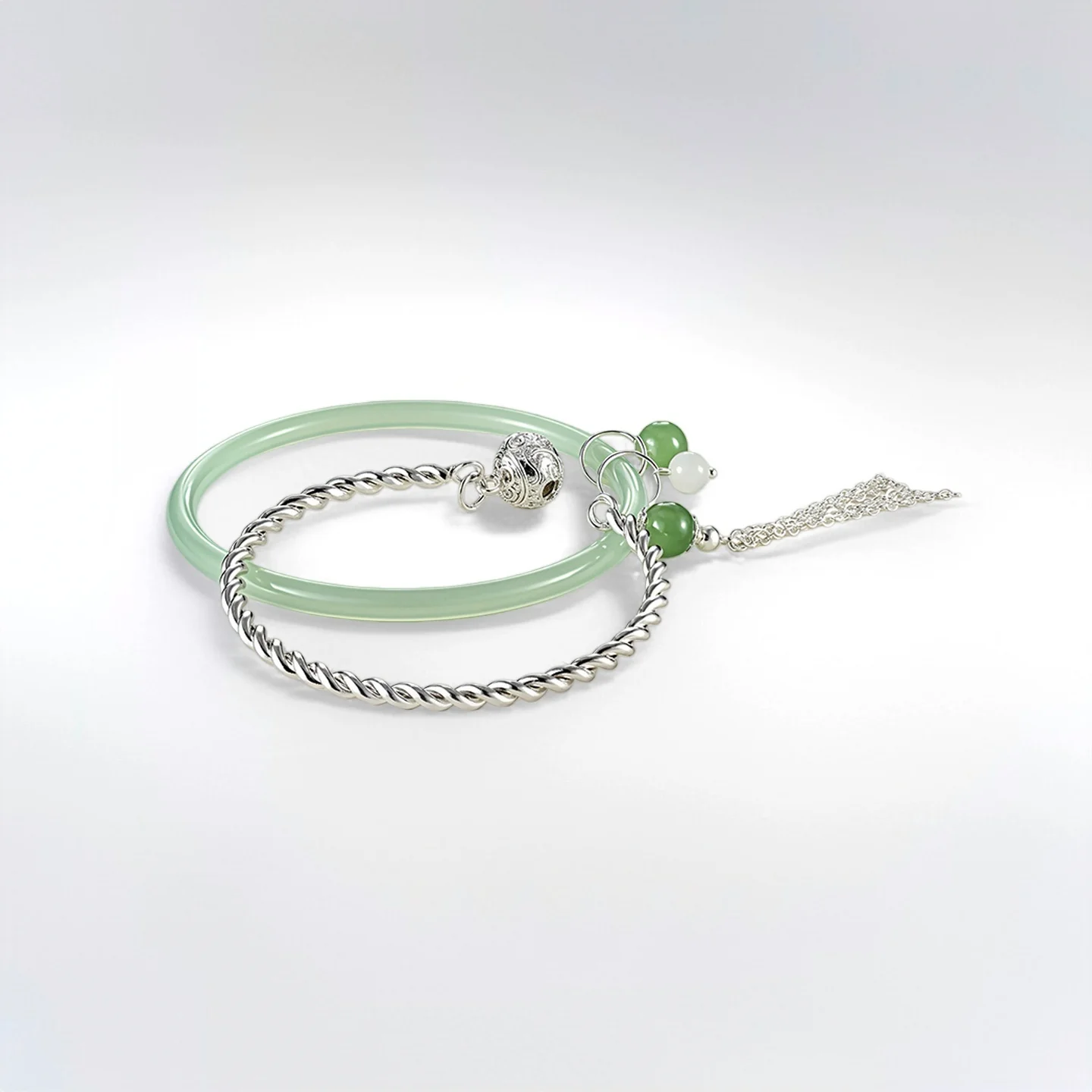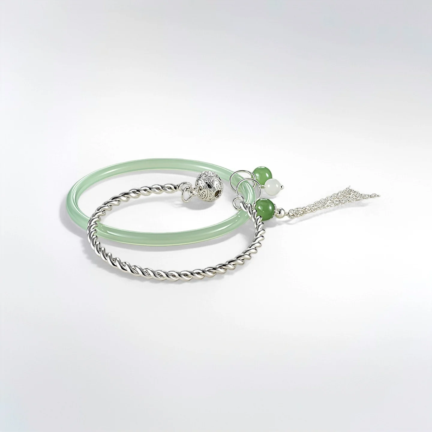 Elegant Natural Green Agate Twisted Silver Bangle Set with Jade Beads Vintage Hollow Bead Detail Exquisite Jewelry Collection