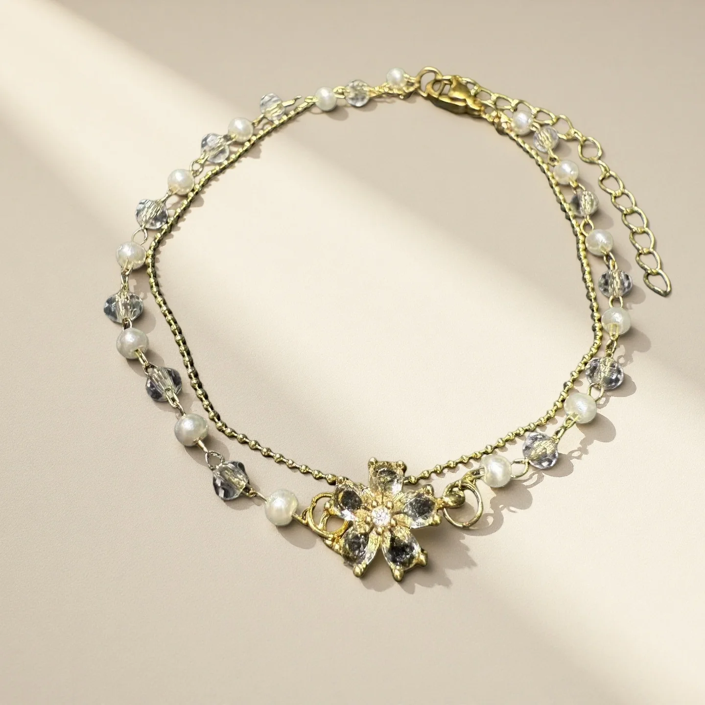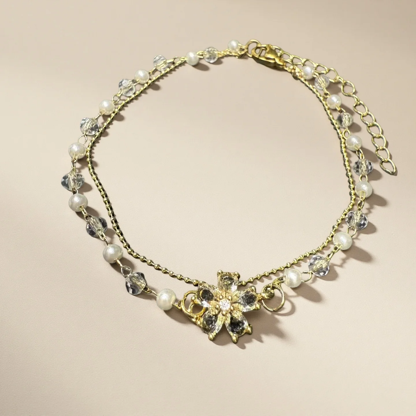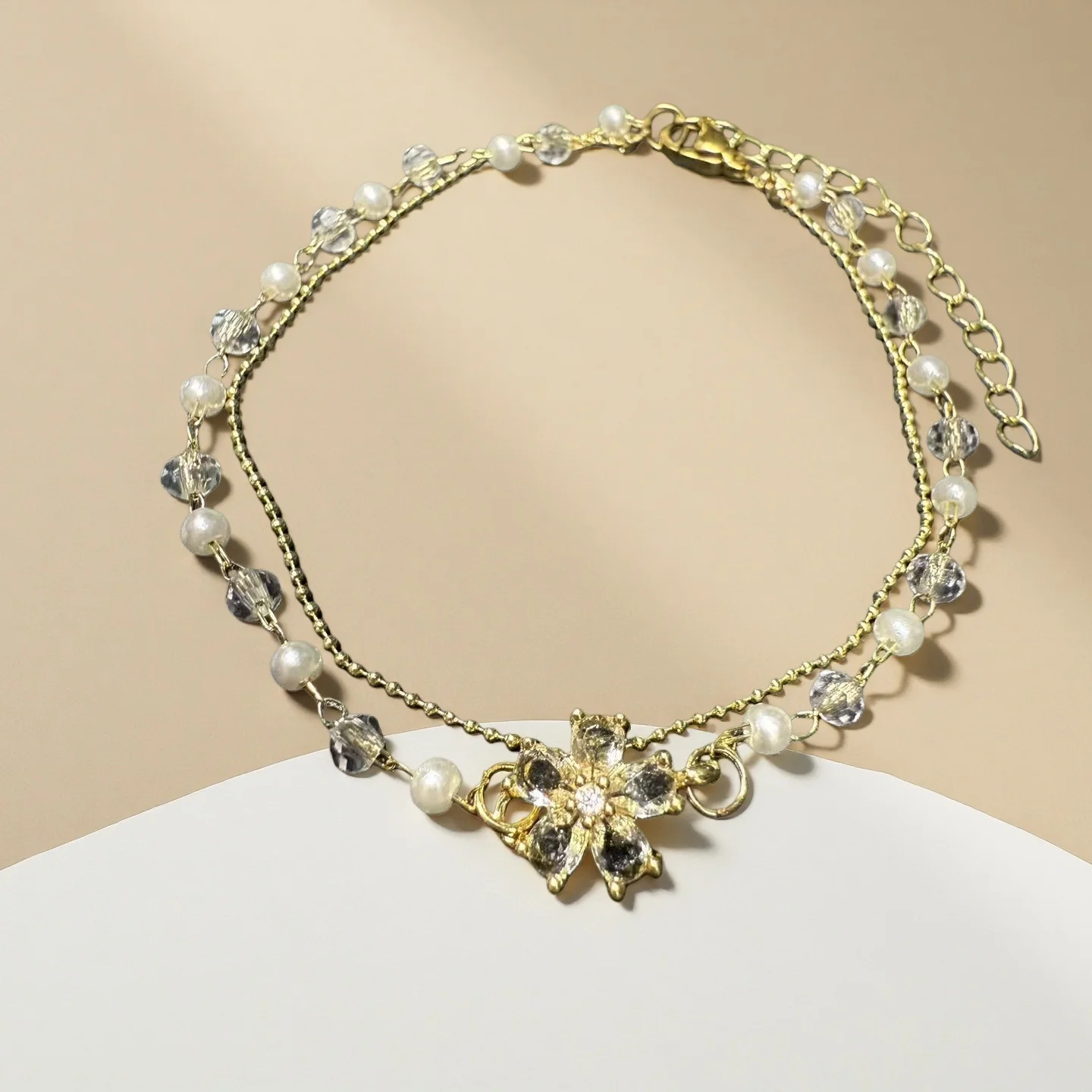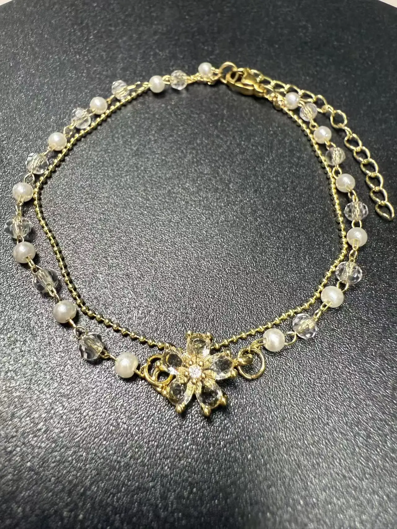 Double-layer Crystal Flower Bracelets Shinny Copper Charmed Bracelets Zircon Pearl Bracelets for Woman