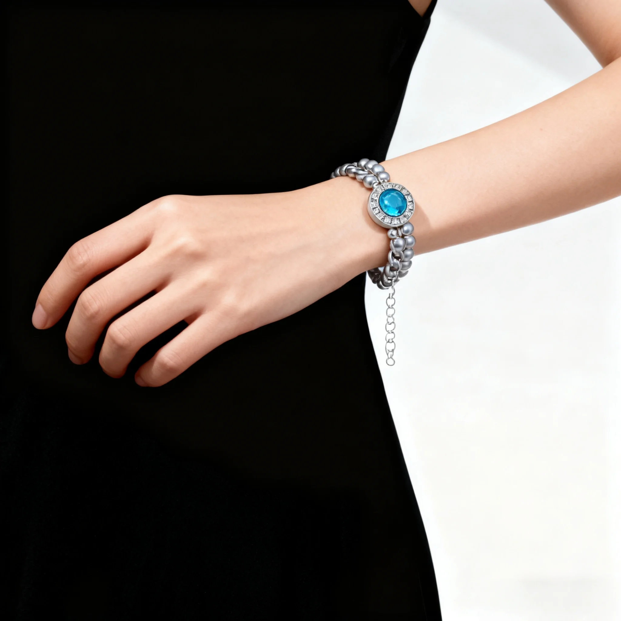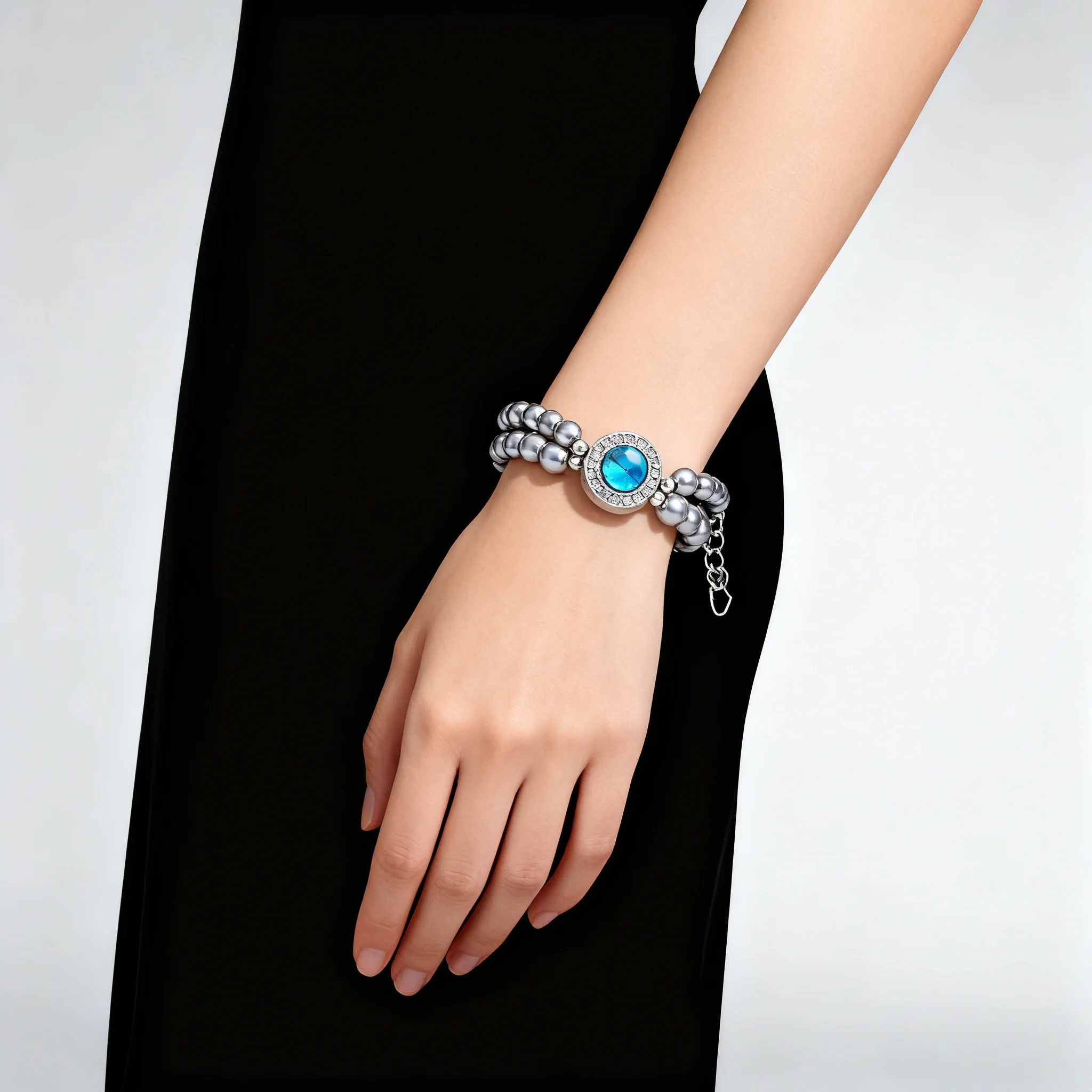 Women's Multi Layer Silver Tone Pearl Bracelet with Blue Crystal Clock Rhinestones Adjustable Chain Fashion Jewelry for Party