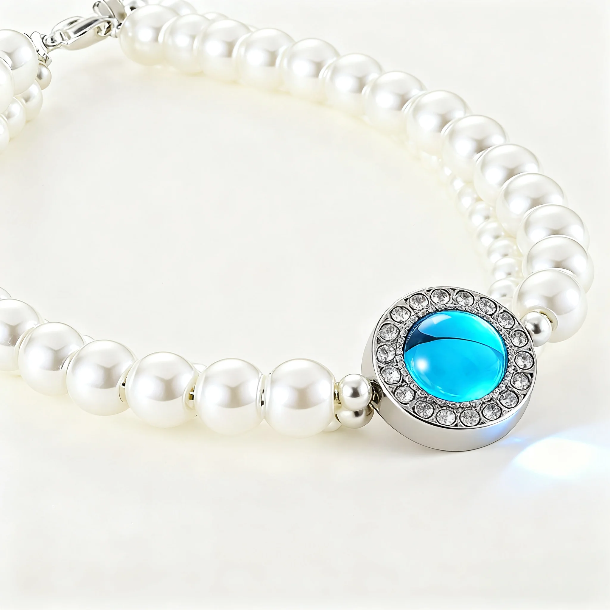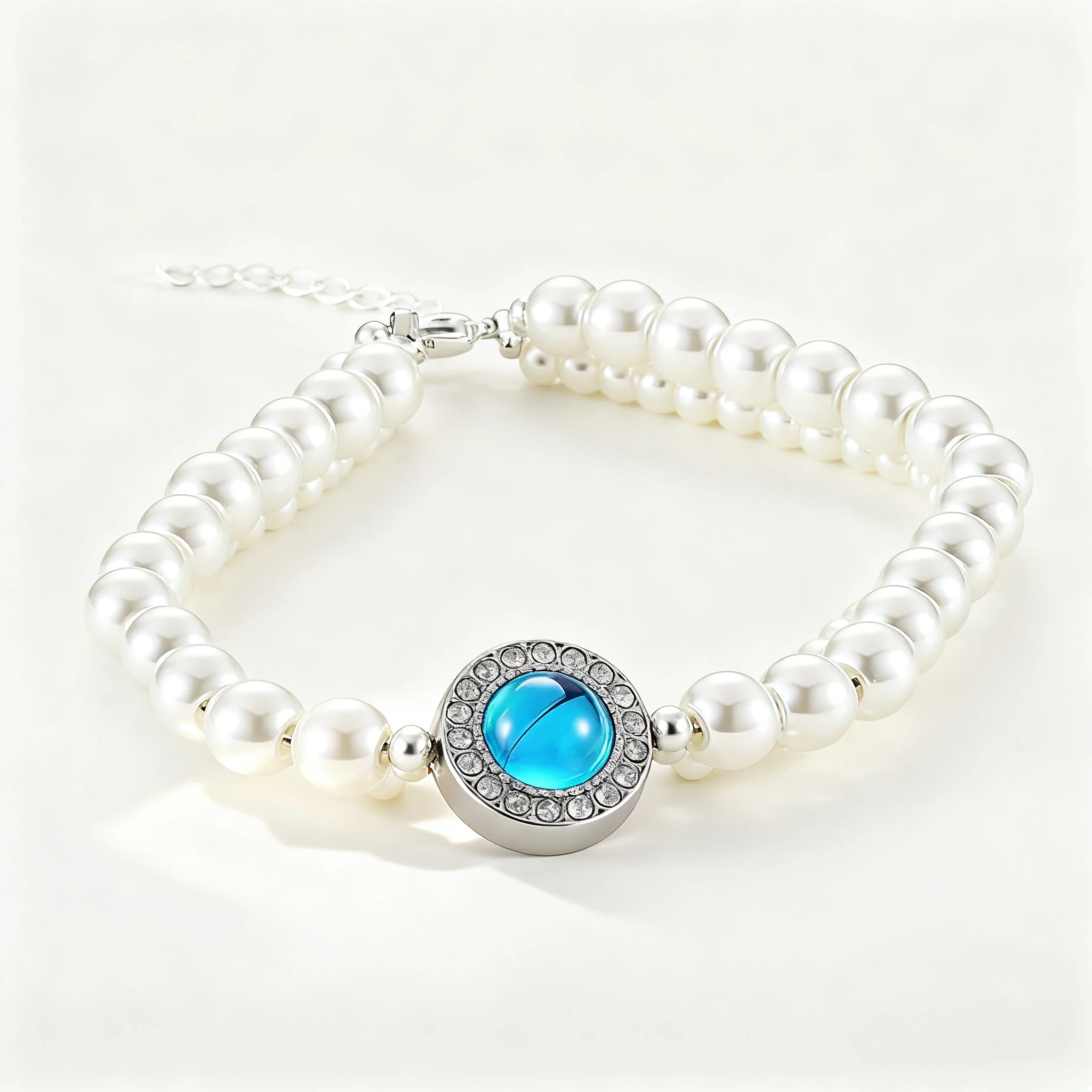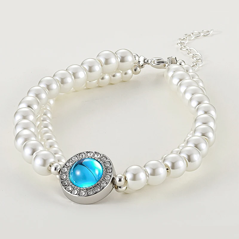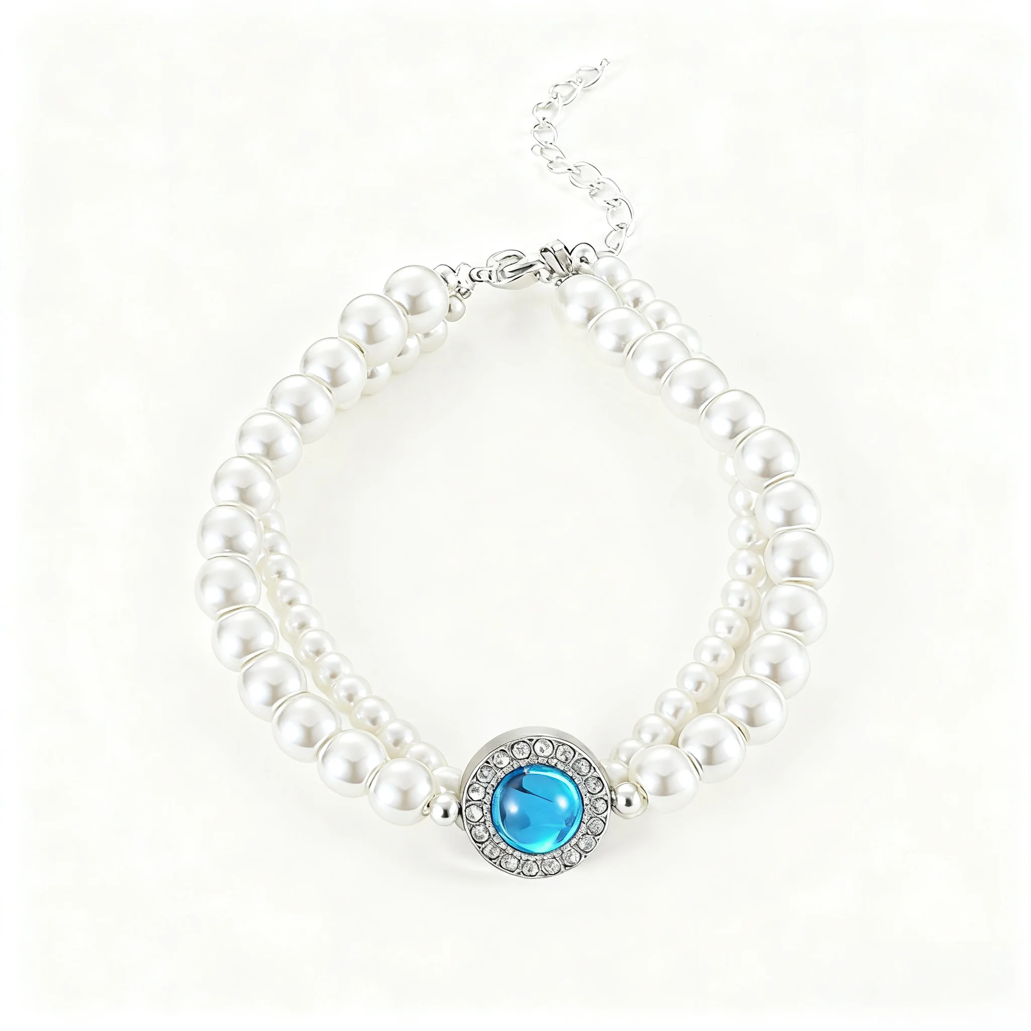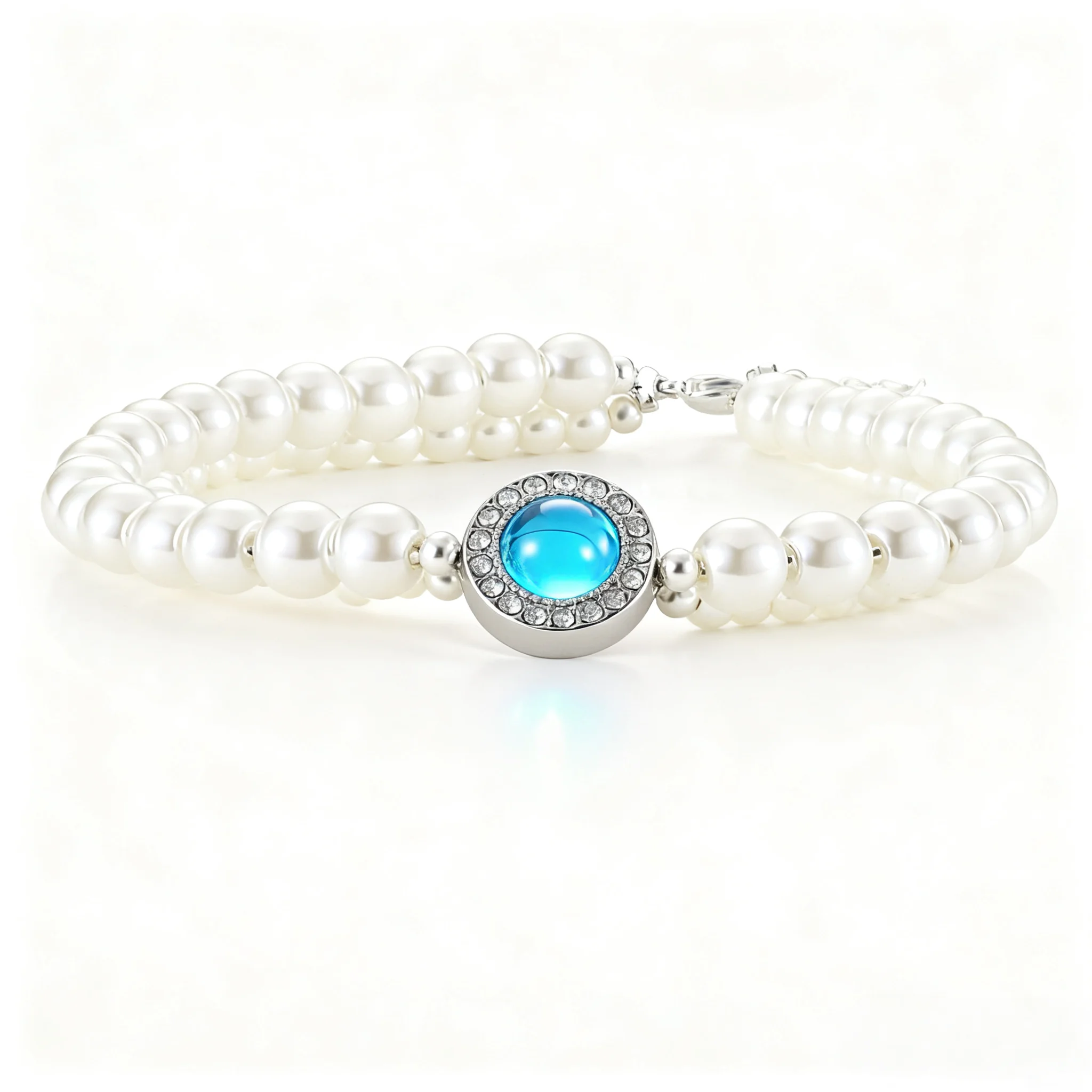 Women's Multi Layer White Pearl Bracelet with Blue Crystal Rhinestone Centerpiece Silver Tone Adjustable Chain Fashion Jewelry