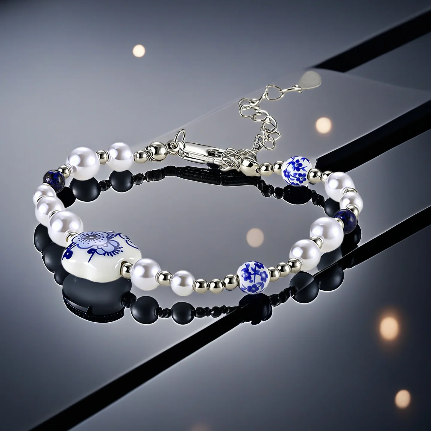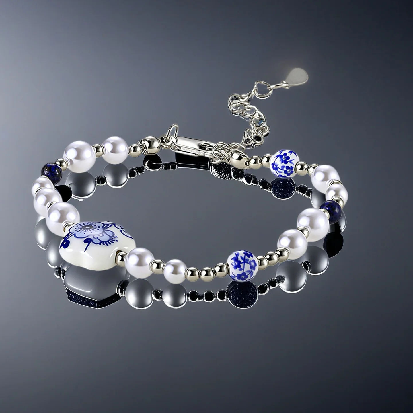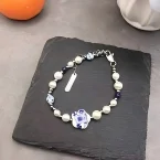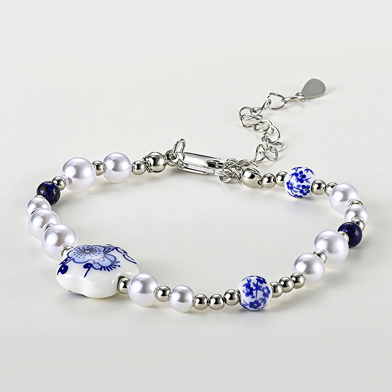 Chinese Style Retro Vintage Irregular Imitation Pearl Flower Ceramic Heart Blue Flower Porcelain Bracelet for Women Ladies