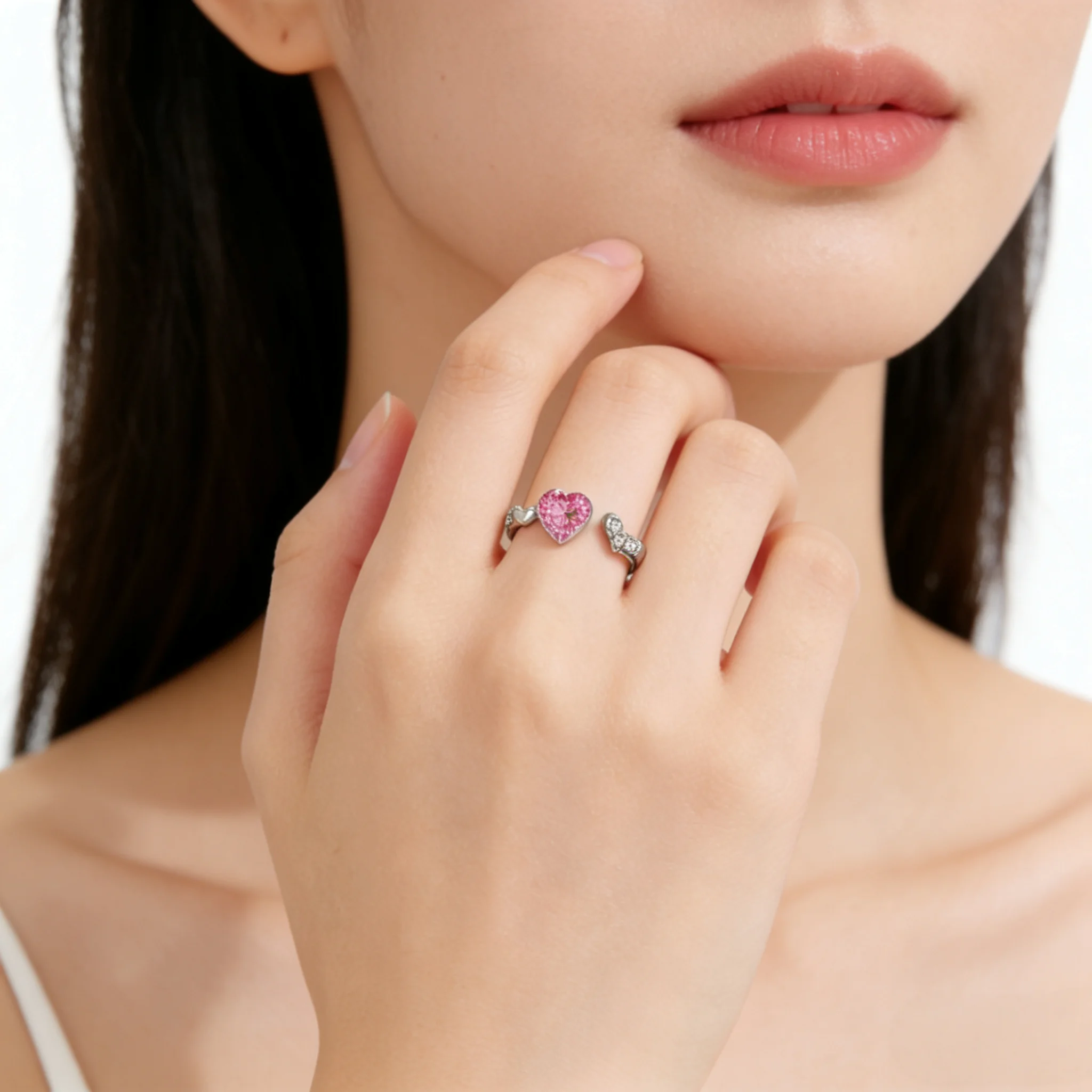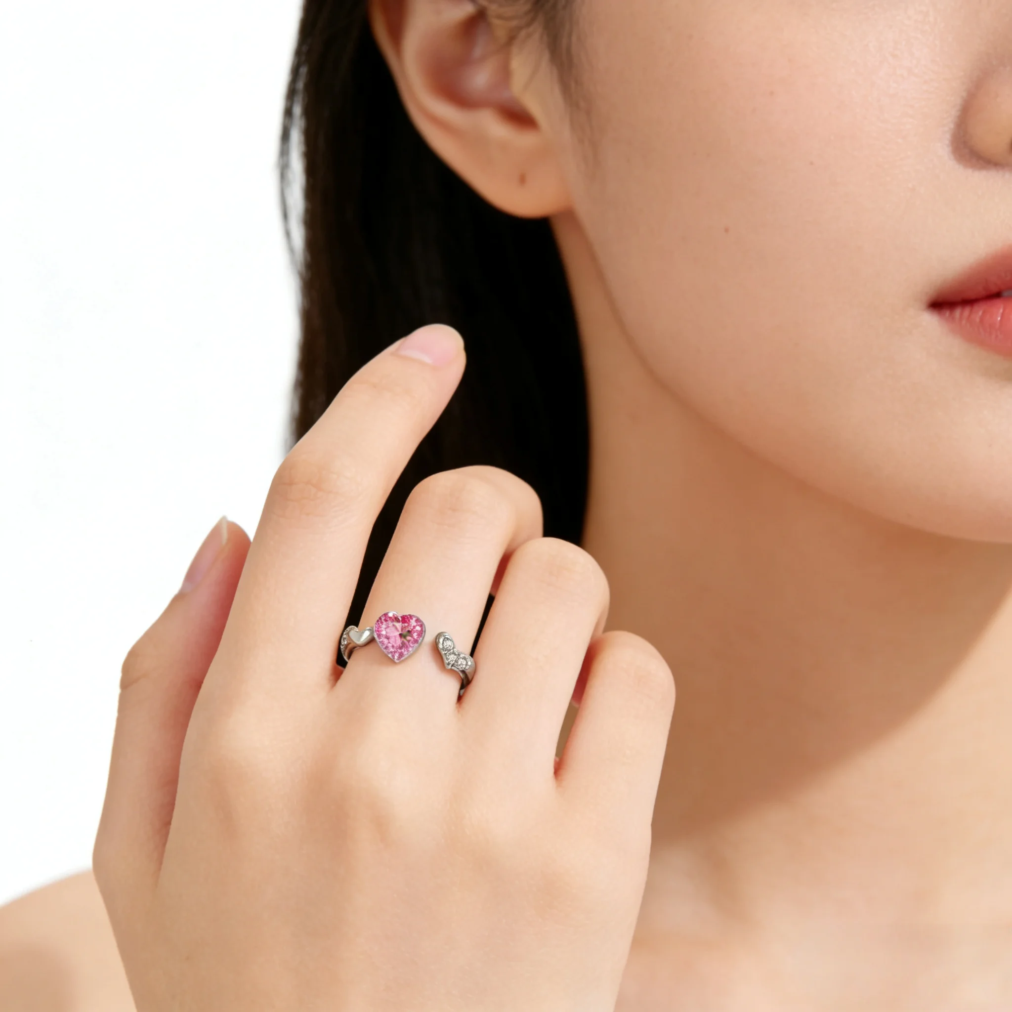 Romantic Heart-Shaped Pink Cubic Zirconia Open Ring Women Silver Plated Fashion Jewelry Unique Design Valentine's Day Wholesale