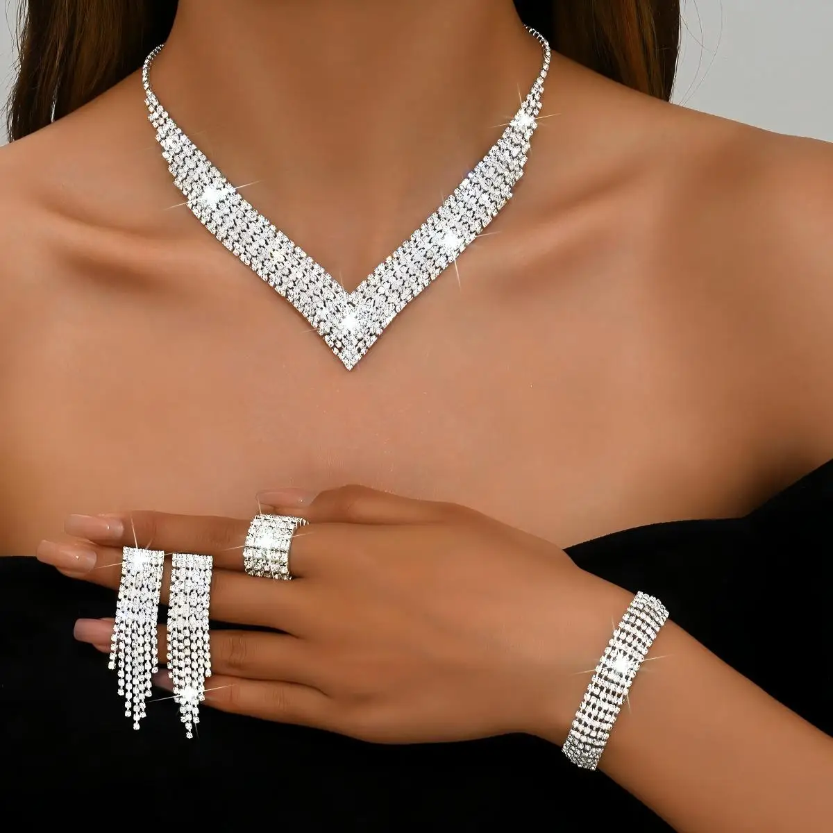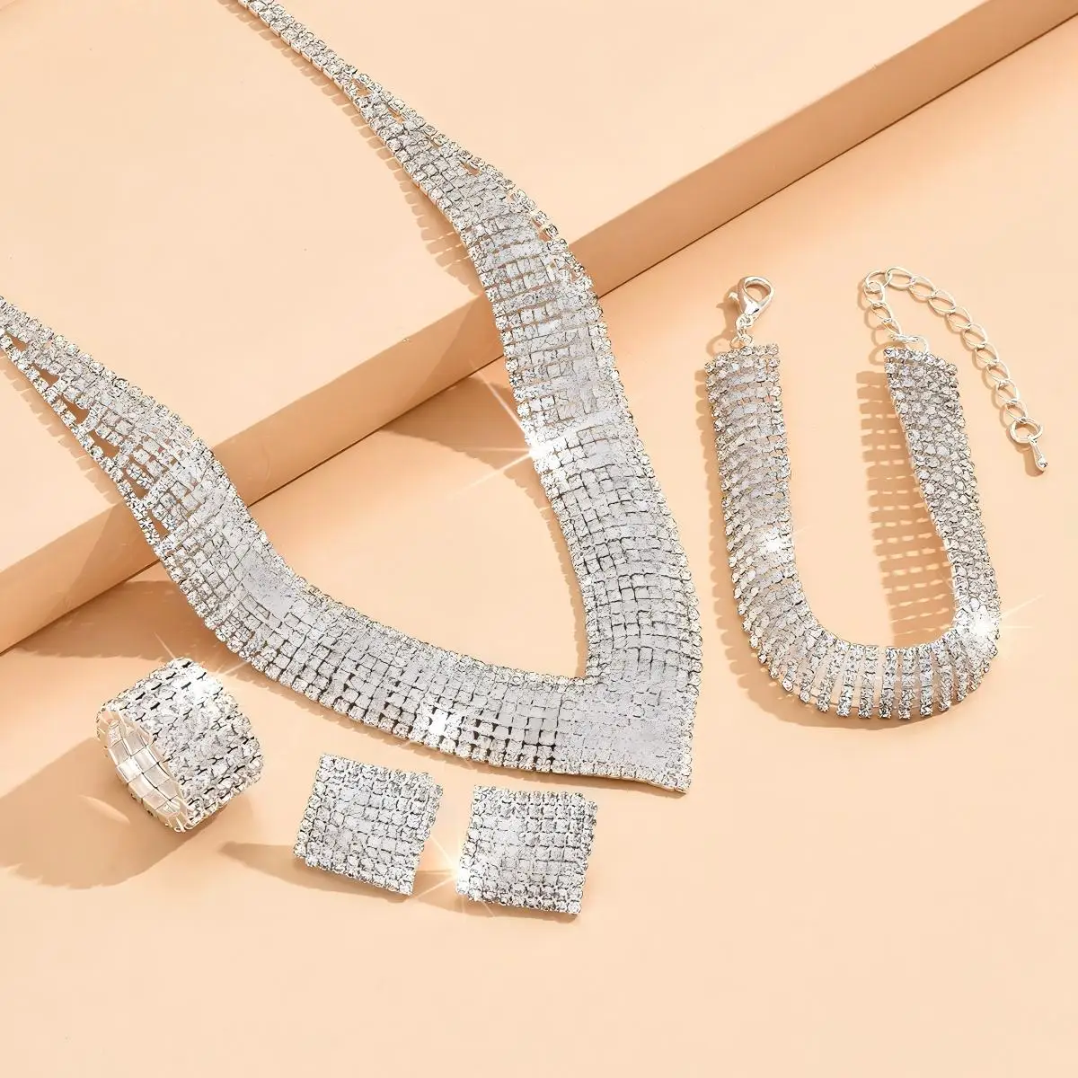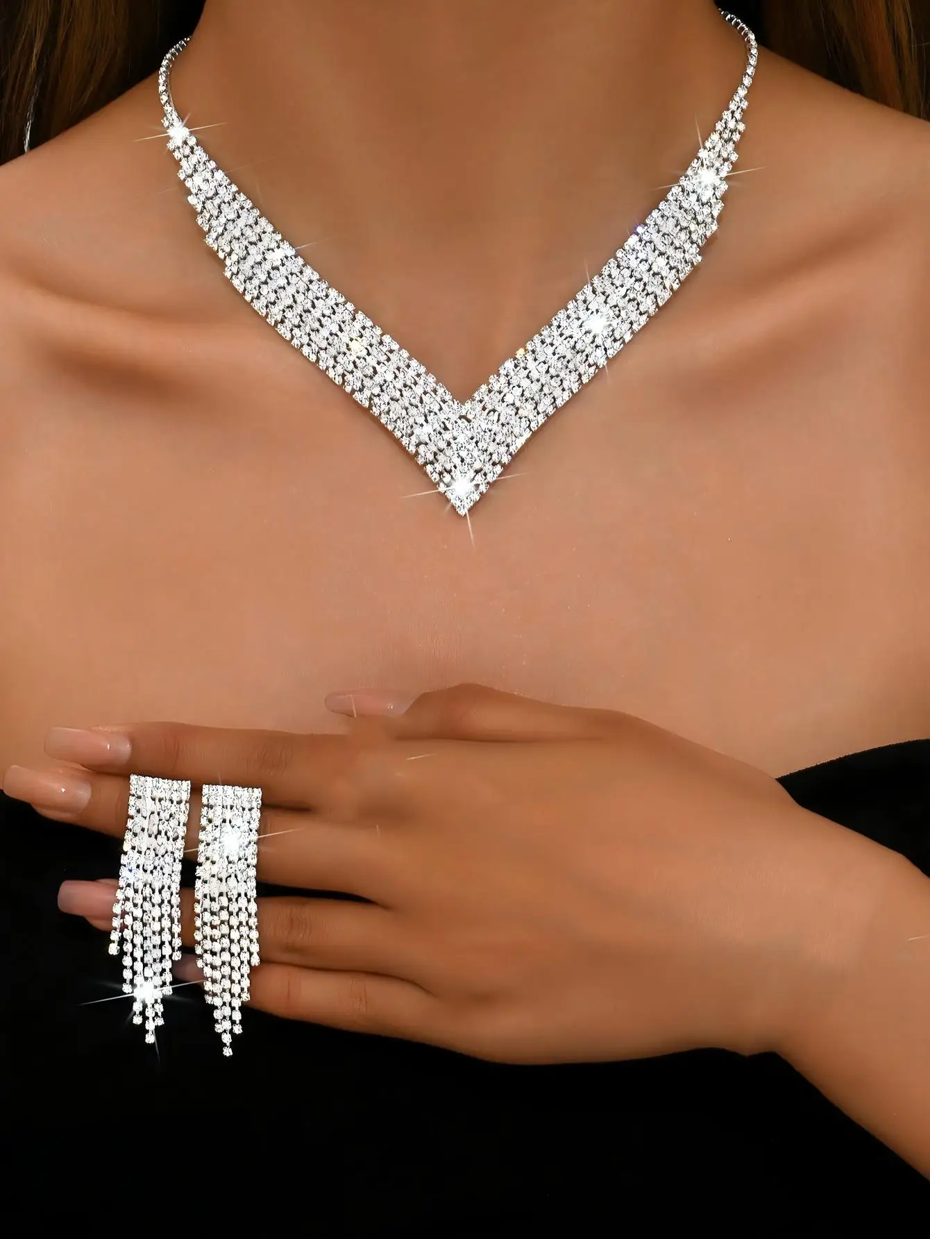 Hot-selling Luxury Diamond Multilayer Tennis Silver studded Copper Alloy Temperament Claw Chain Earrings Necklaces for Women Set