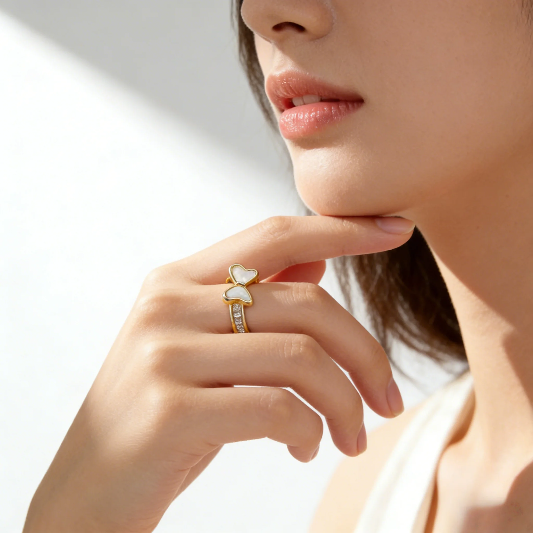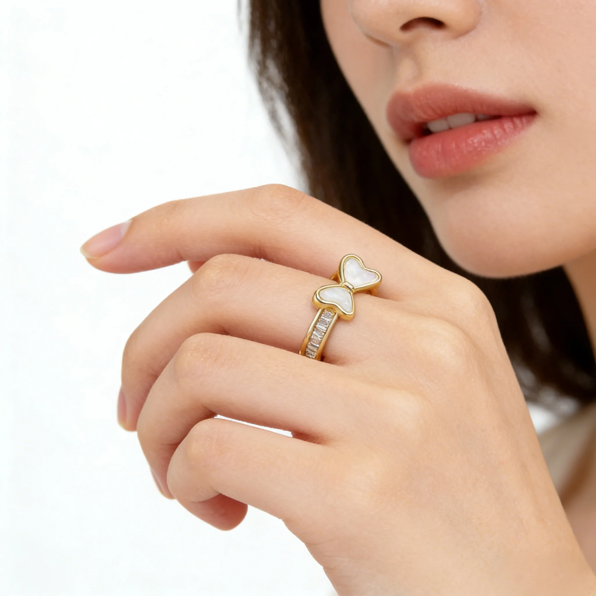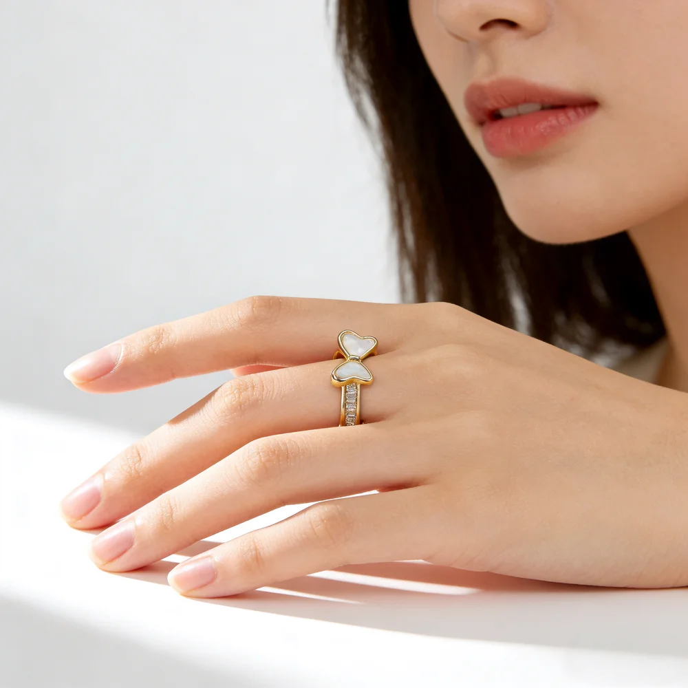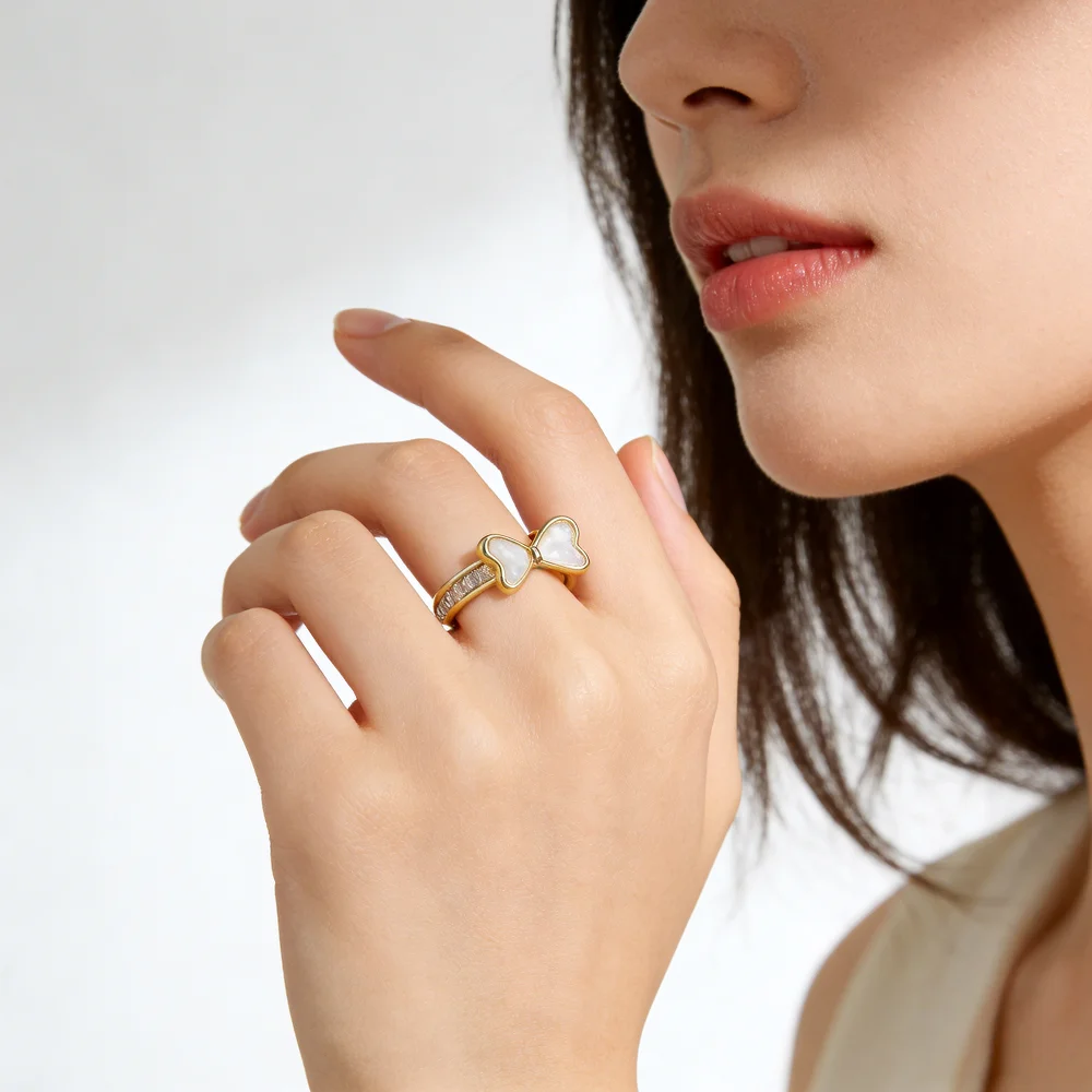 Chic Bowknot Open Ring Women Gold-Plated with Mother-of-Pearl Zircon Details Elegant Sweet Style Jewelry Daily Dating Wholesale