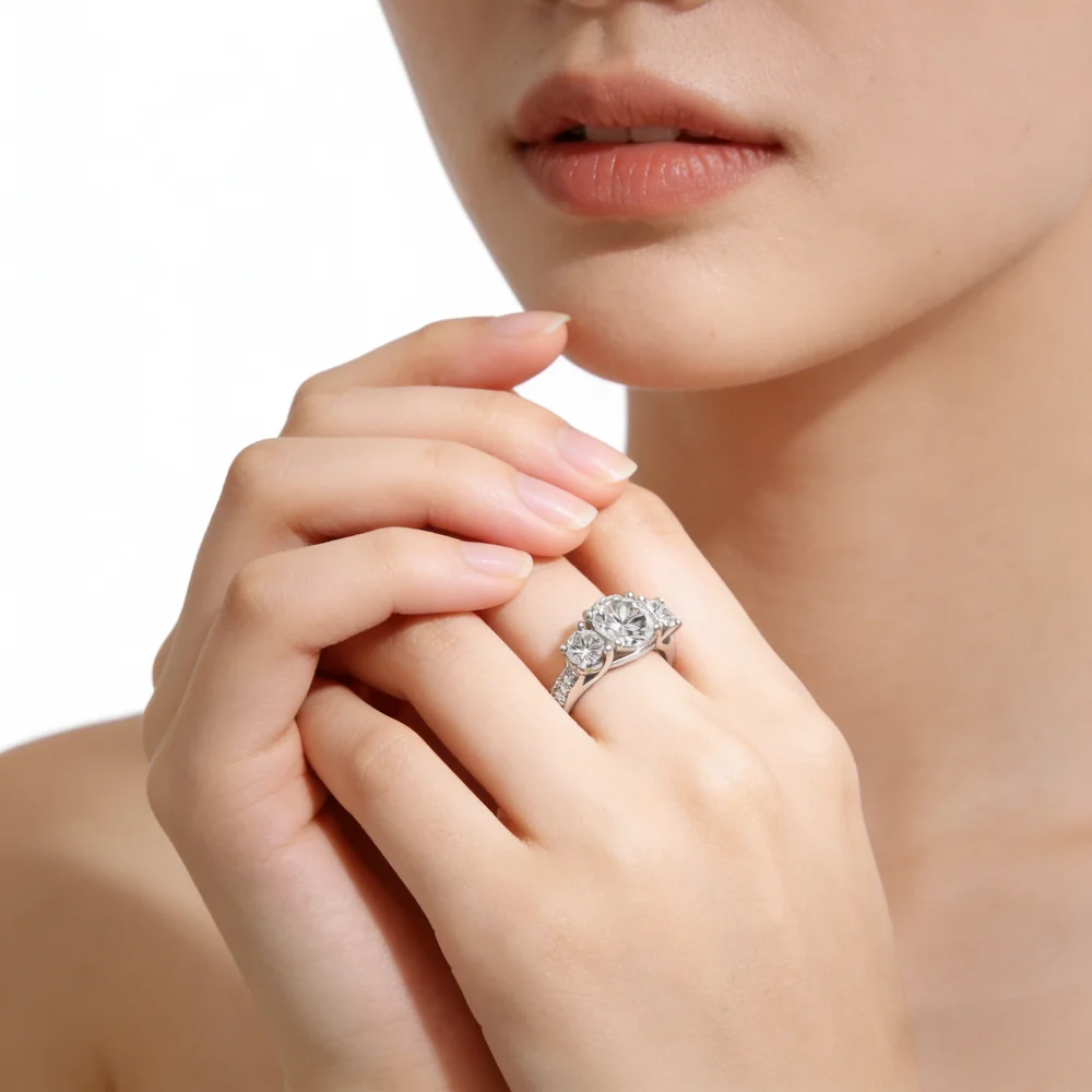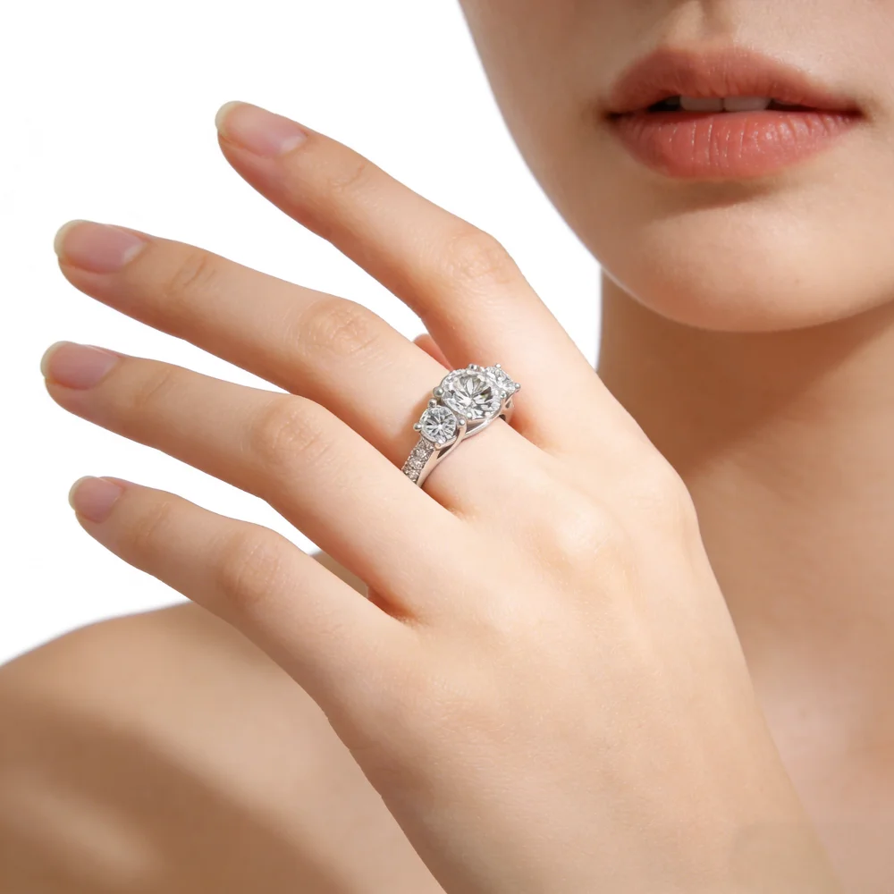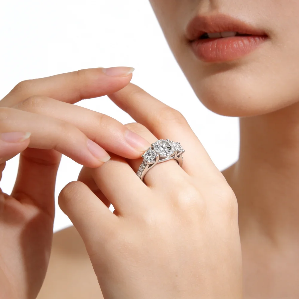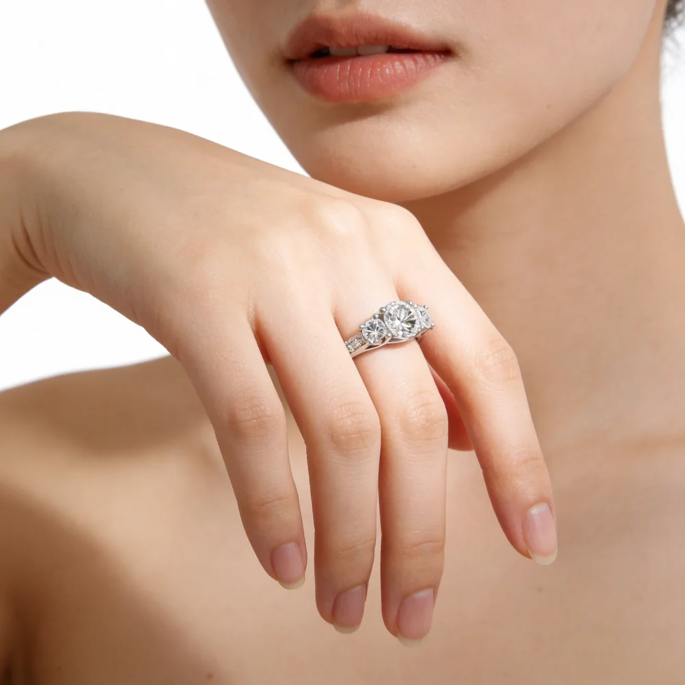 Three Stone Round Engagement Ring 925 Sterling Silver Band with Pave Side Stones Brilliant Cut Simulated Diamond Jewelry Women