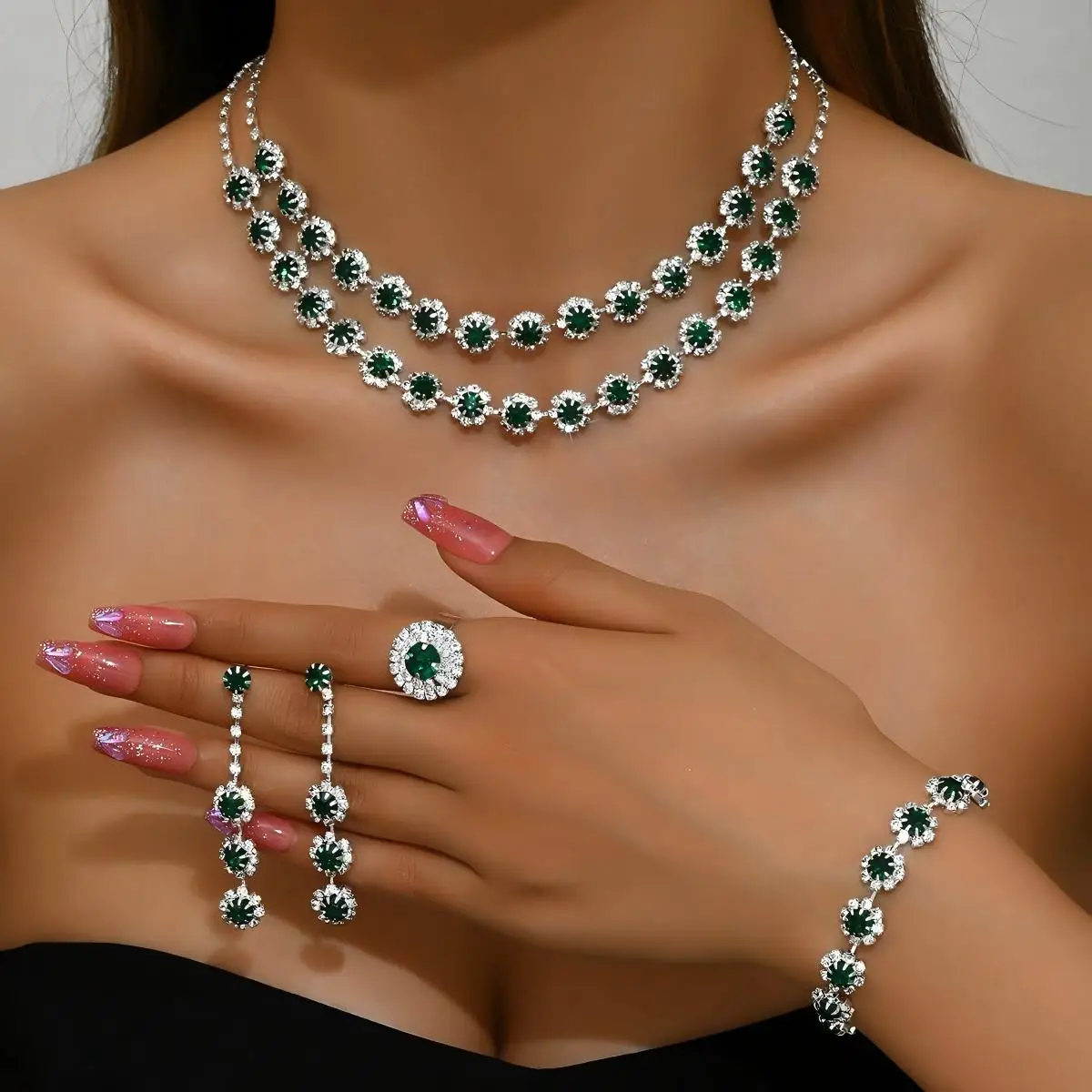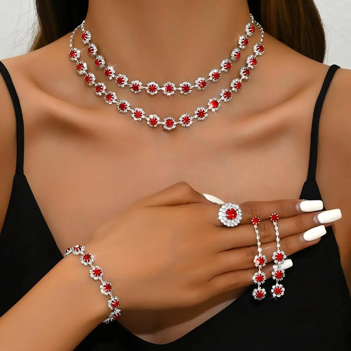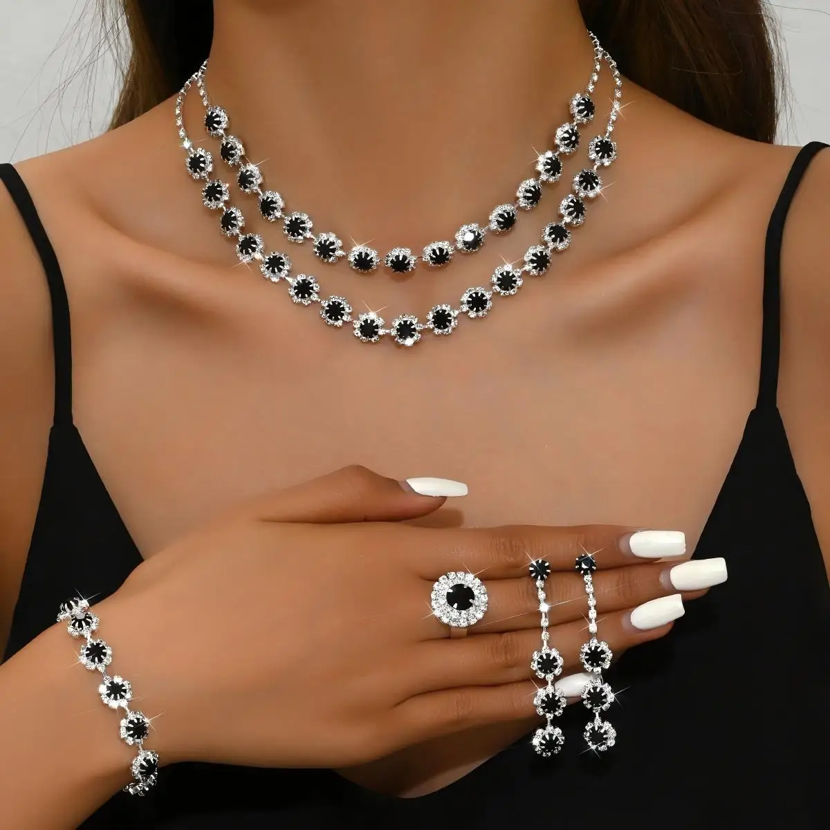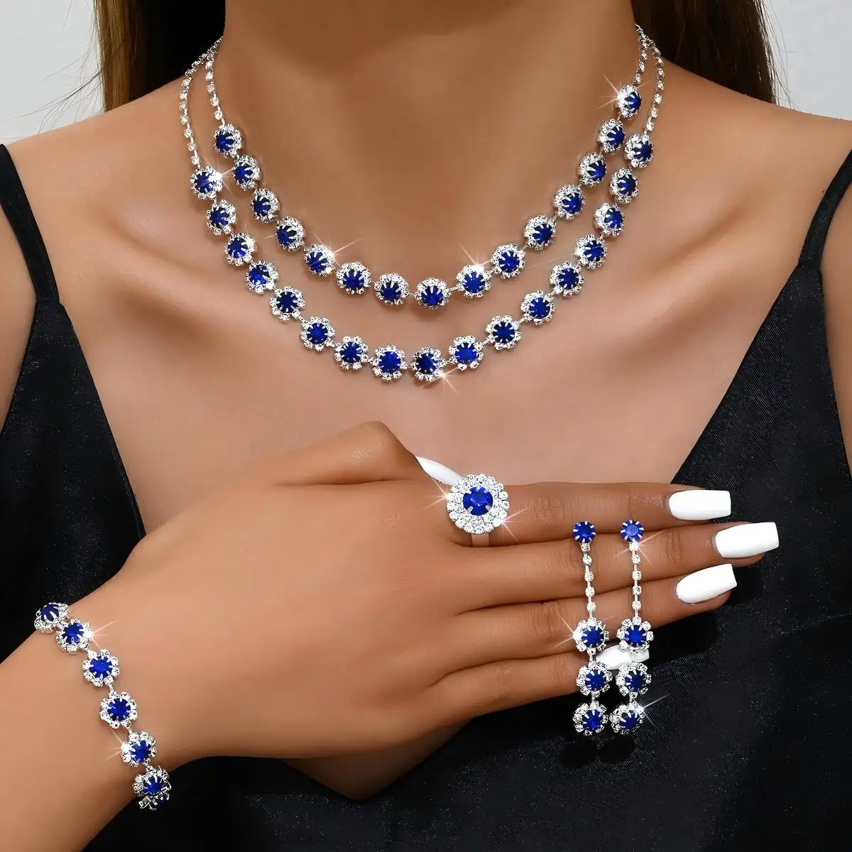 Custom Wholesale Jewelry Sets Silver Plated Flower Drops Diamond Copper Luxury Bracelet Ring Earrings Necklace for Women Set