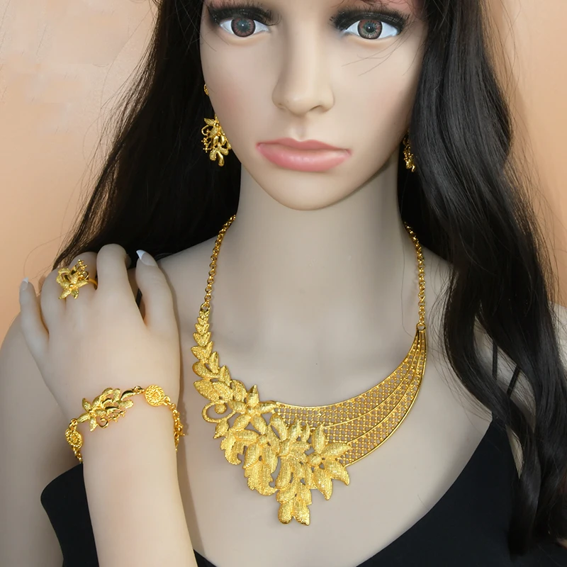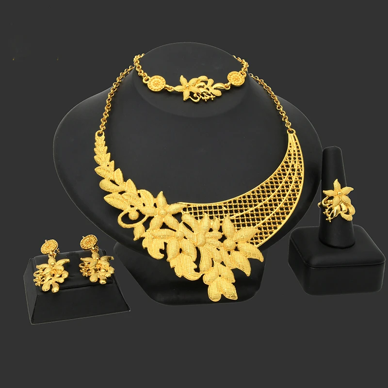 Wholesale Dubai Necklaces for Women Set Luxury 24K Gold Plated Necklace Bracelet Earrings Ring Fashion Wedding Jewelry