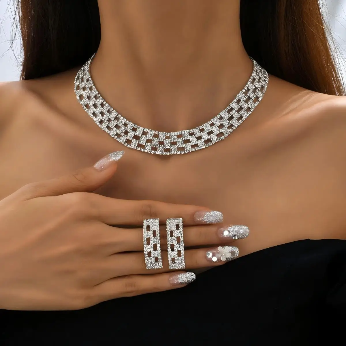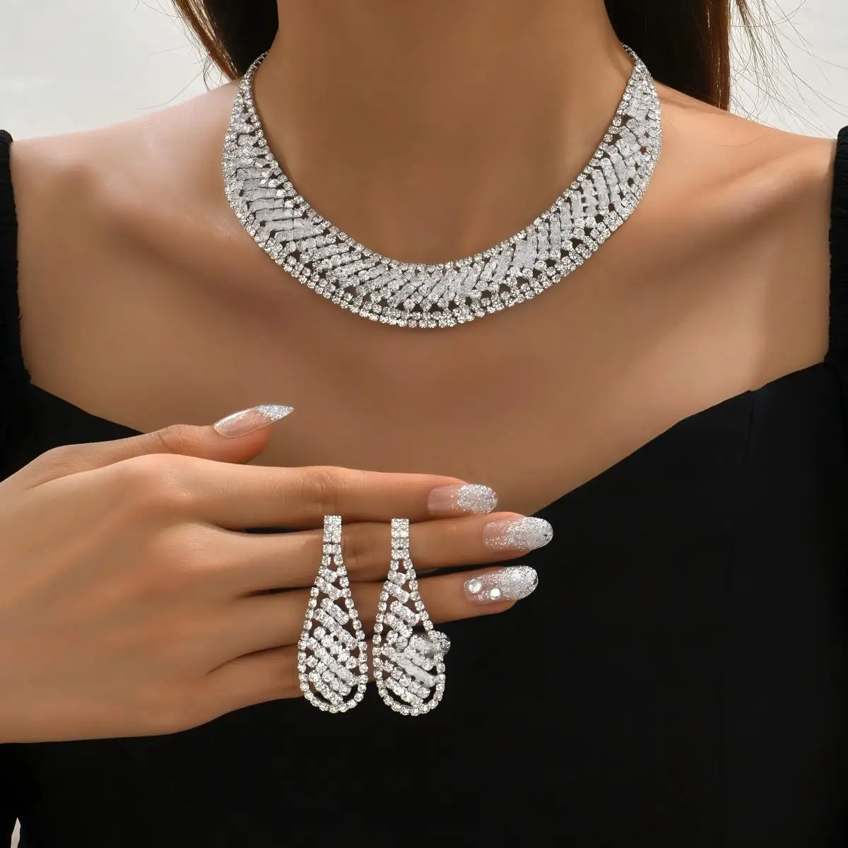 Custom Dainty Luxury Diamond Pendant Copper Alloy Layered Stacked Chain Earrings Necklaces for Women Wedding Jewelry Sets