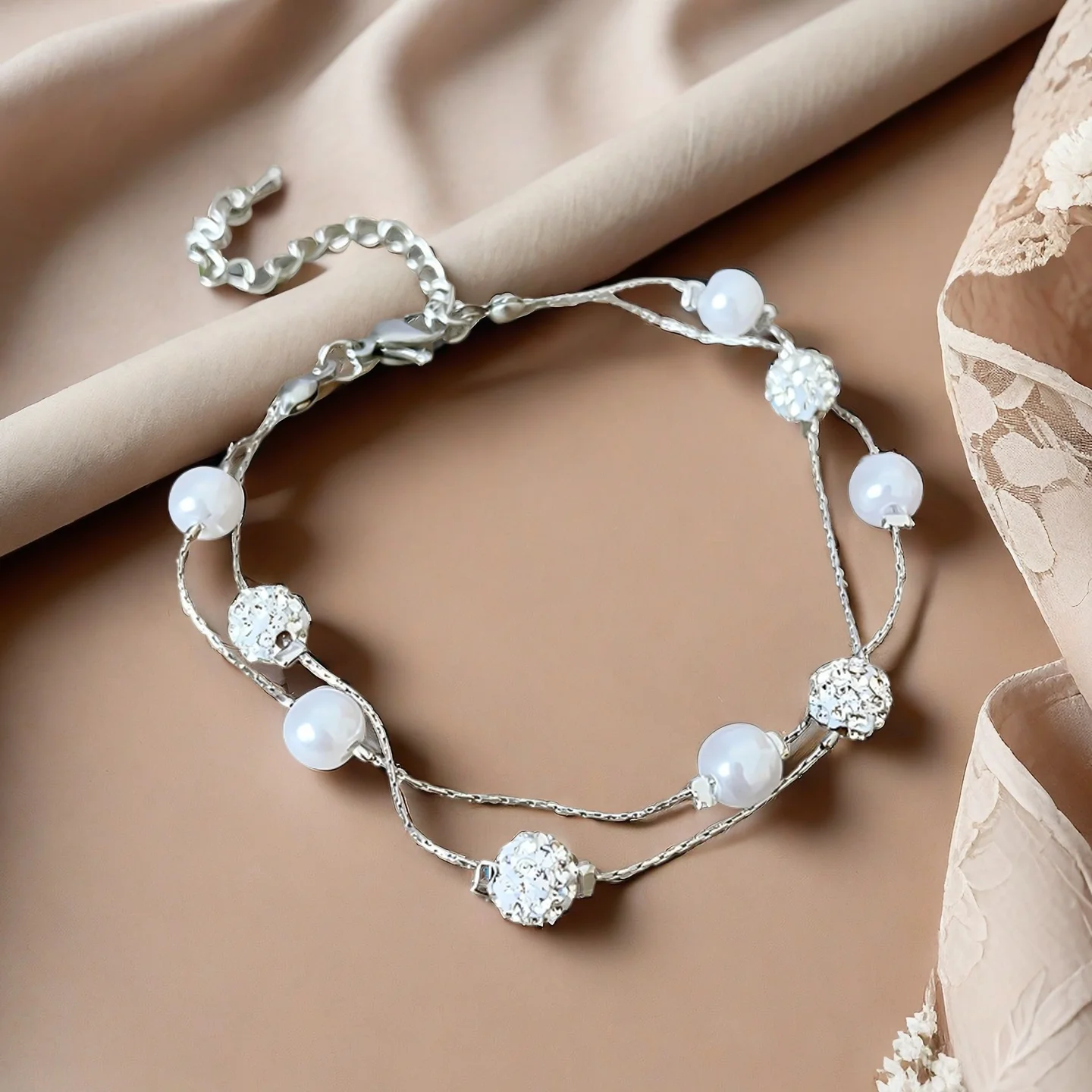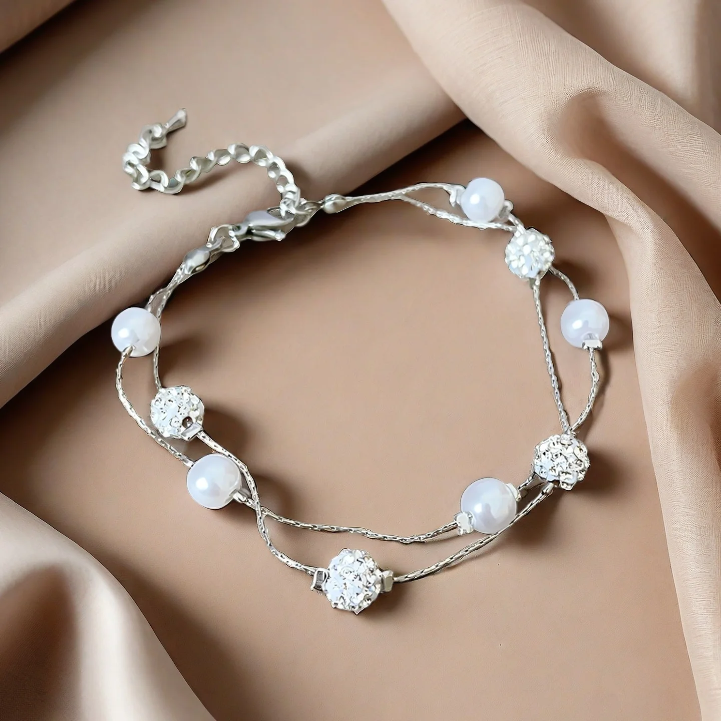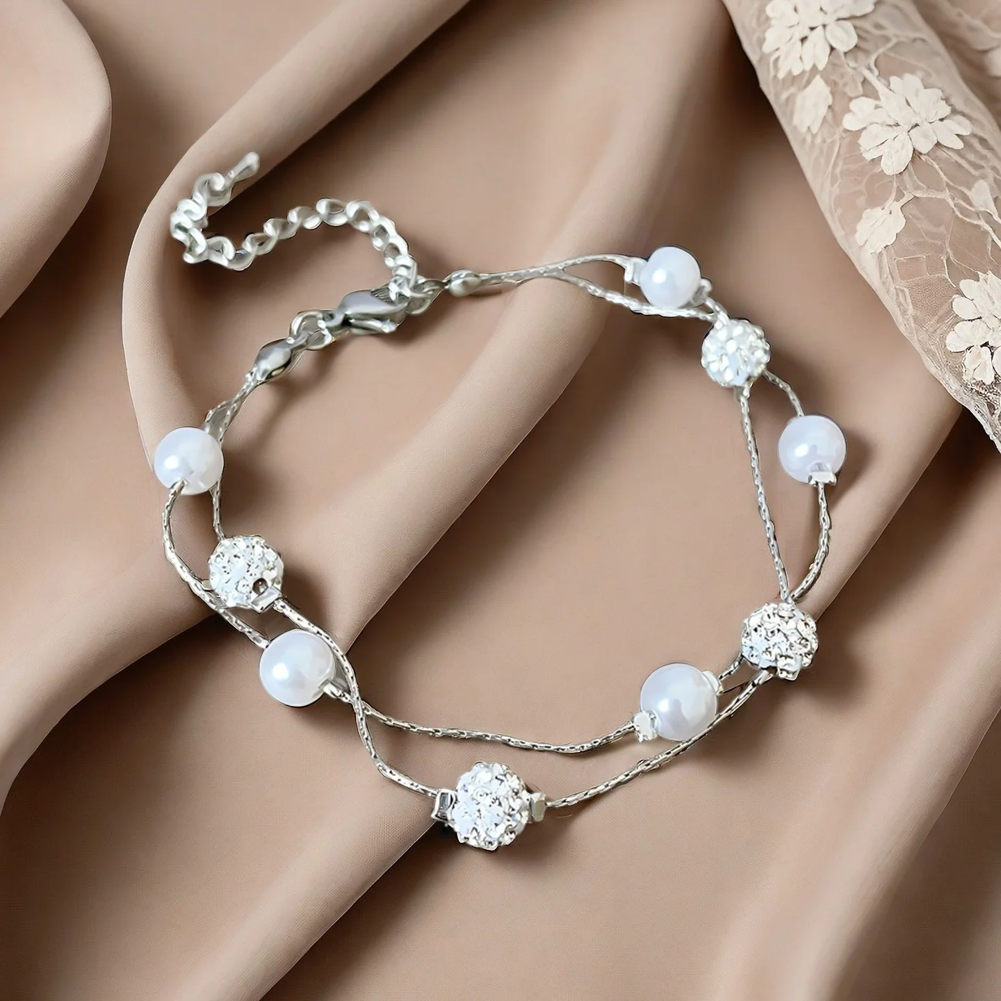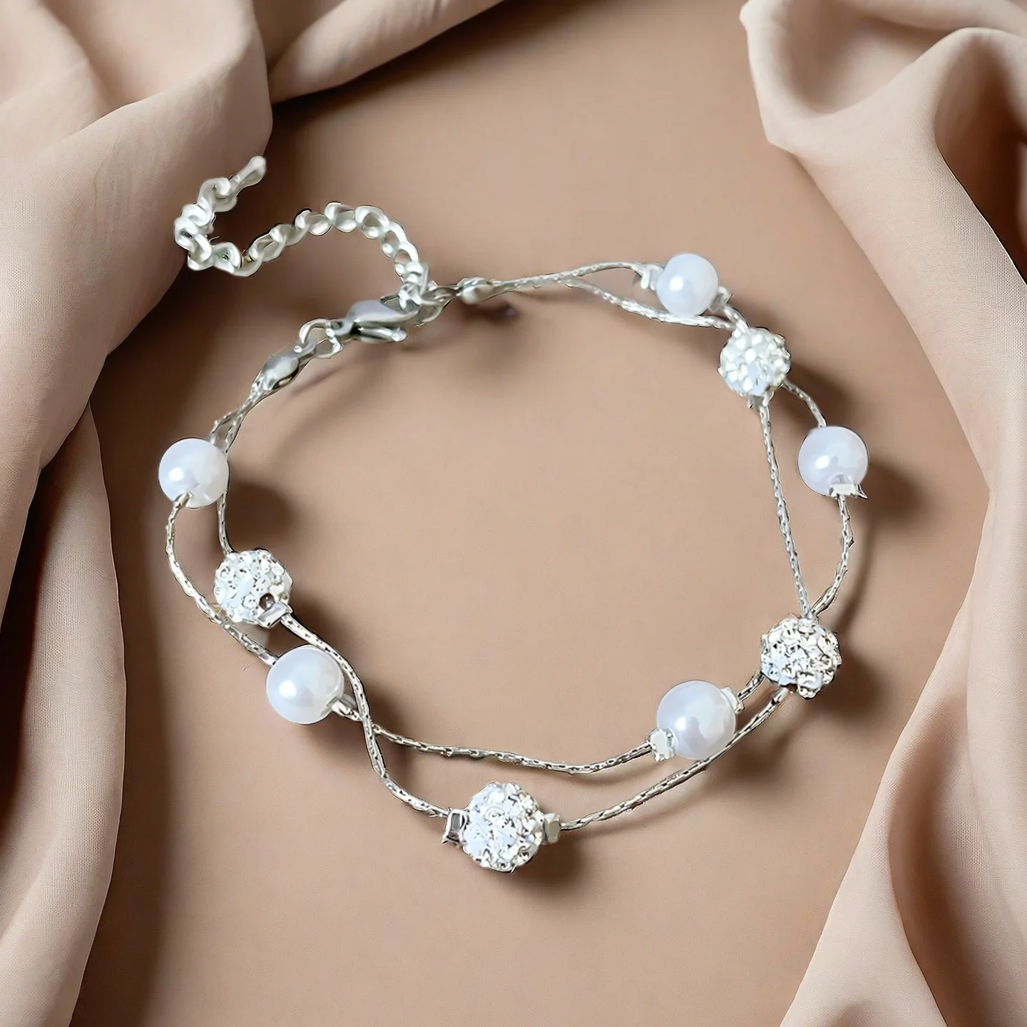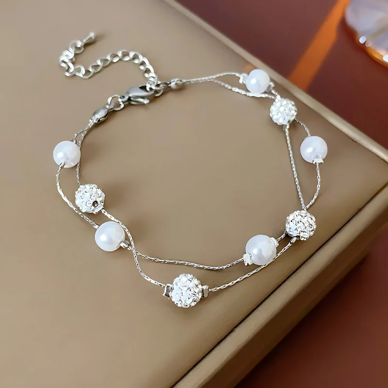 Double Layered Silver Bracelet with Pearl and Crystal Beads Elegant Women's Jewelry Perfect for Daily Wear Joias De Luxo