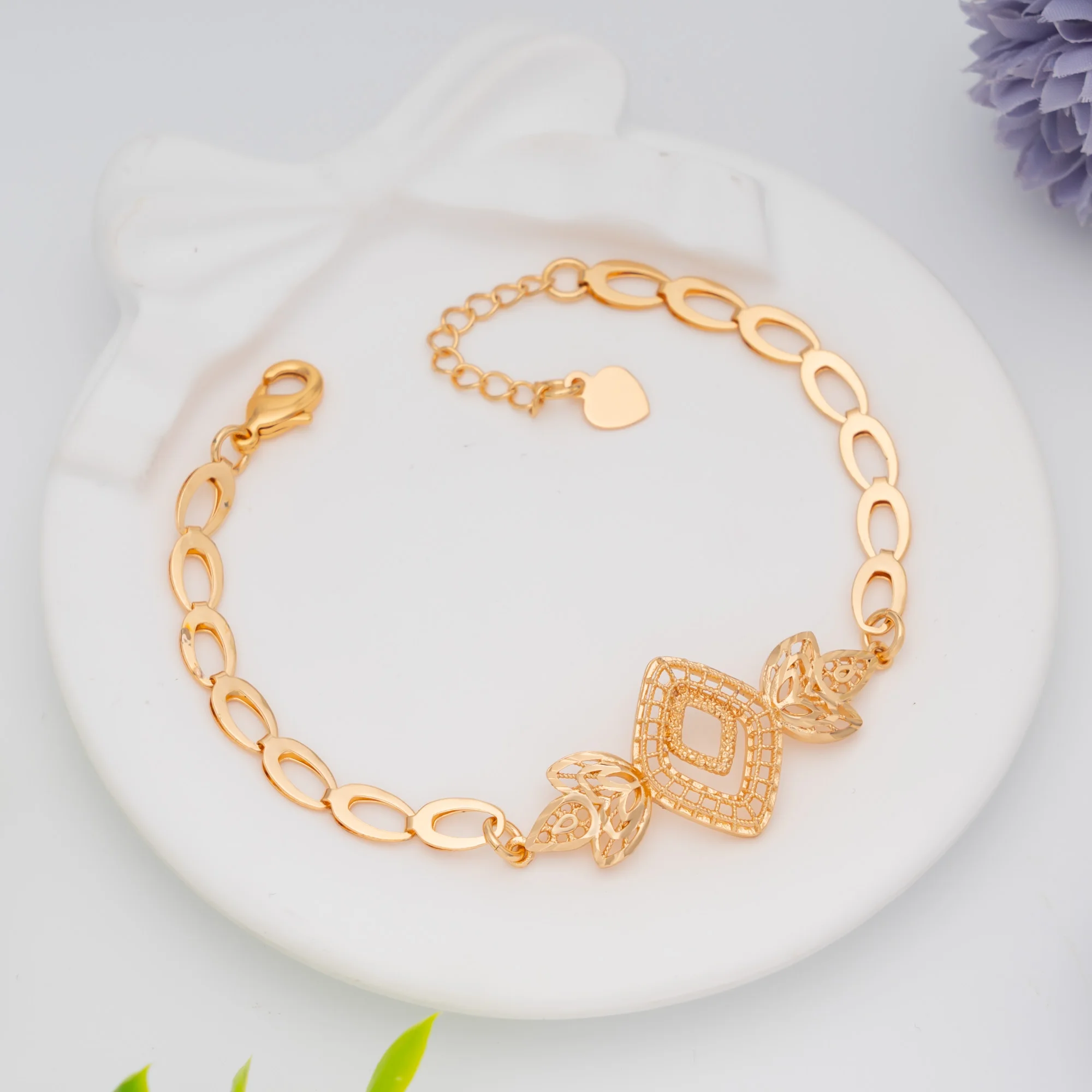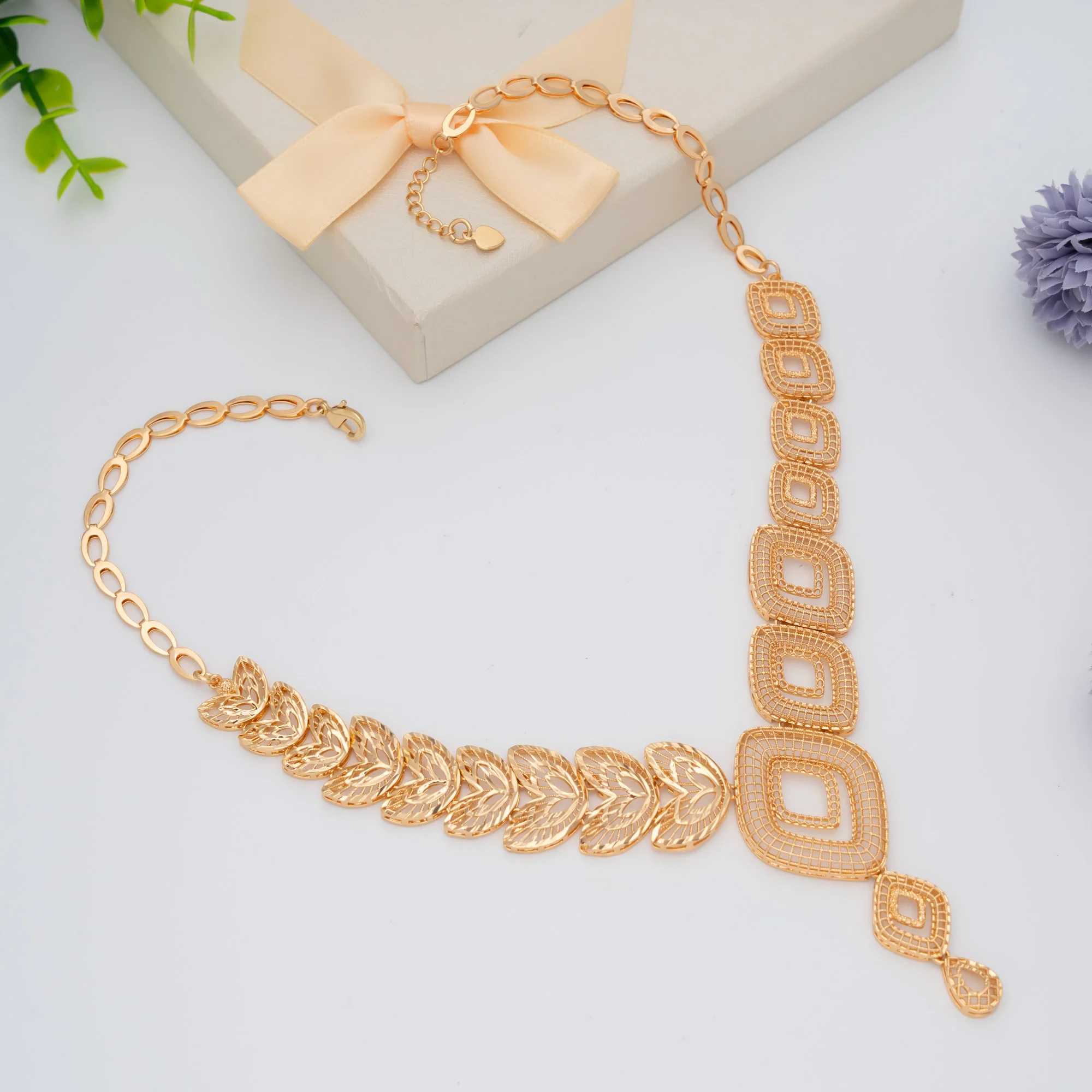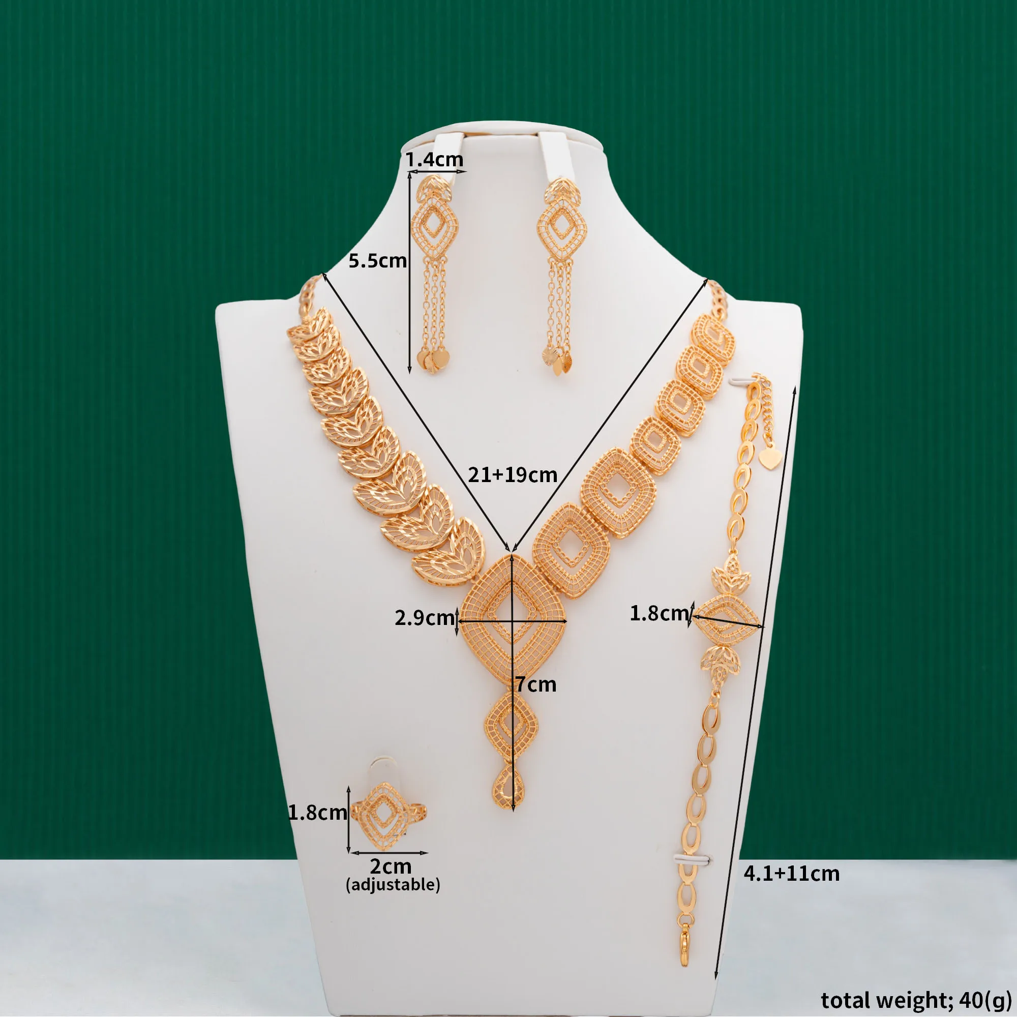 Handmade Women's 14K Gold Plated Copper Jewelry Set with Necklace Bracelet Earrings Ring for Wedding Engagement Party