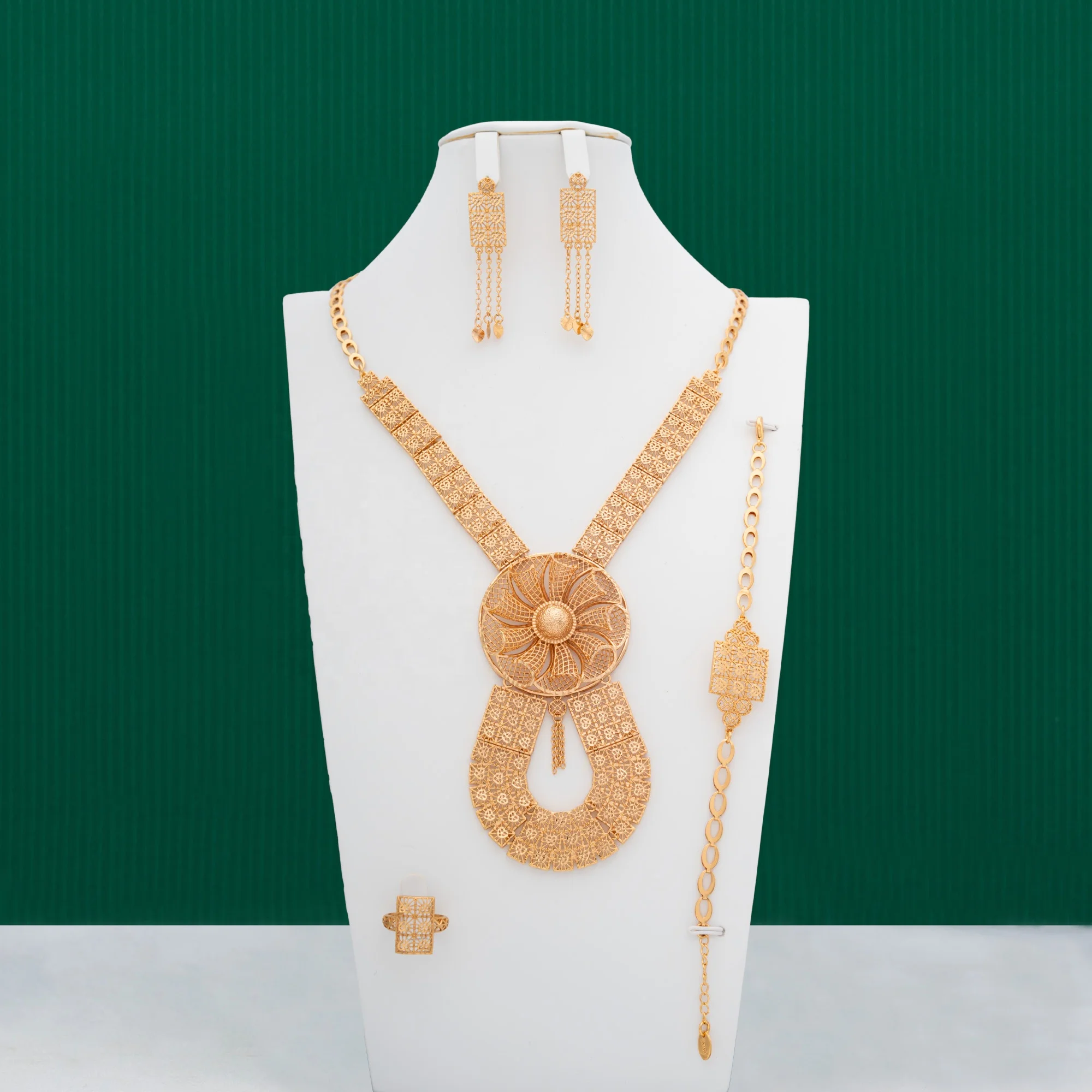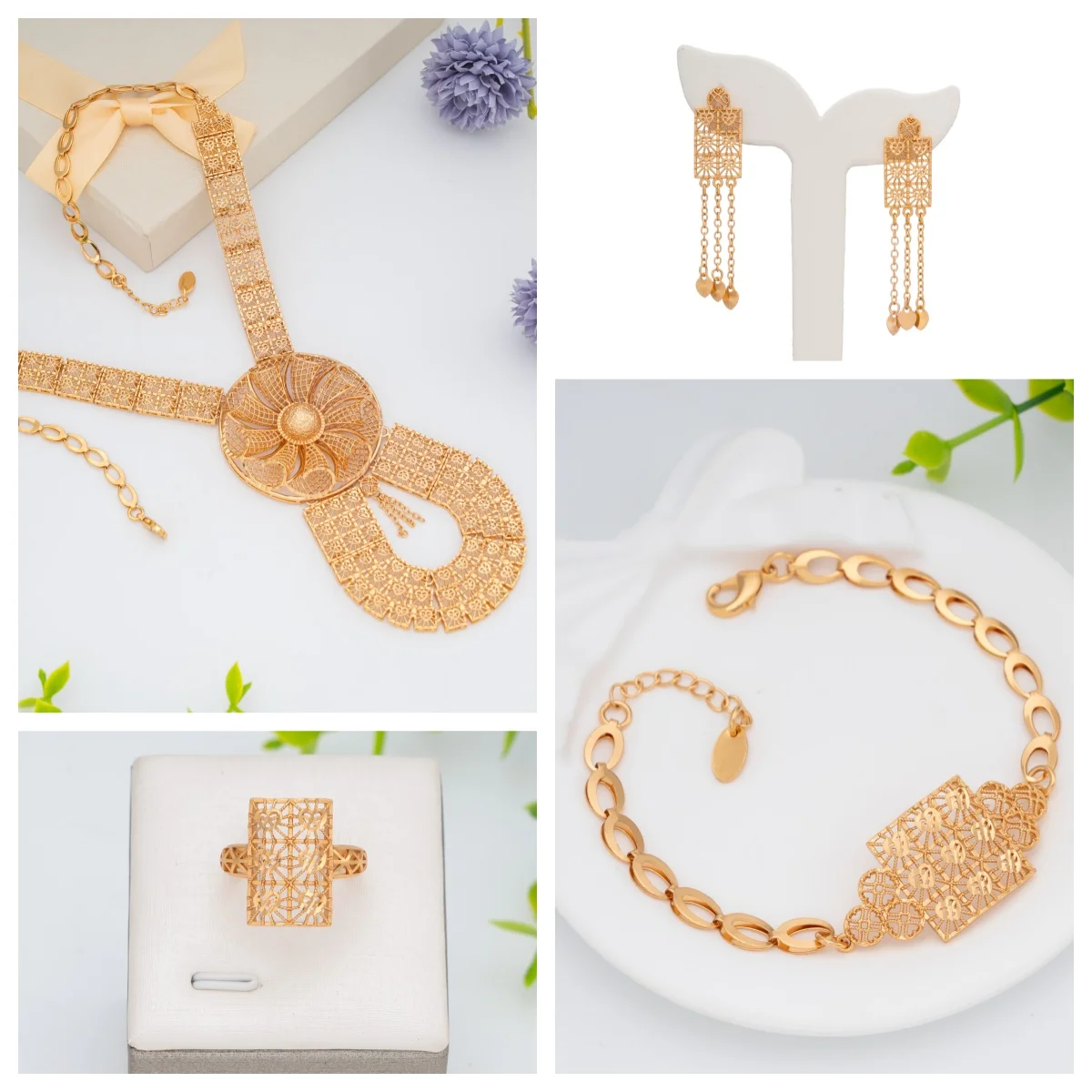 Dongli Women's Wedding Engagement Four-Piece Gold-Plated Jewelry Set Exquisite Hollow-Ring Design