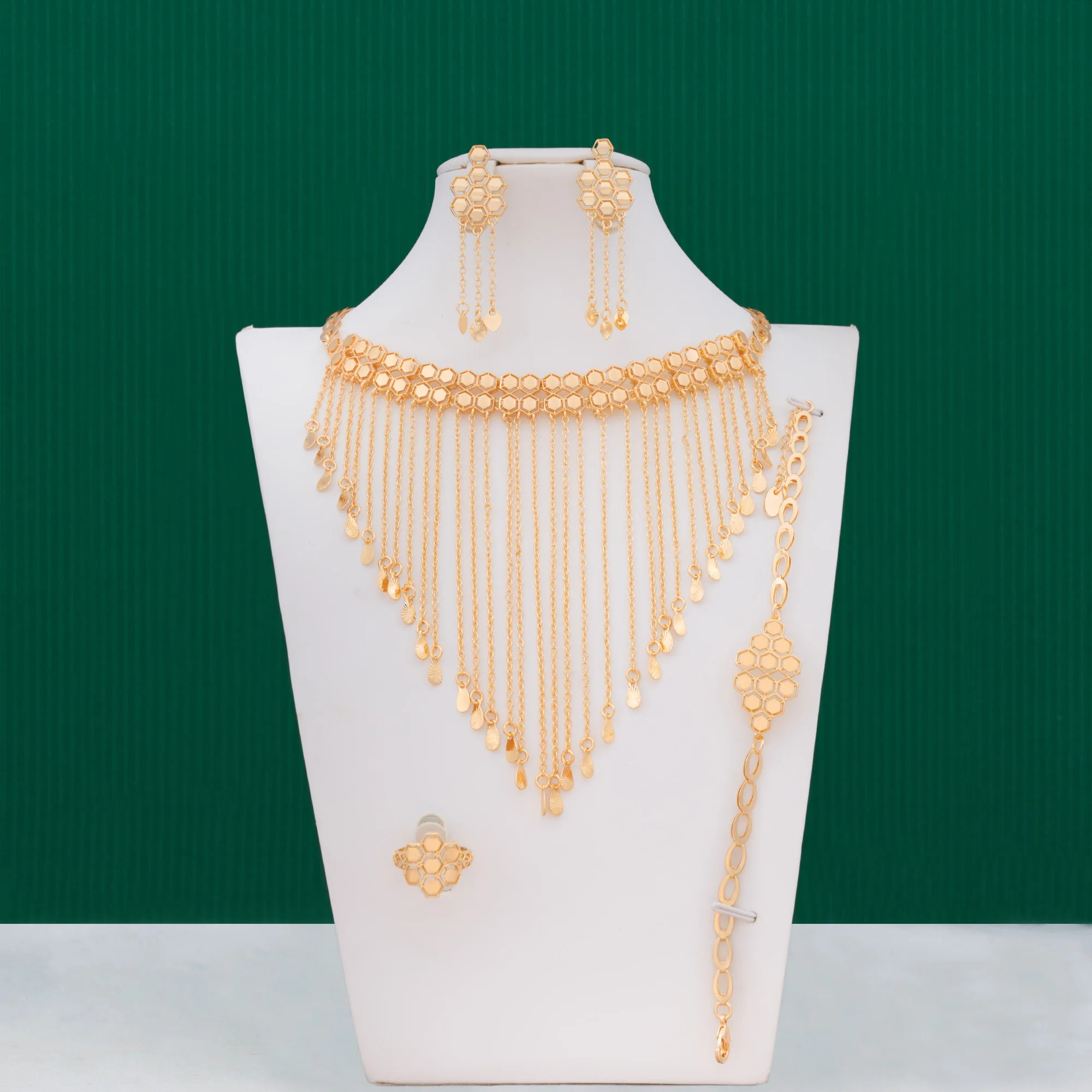 Dongli Gorgeous Jewelry Set: Intricate Honeycomb Design with Delicate Tassels, Earring, Bracelet, and Ring for Elegant Style