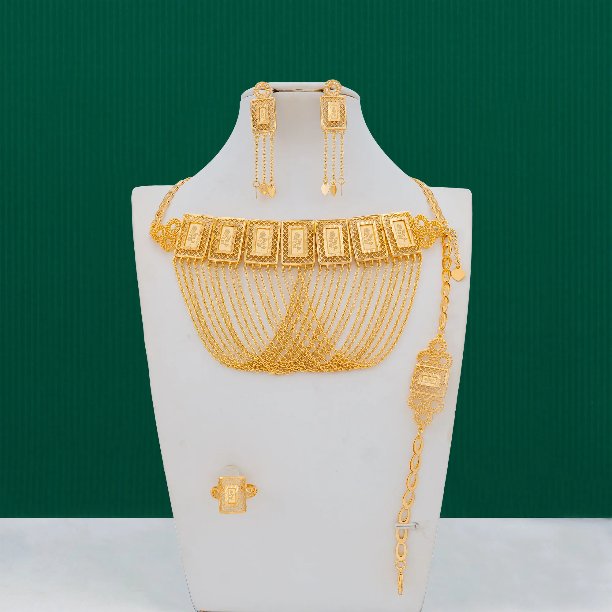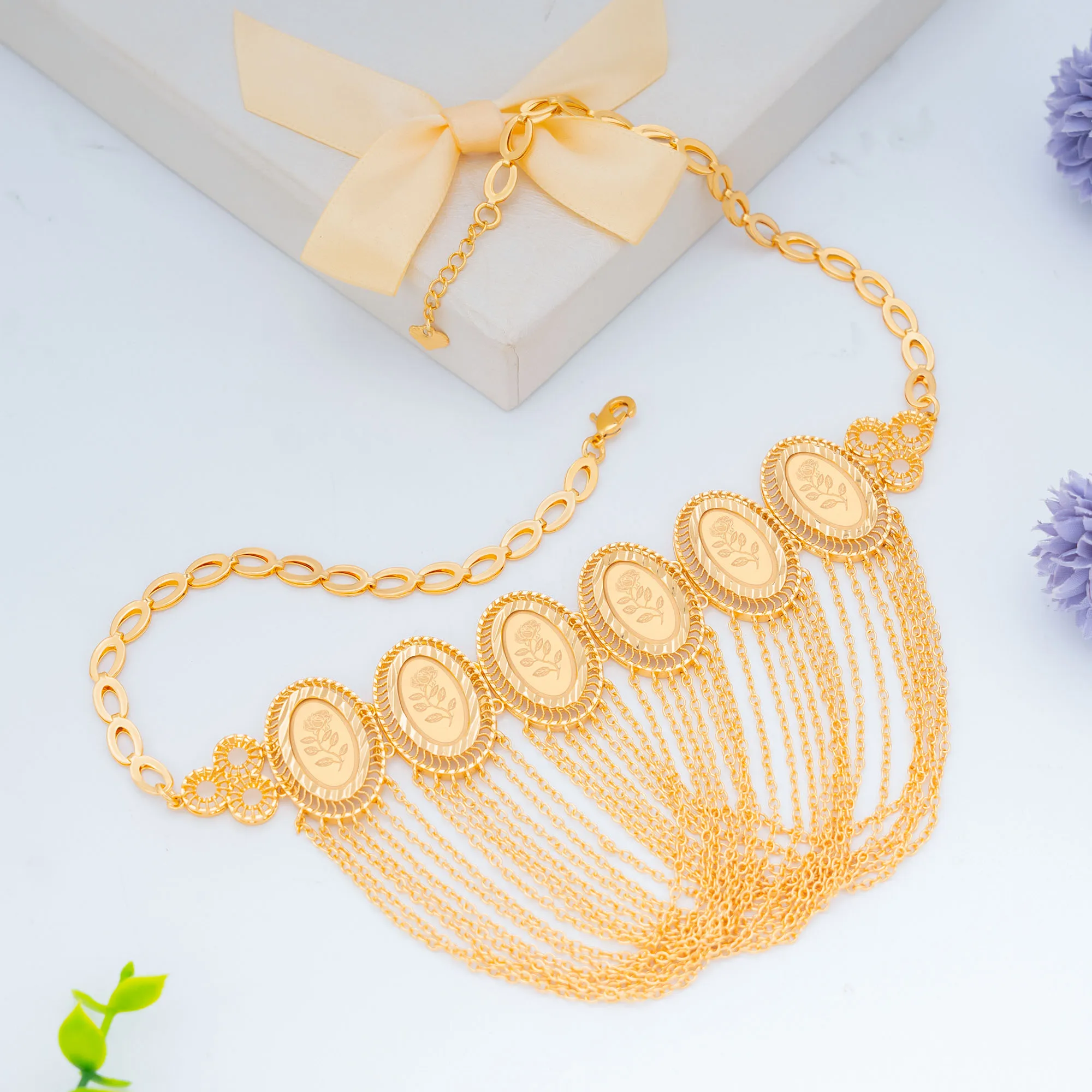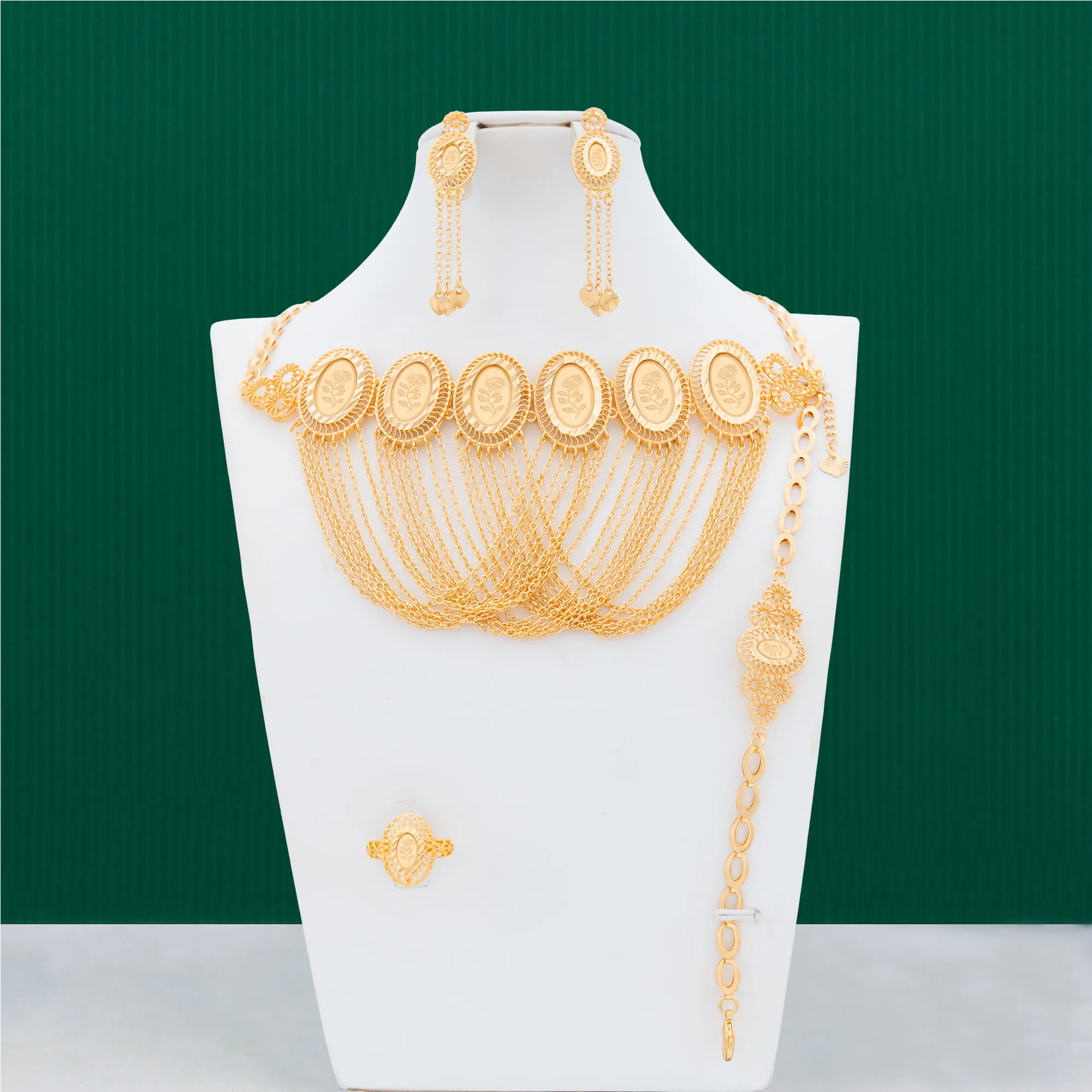 Dongli Jewelry Middle Eastern Style Laser Rose Tassel Jewelry Set,Ramadan Hot Sale,Brass Necklace, Bracelet, Earrings & Ring