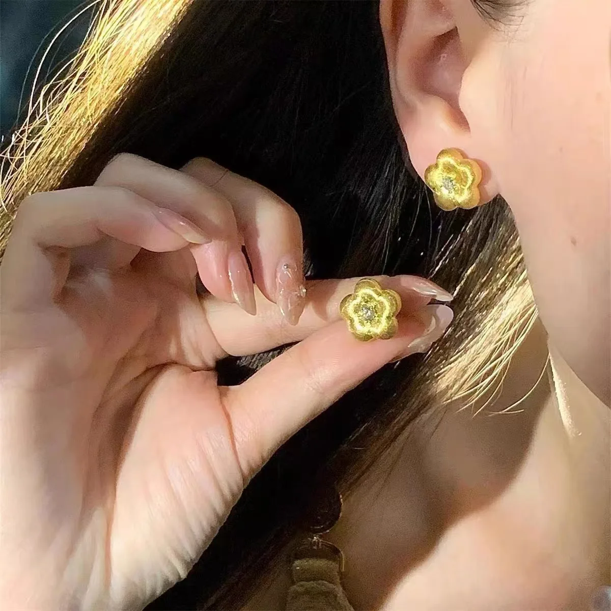 Trendy Christian Gold Flower Four Clawed Stud Earrings 18k Gold AU750 Rhodium Plated Unisex Gift Wedding Anniversary Engagement