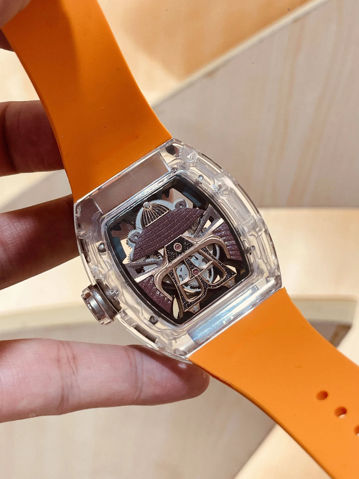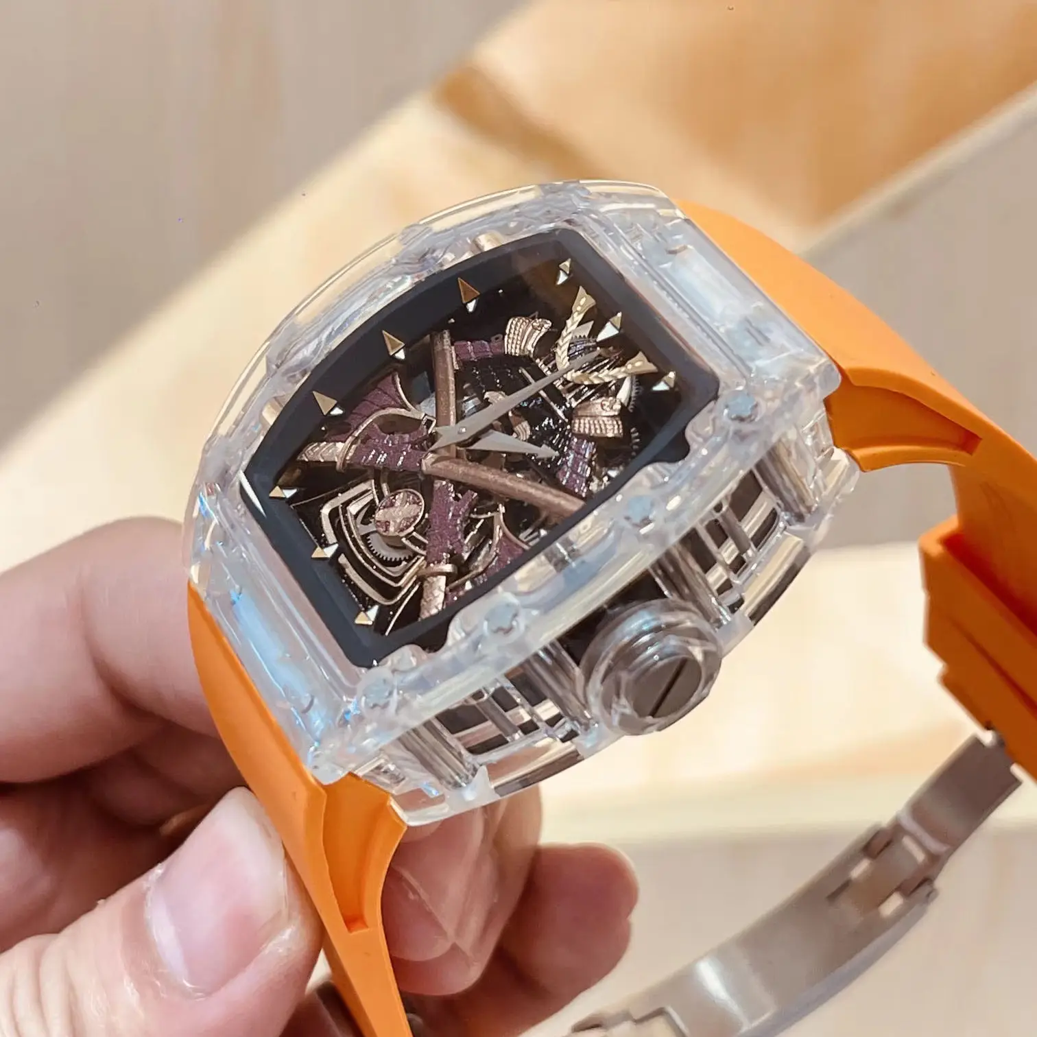 New Luxury Designer Men's Mechanical Watch with Tonneau-shaped Orange Transparent case High-quality Business Sports Casual Watch