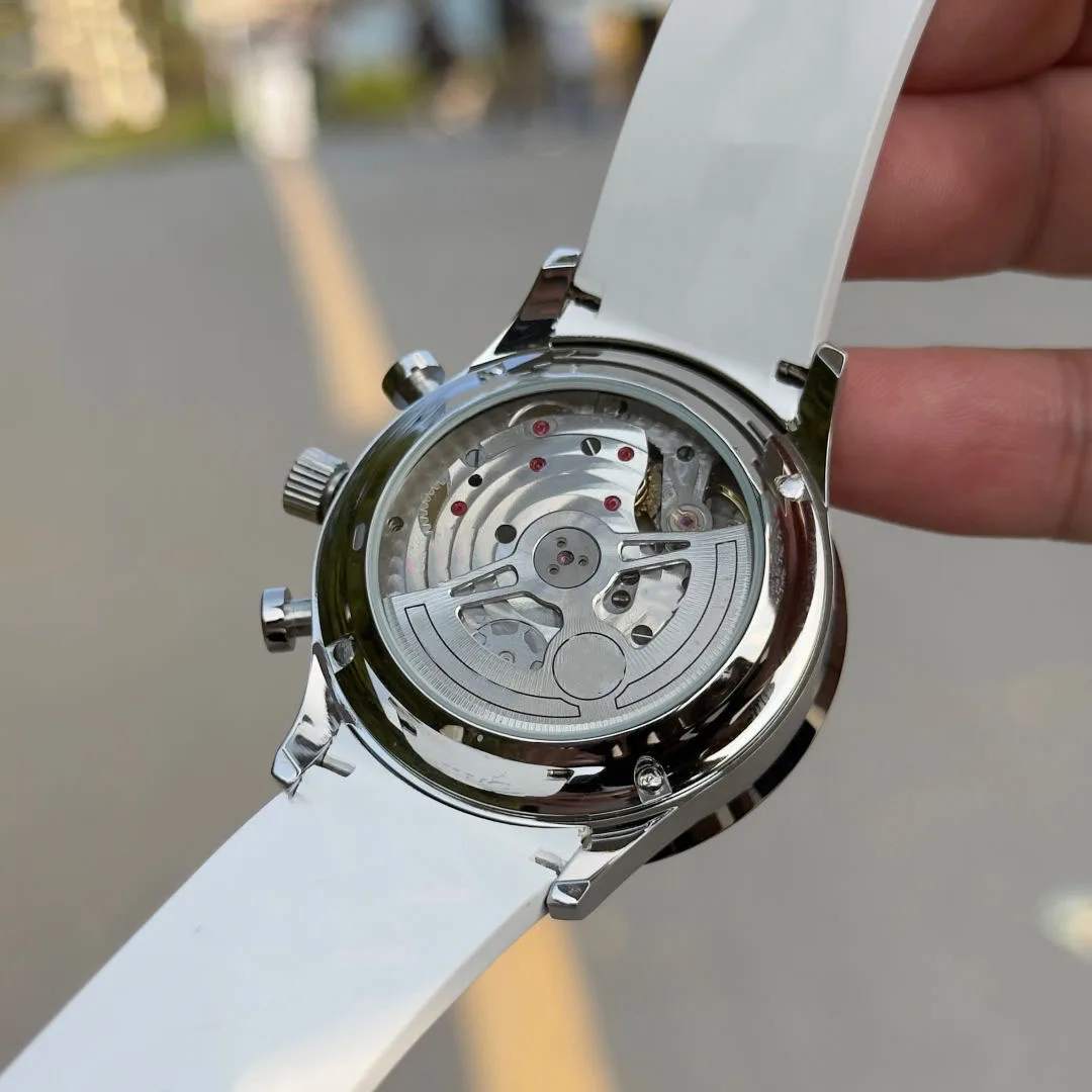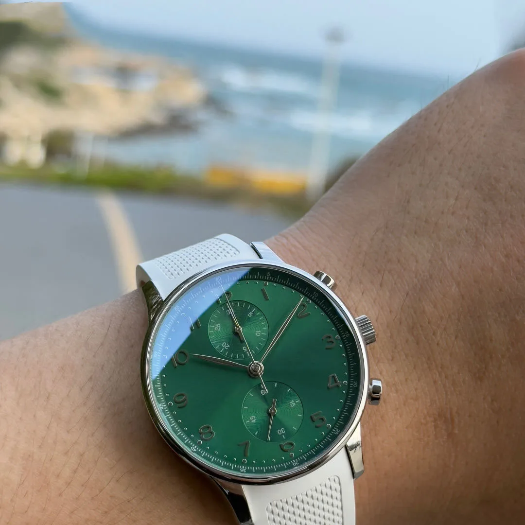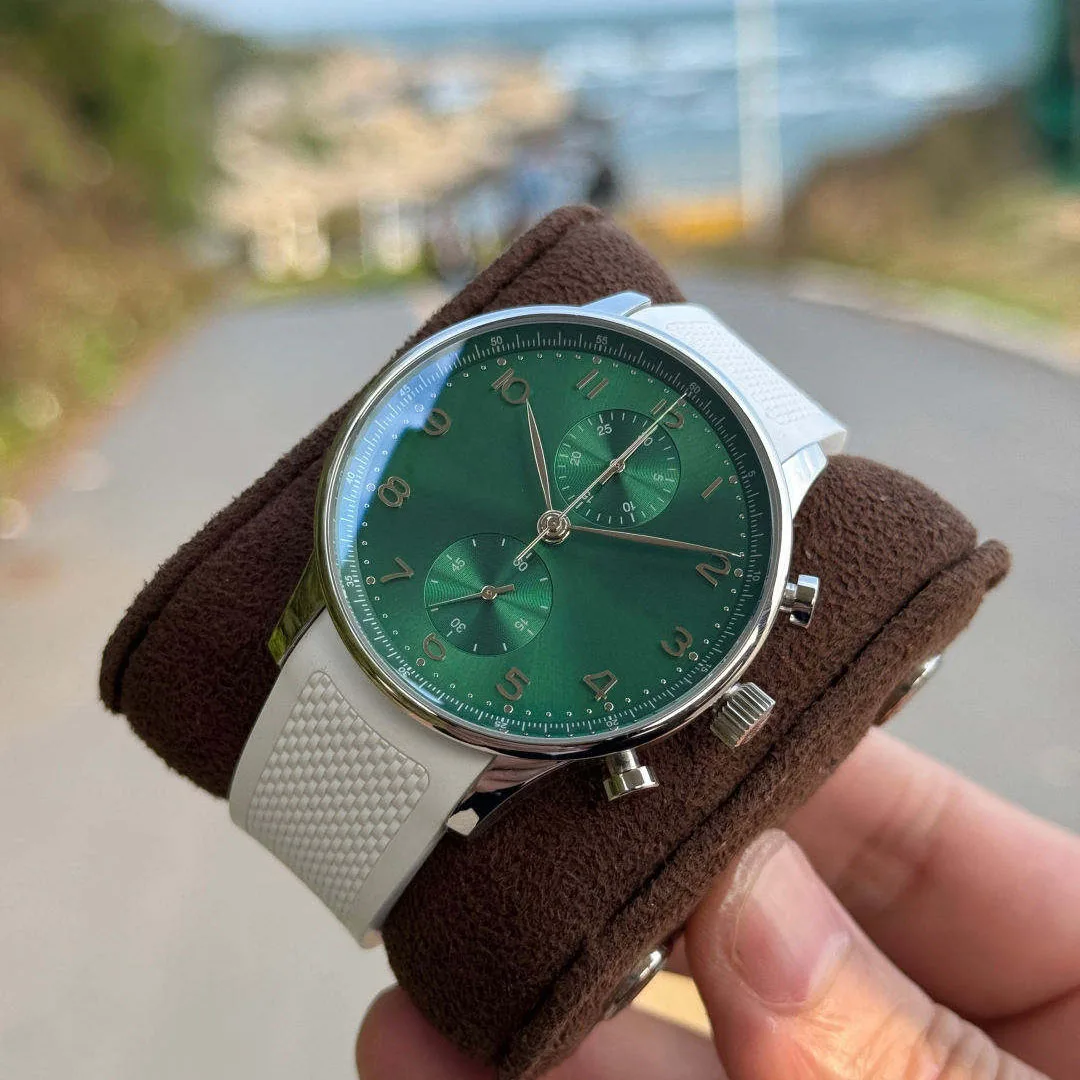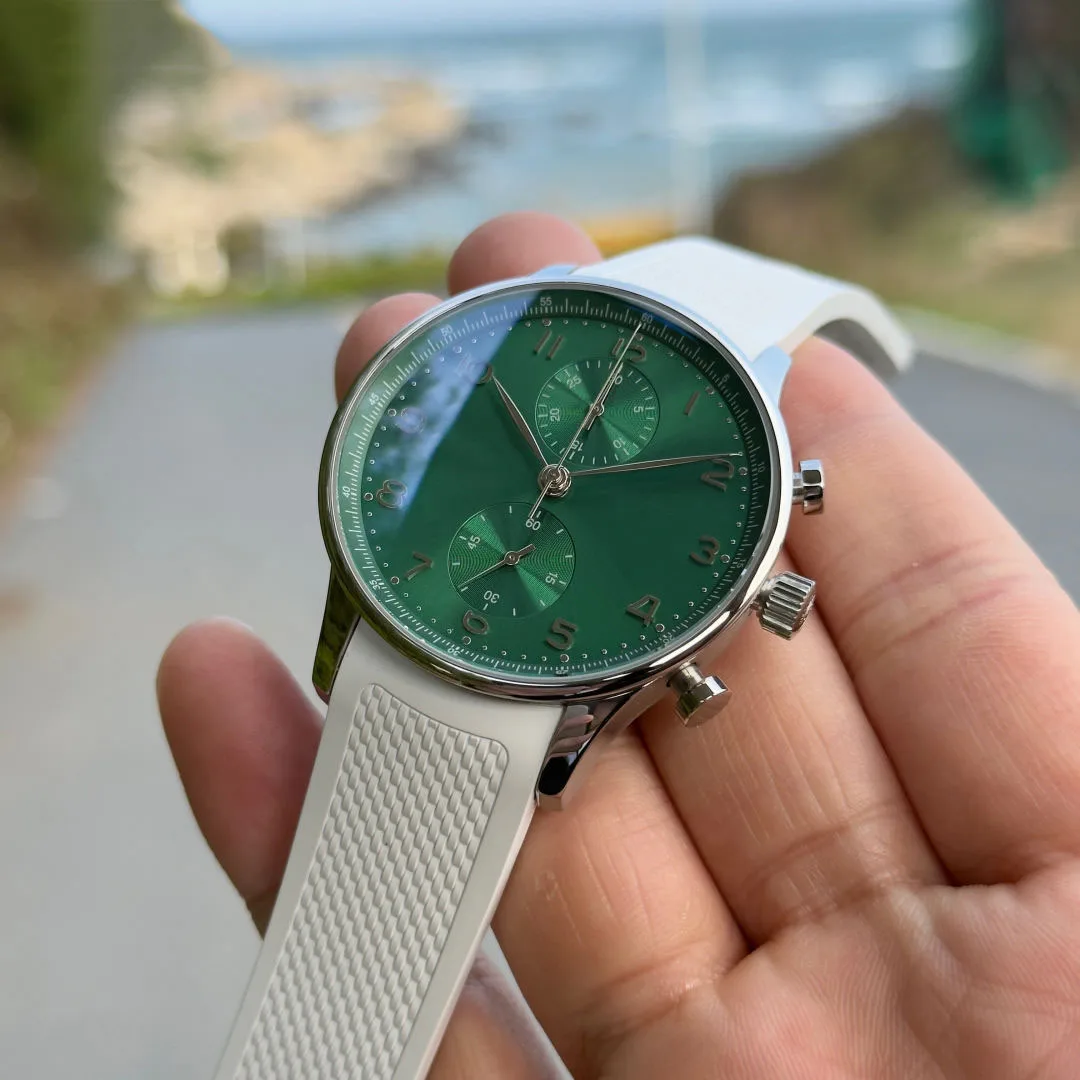New Luxurious and Stylish Green Dial Chronograph Men's Watch with White Silicone Strap Business Casual Outdoor Mechanical Watch