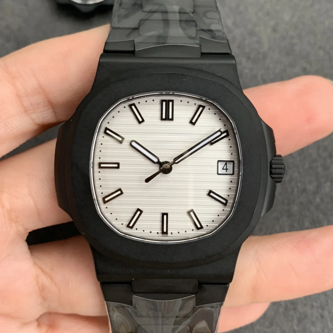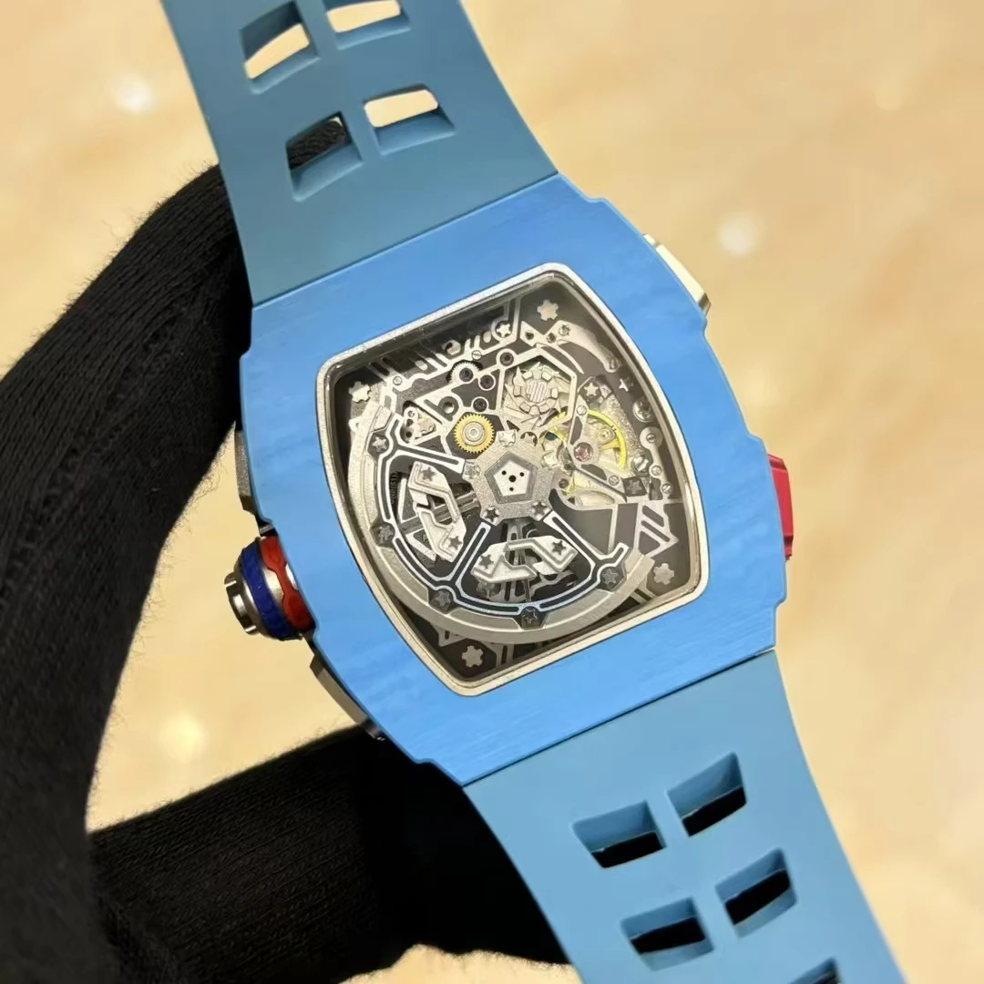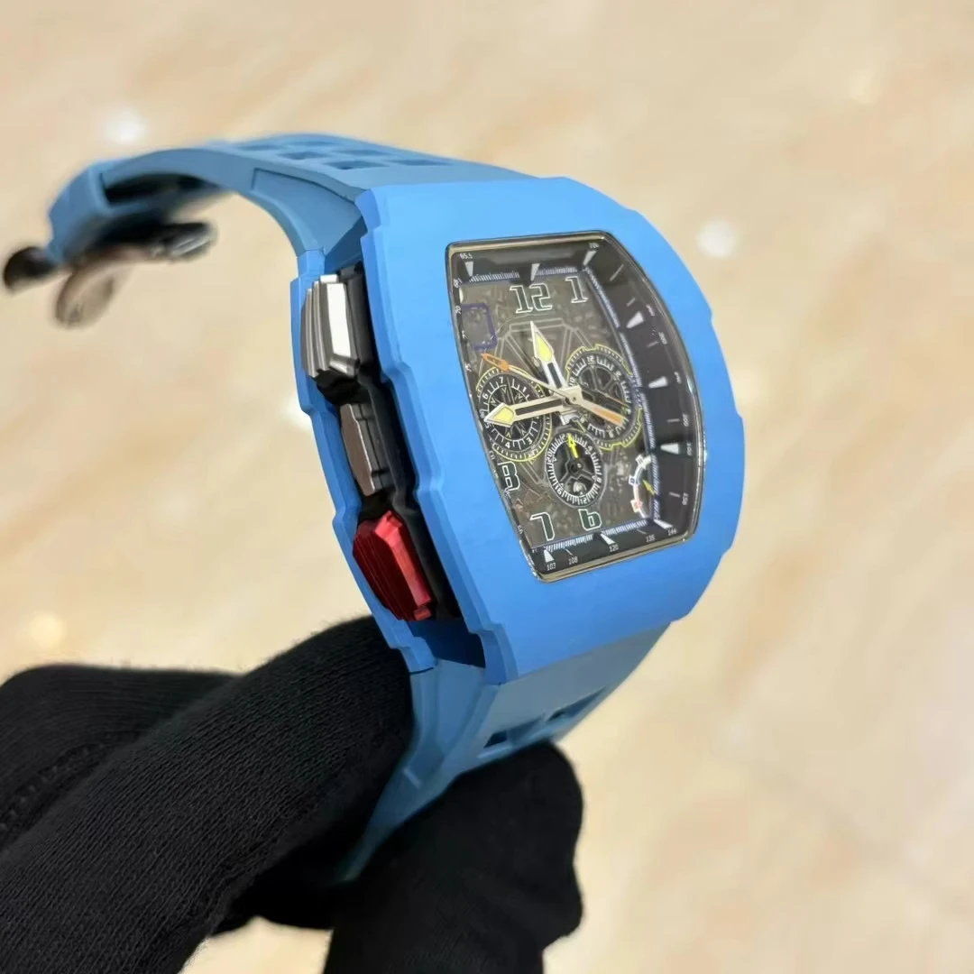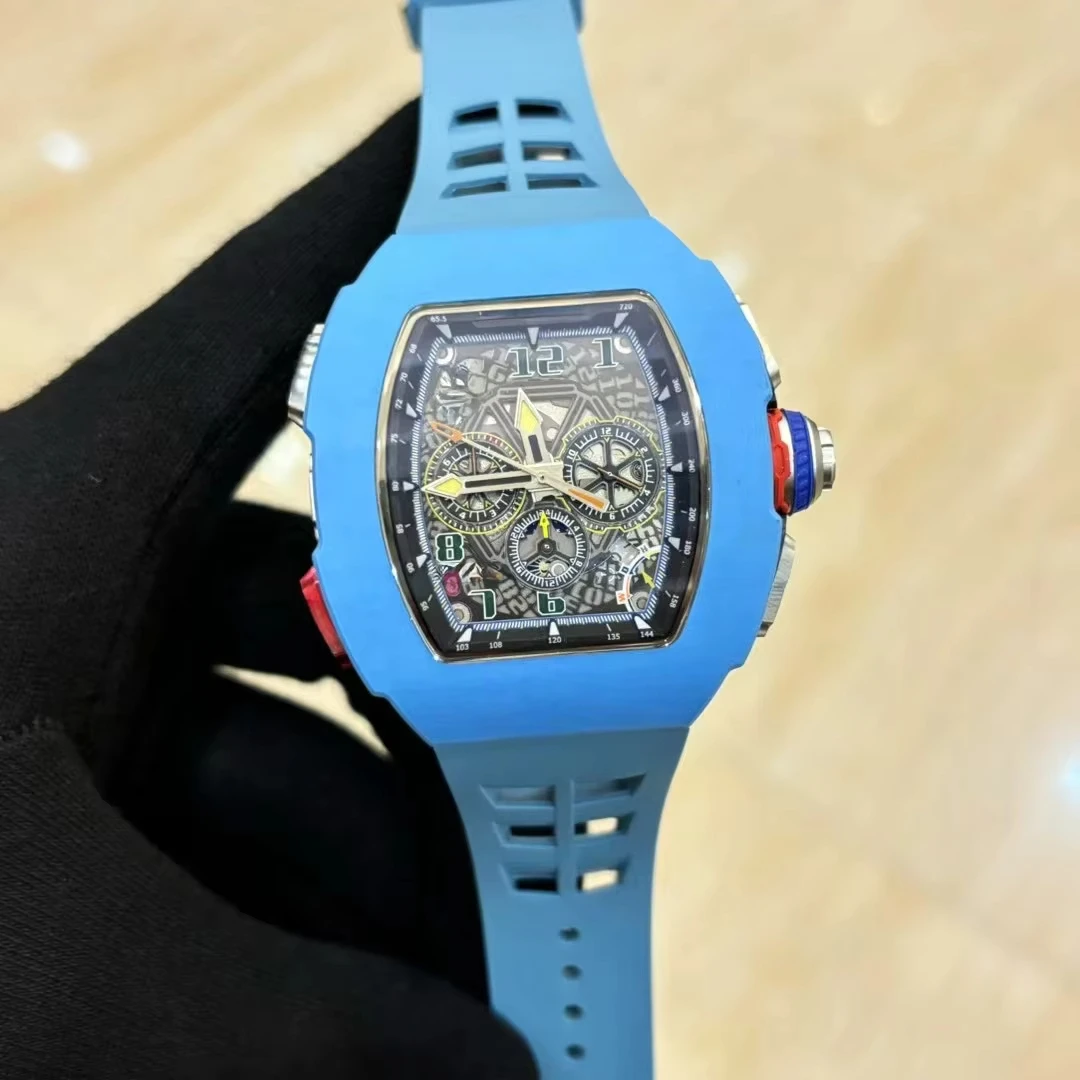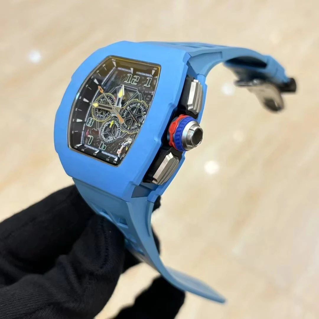 NewBlue Carbon Fiber Case Barrel-Shaped Rubber Strap Mechanical Watch Three-Eye Design Vintage Party Retro Automatic Men's Watch