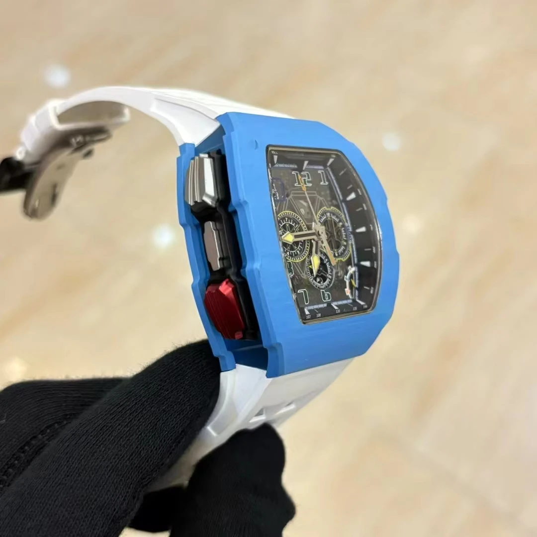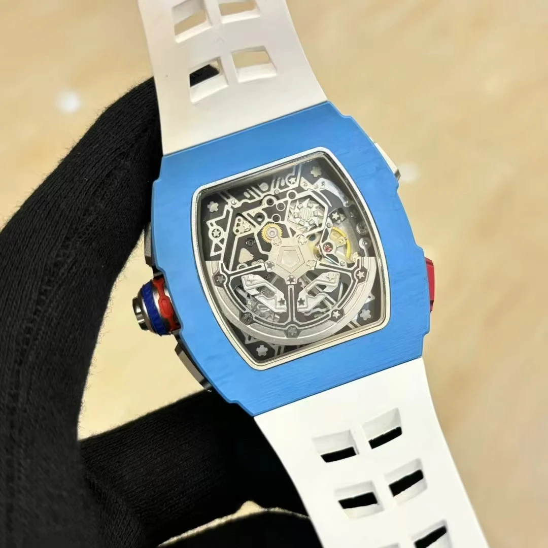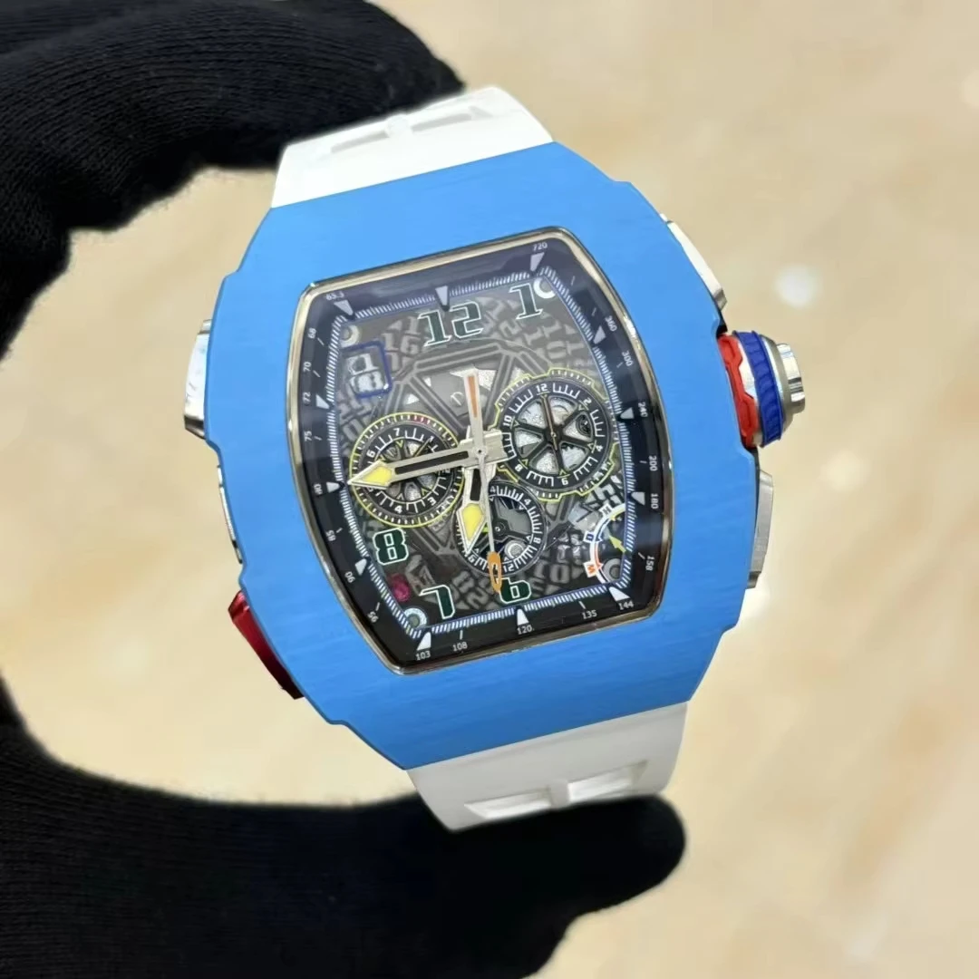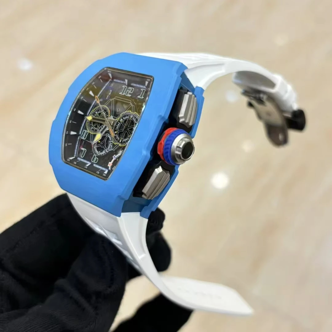 New Hot Selling Barrel-shaped Blue Carbon Fiber case with Rubber Strap Mechanical Watch Three-eye Design Casual Watches for Men