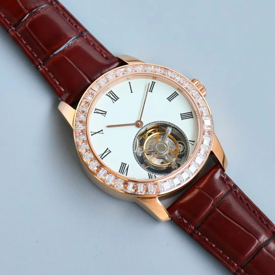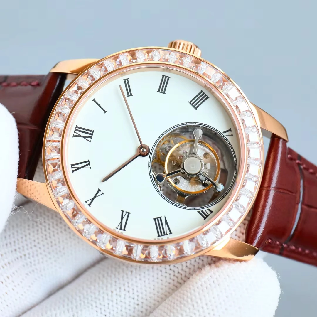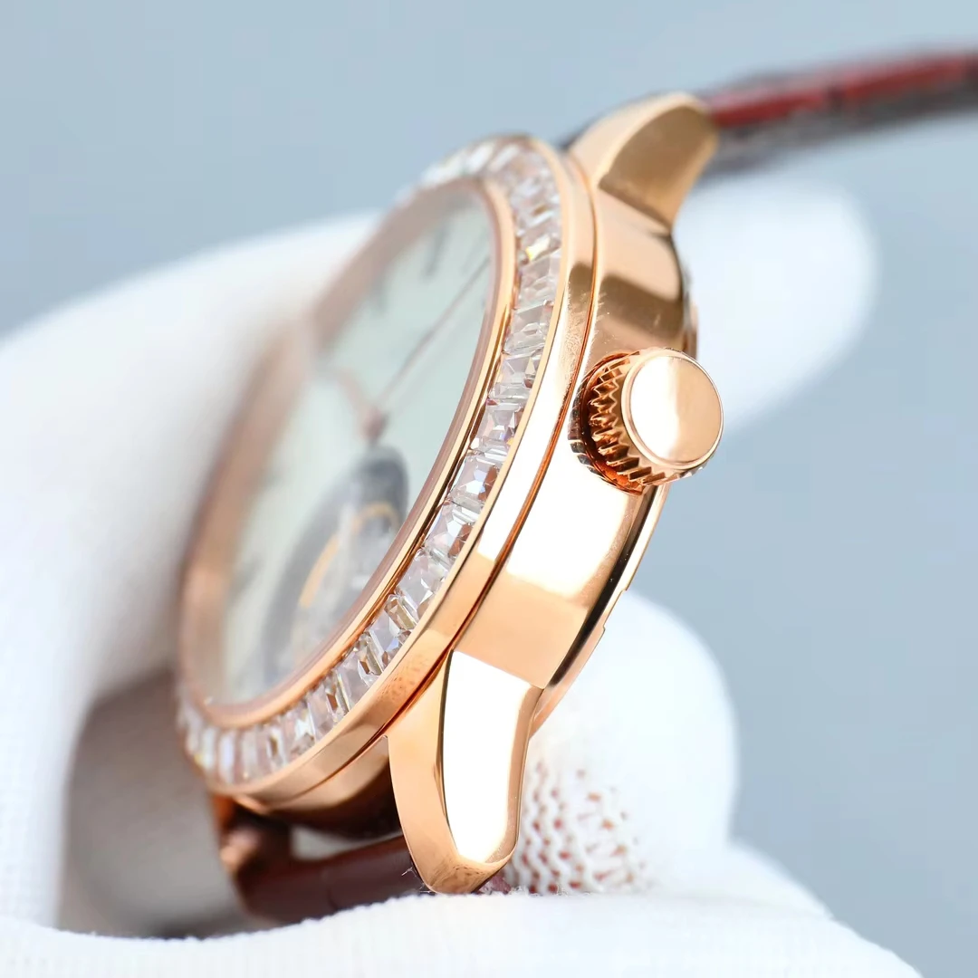 New High-quality Rose Gold case Diamond-set Bezel Men's Mechanical Watch alligator Leather Strap Automatic Luxury Brand Watches