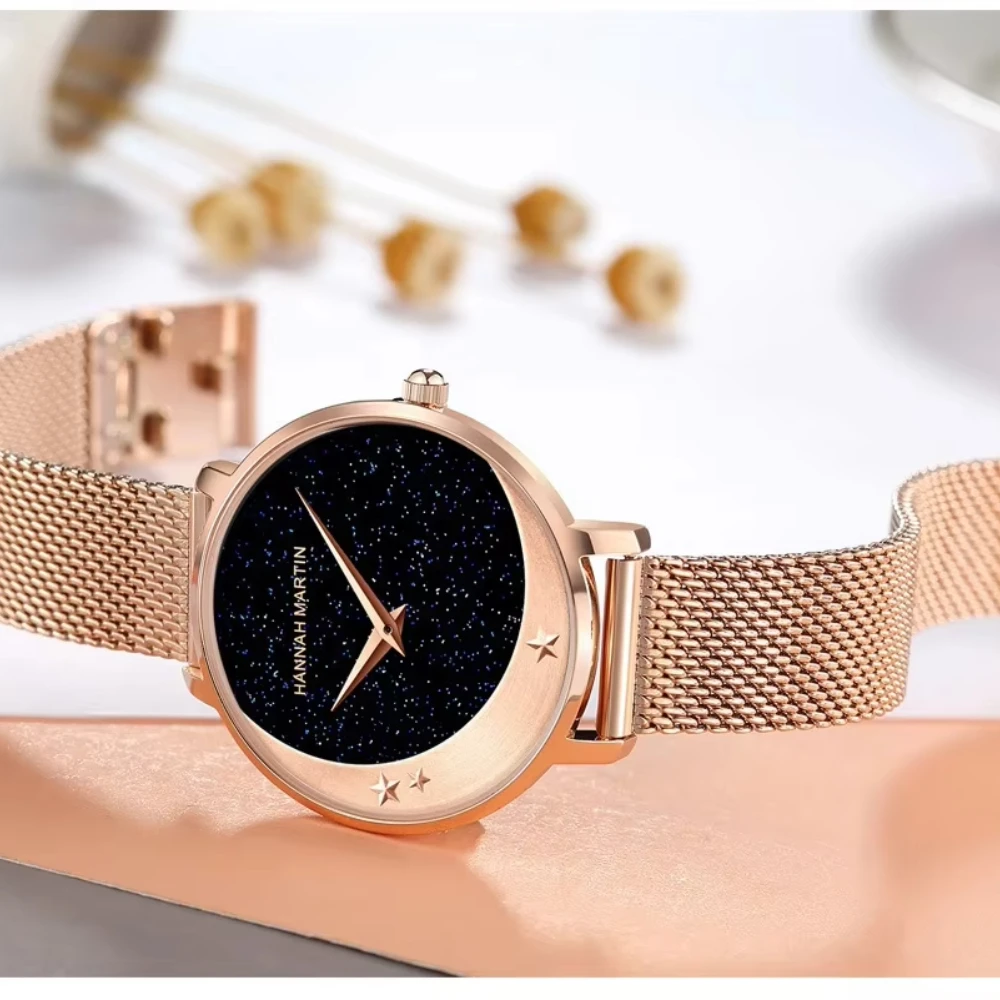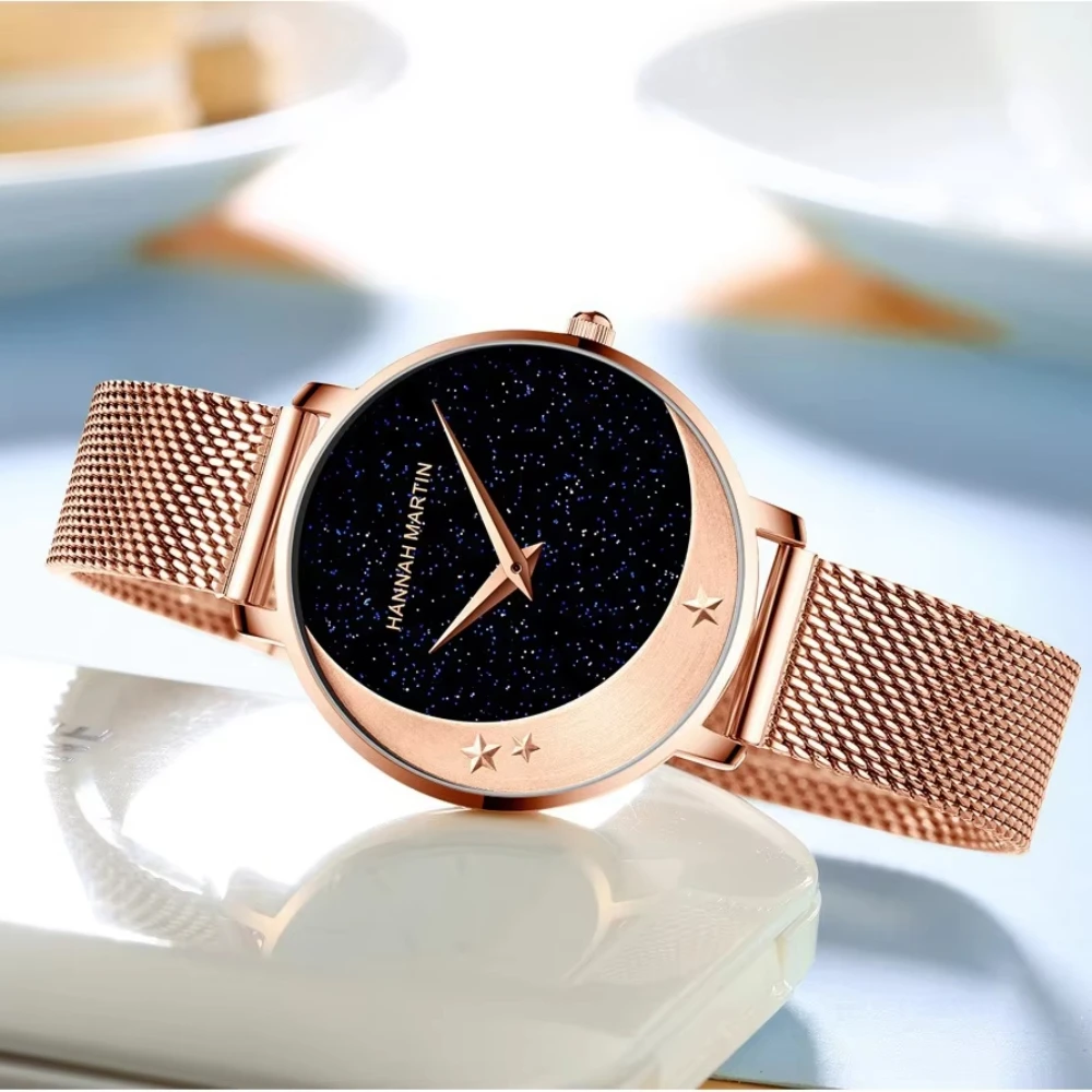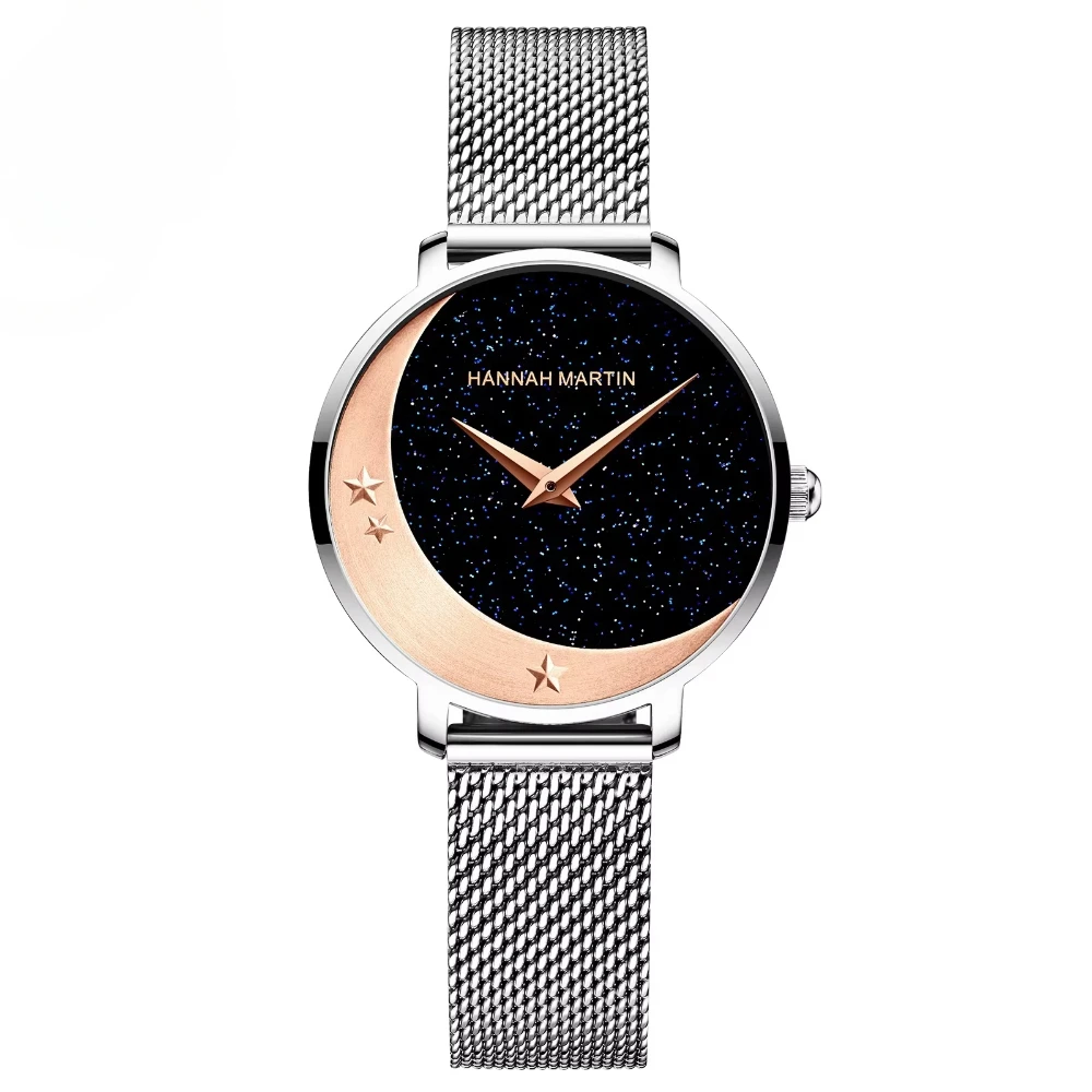 High Quality Women Quartz Watch Movement Stainless Steel Wristwatch Moon Stars Night Flash Watches for Women