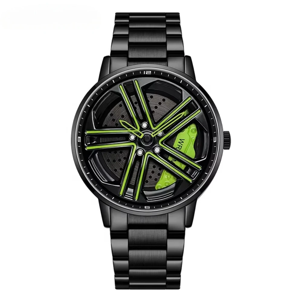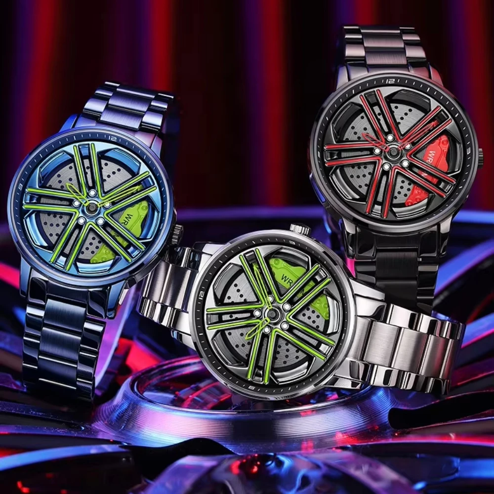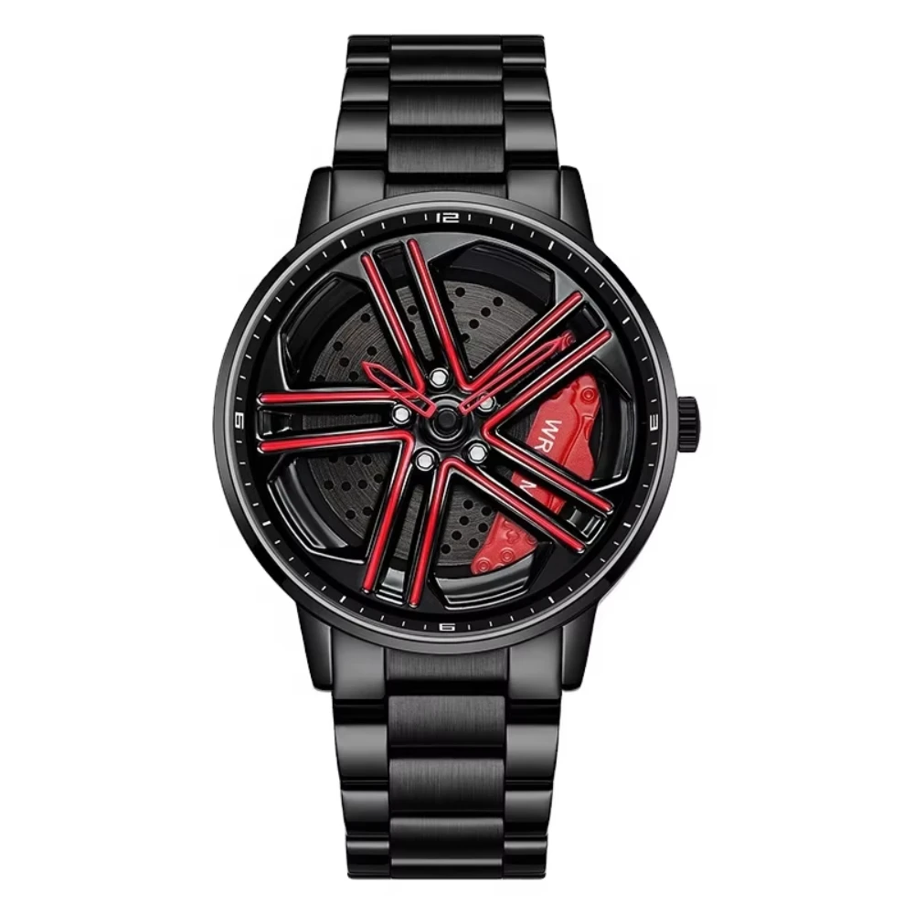 Hot Sale Waterproof Quartz Skeleton Men Car Wheel Watch Stainless Steel Band Sports Rotating Spinning Watch