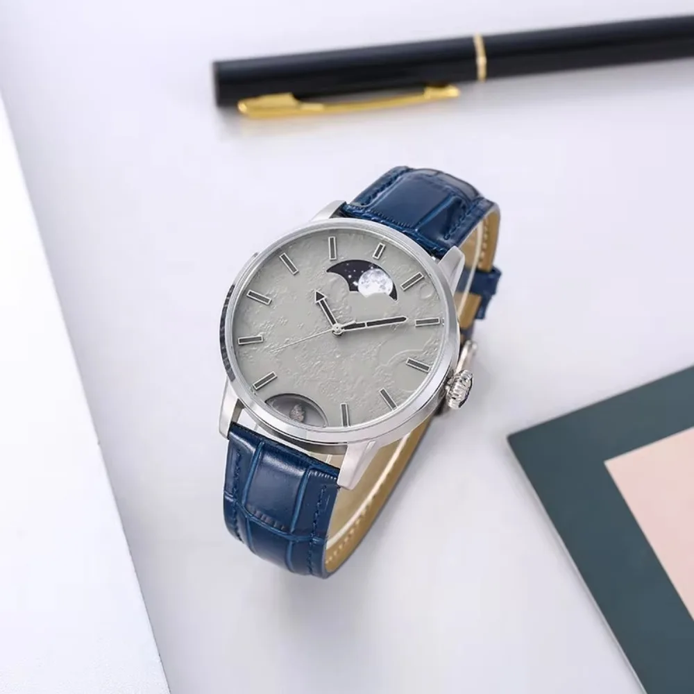 High End Space Meteorite Dial Stainless Steel Watches Men Wrist Leather Strap Moon Phase Quartz Watch for Men