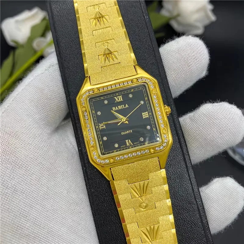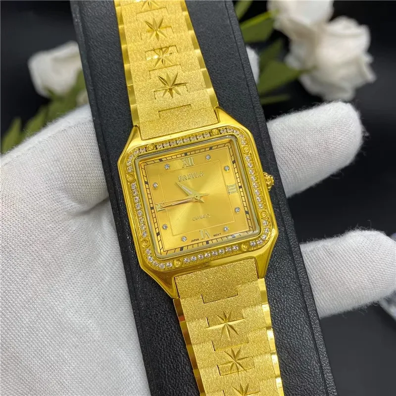 New Luxury 24K Gold Men Watches Square Big Dial European Retro Carved Diamonds Crystal Brass Band High End Quartz Watches