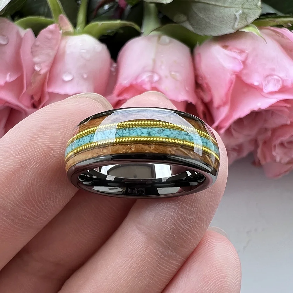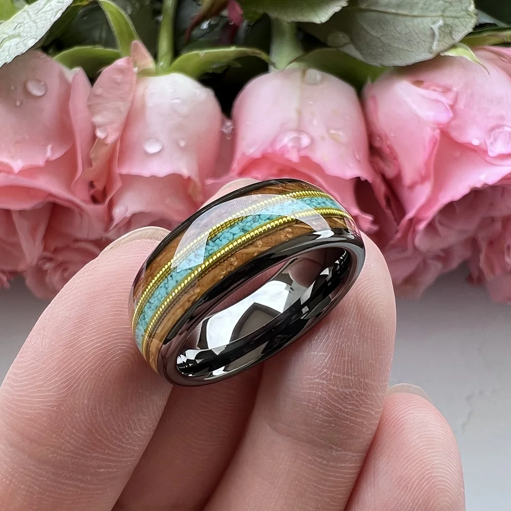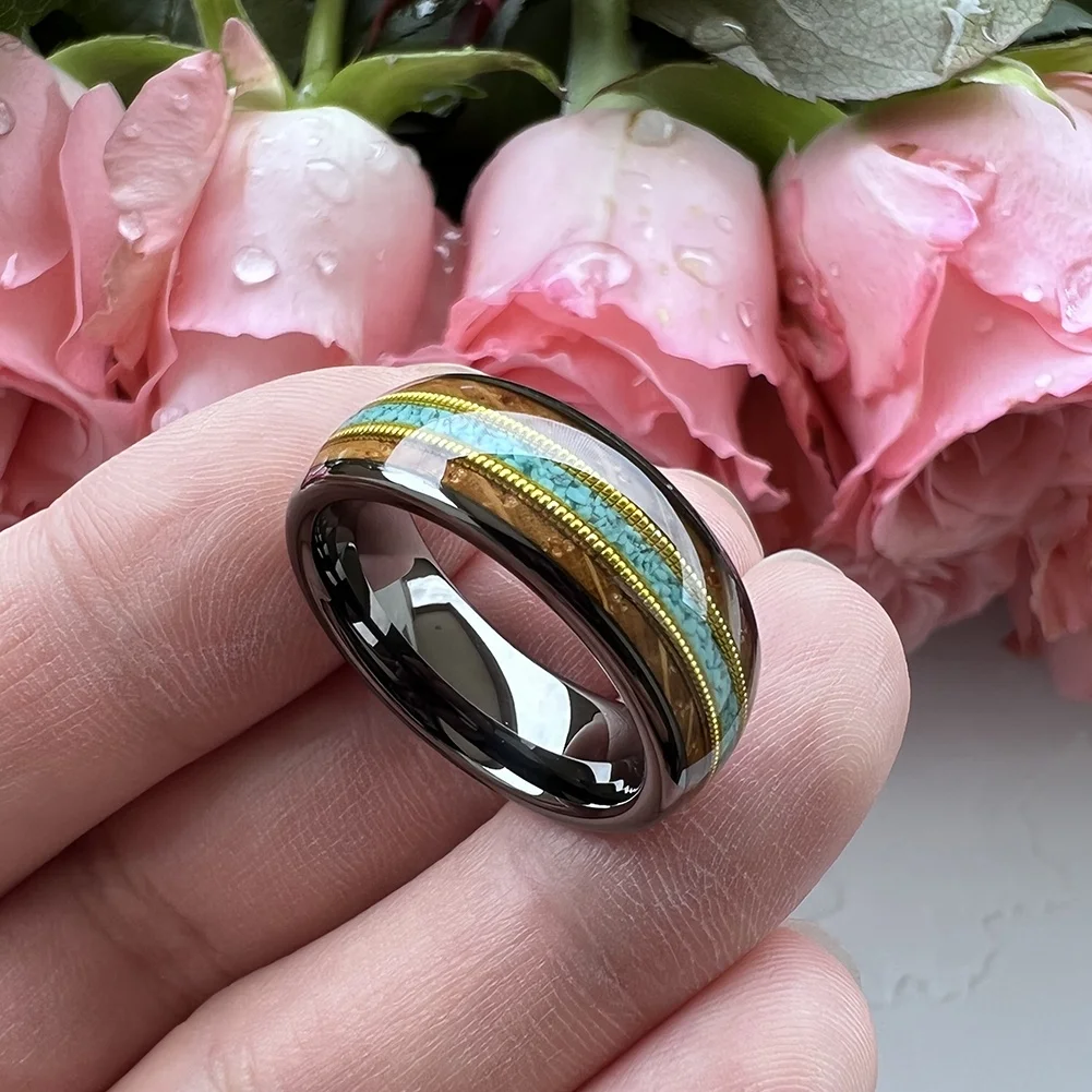 Coolstyle Jewelry 8mm Whisky Wood Guitar String Turquoise Inlay Gunmetal Tungsten Ring for Men Women Engagement Wedding Band