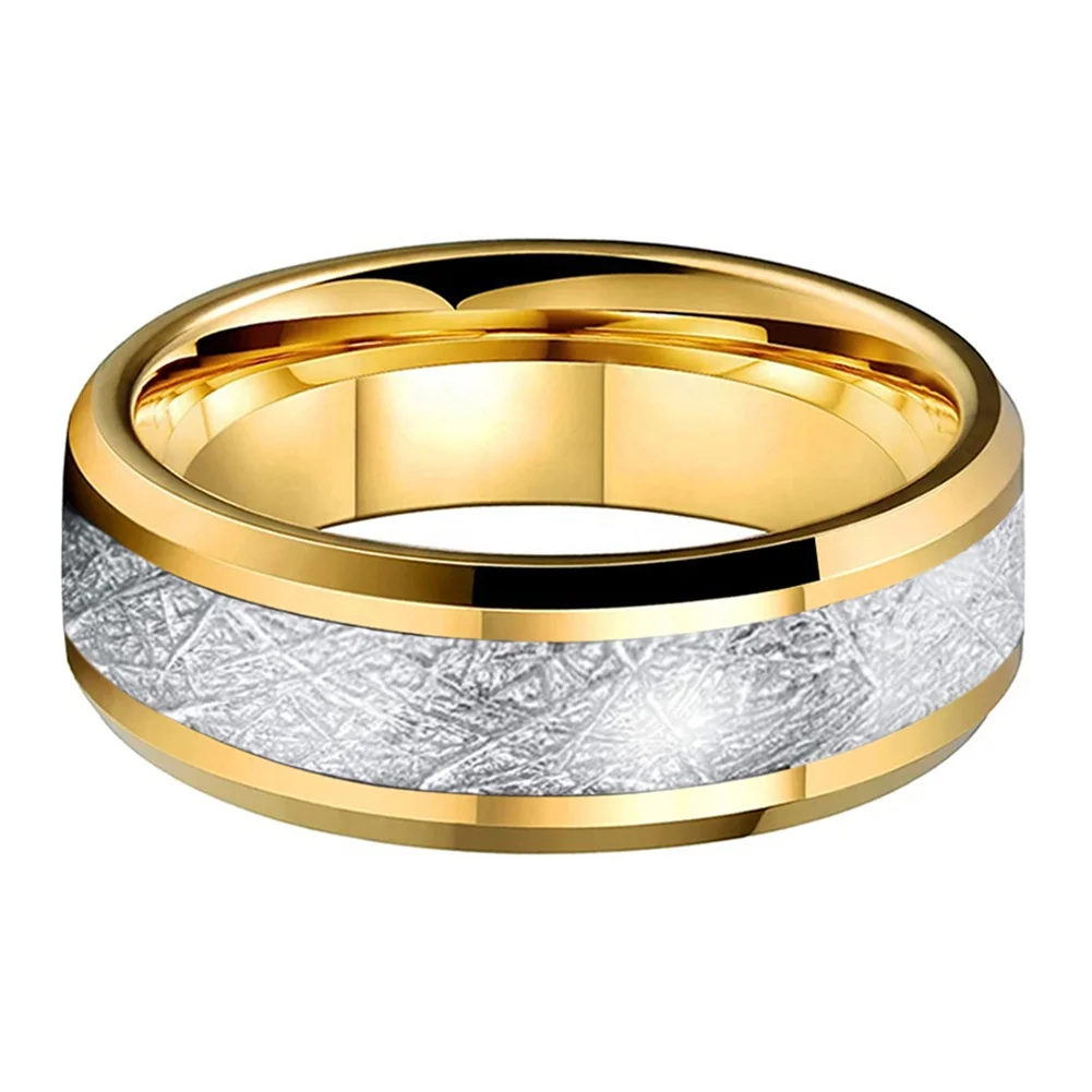 Coolstyle Jewelry 8mm Wholesale Meteorite Inlay Beveled Gold Tungsten Ring for Men Women Fashion Engagement Wedding Band
