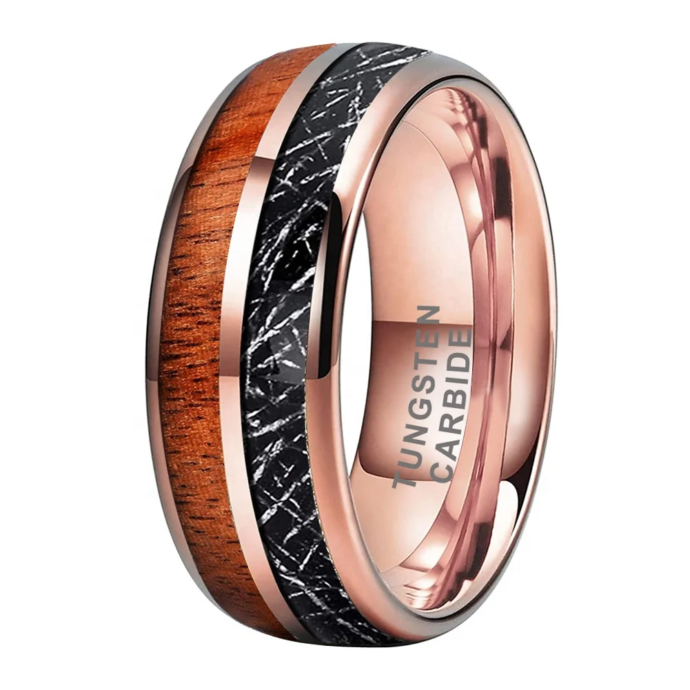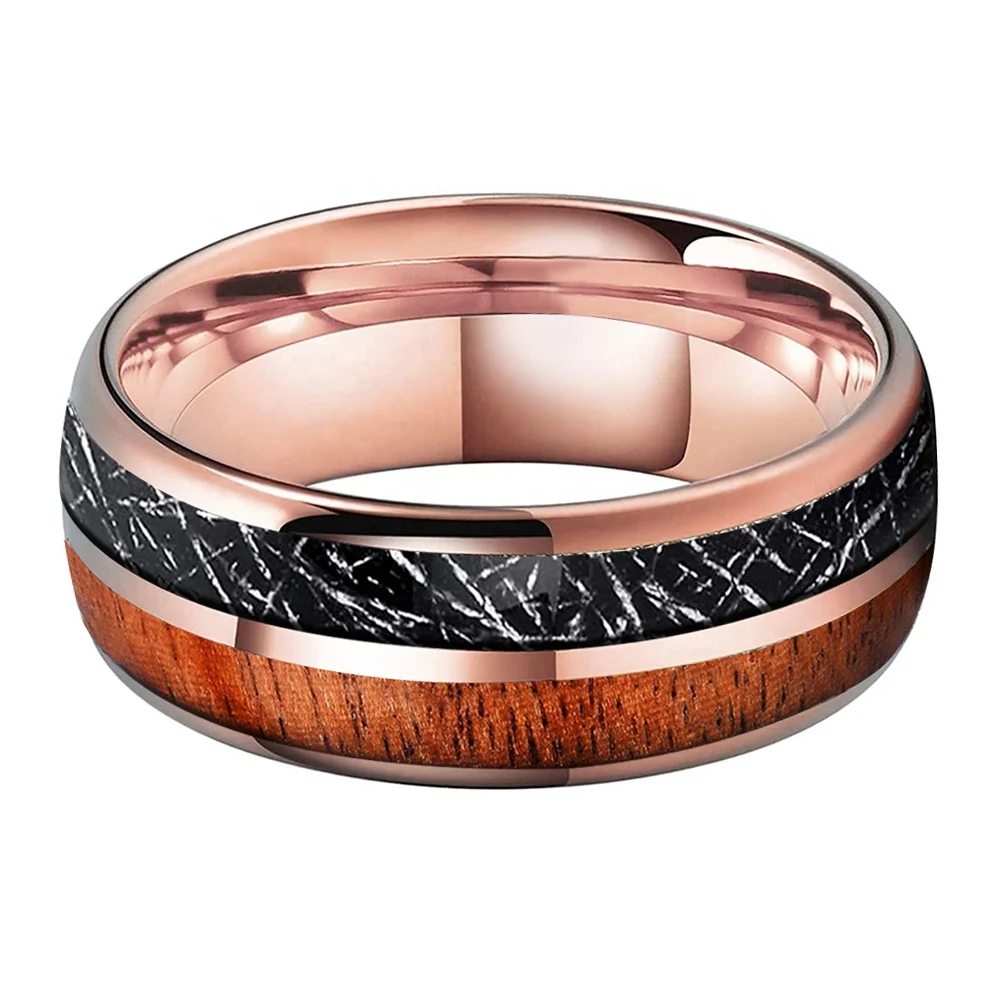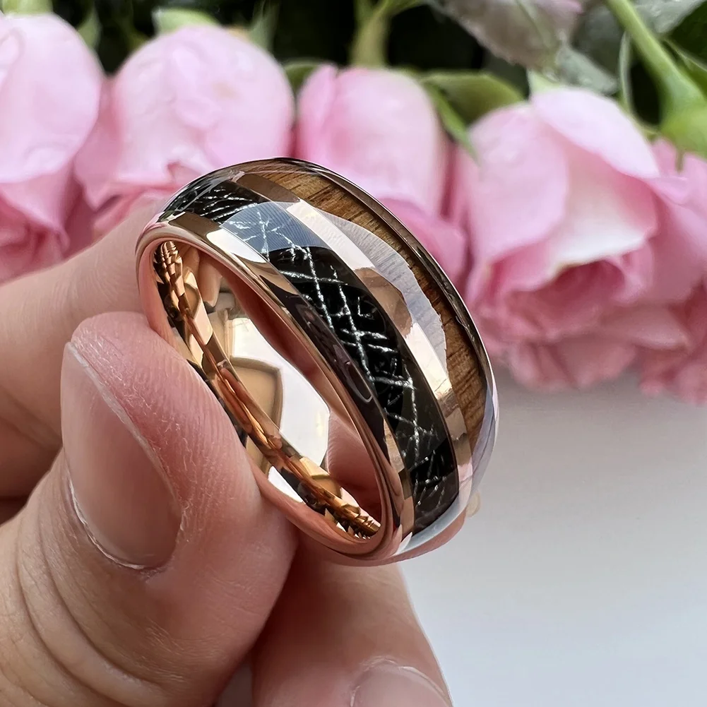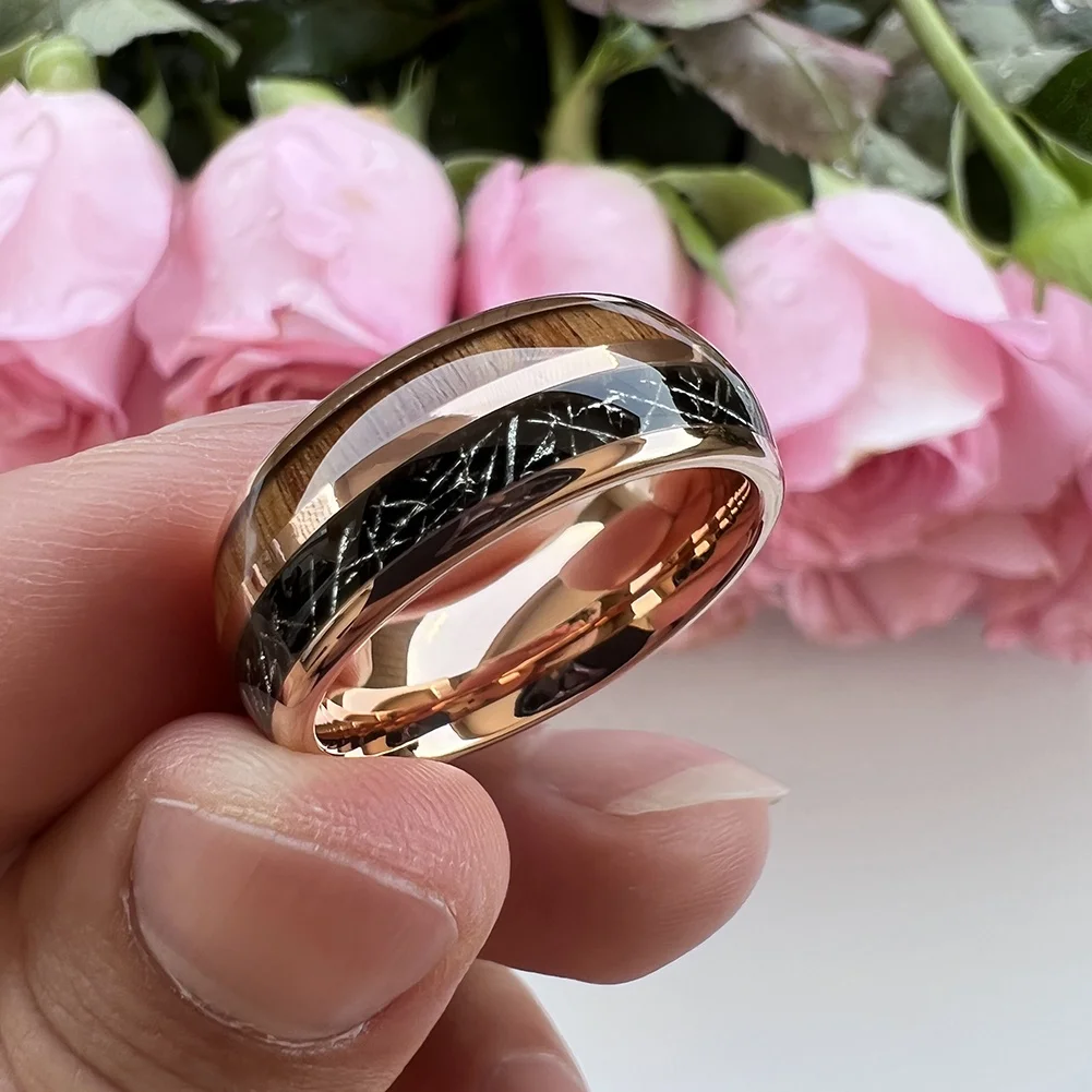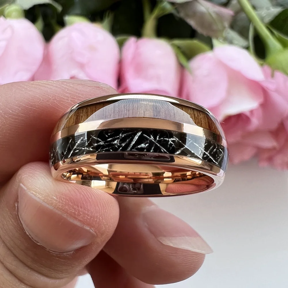 Coolstyle Jewelry 8mm Black Meteorite Koa Wood Inlay Fashion Engagement Wedding Band Rose Gold Tungsten Ring for Men Women