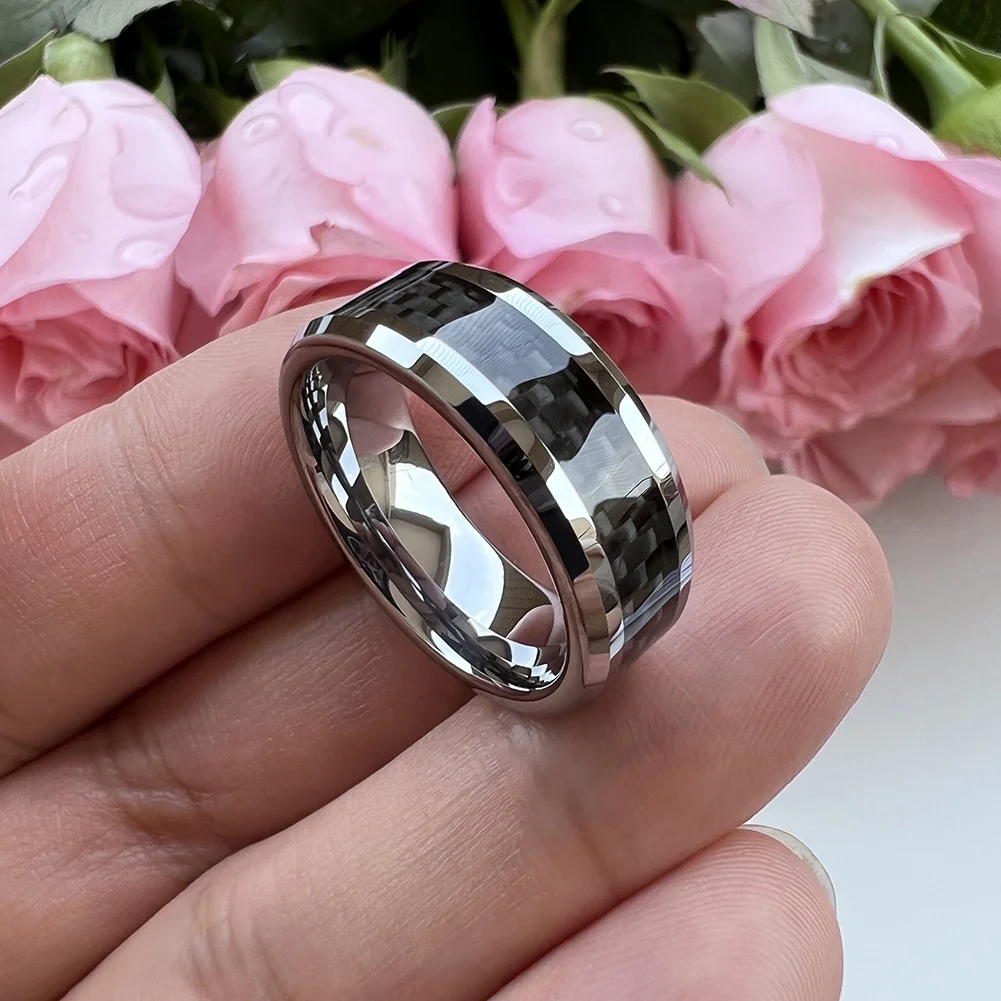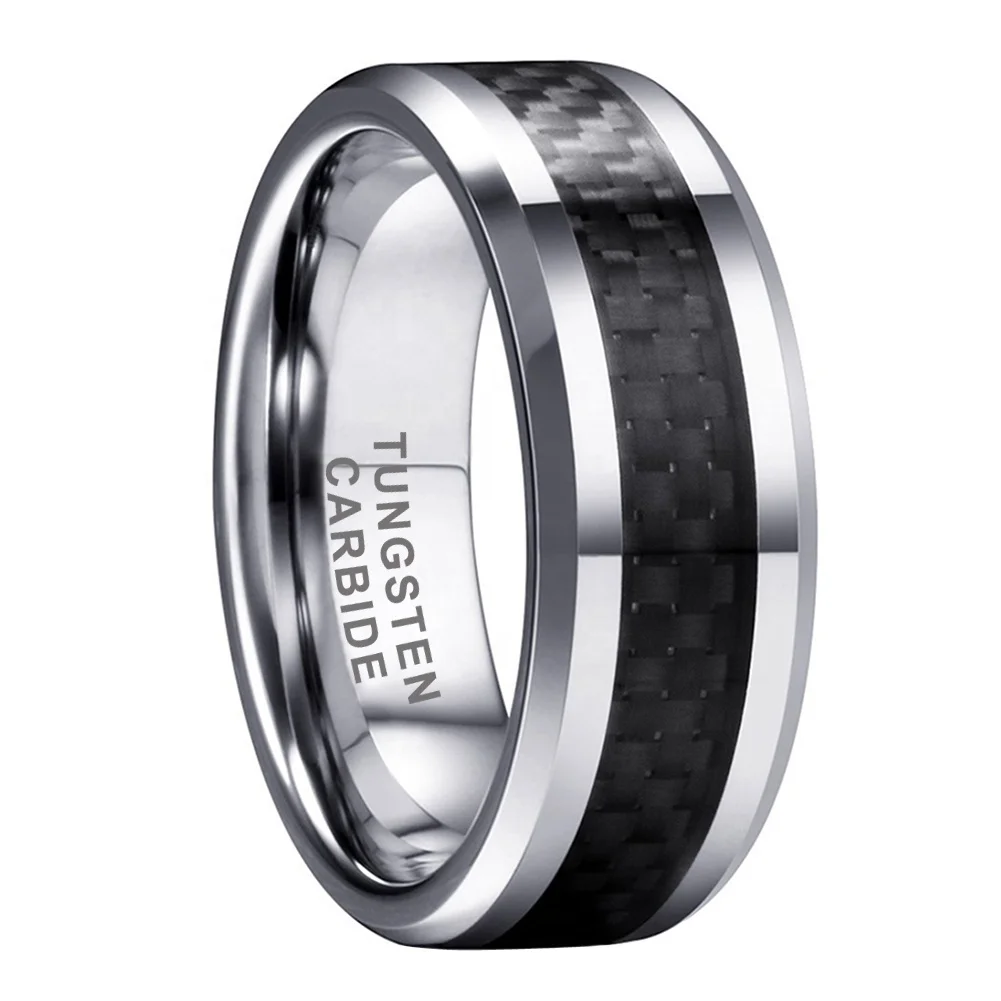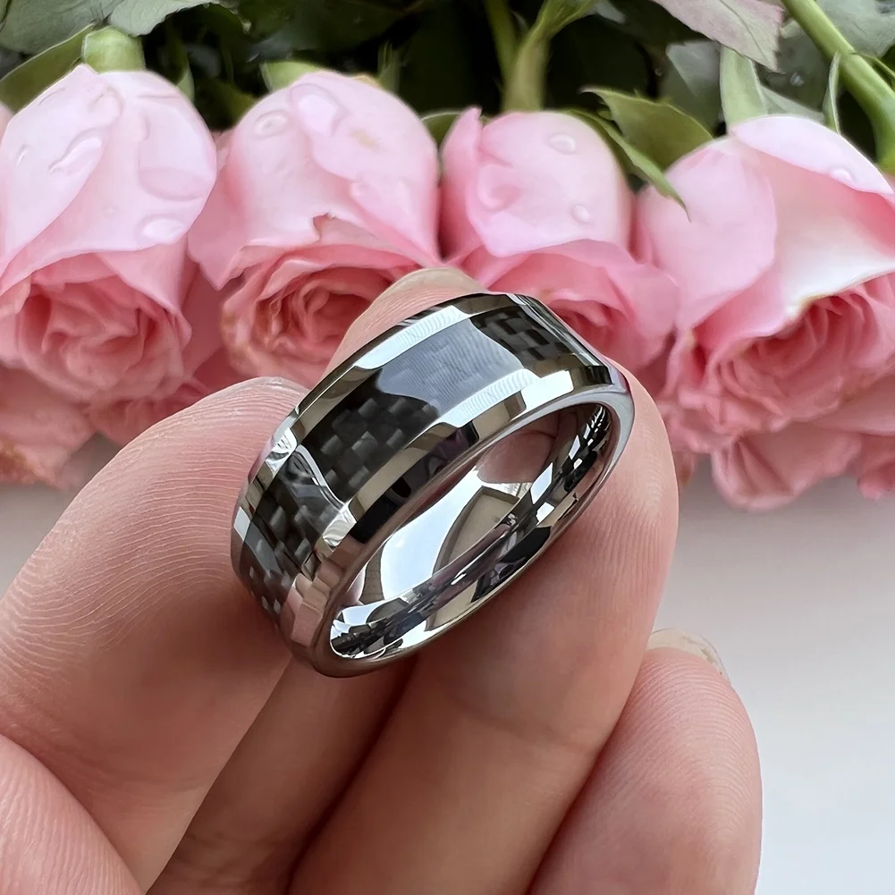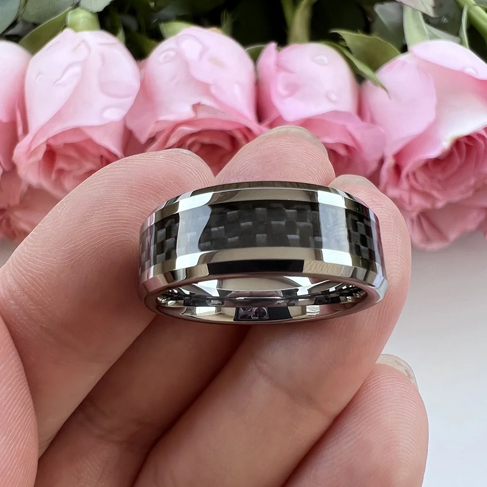 Coolstyle Jewelry 8mm Men Women Tungsten Carbide Ring Engagement Wedding Band Black Carbon Fiber Inlay Beveled Edges Comfort Fit