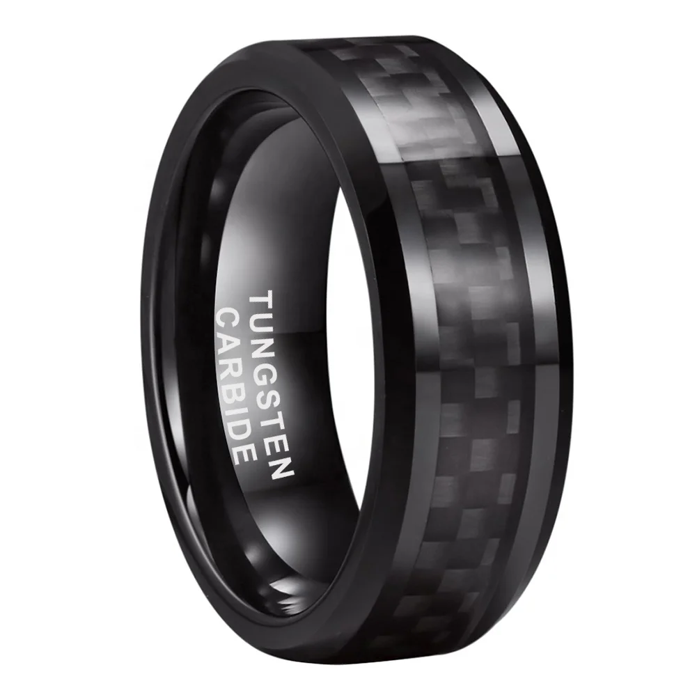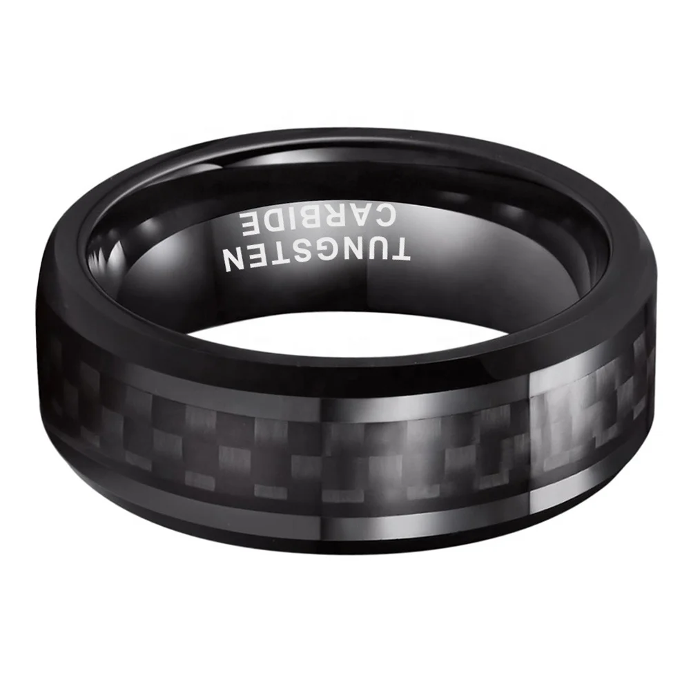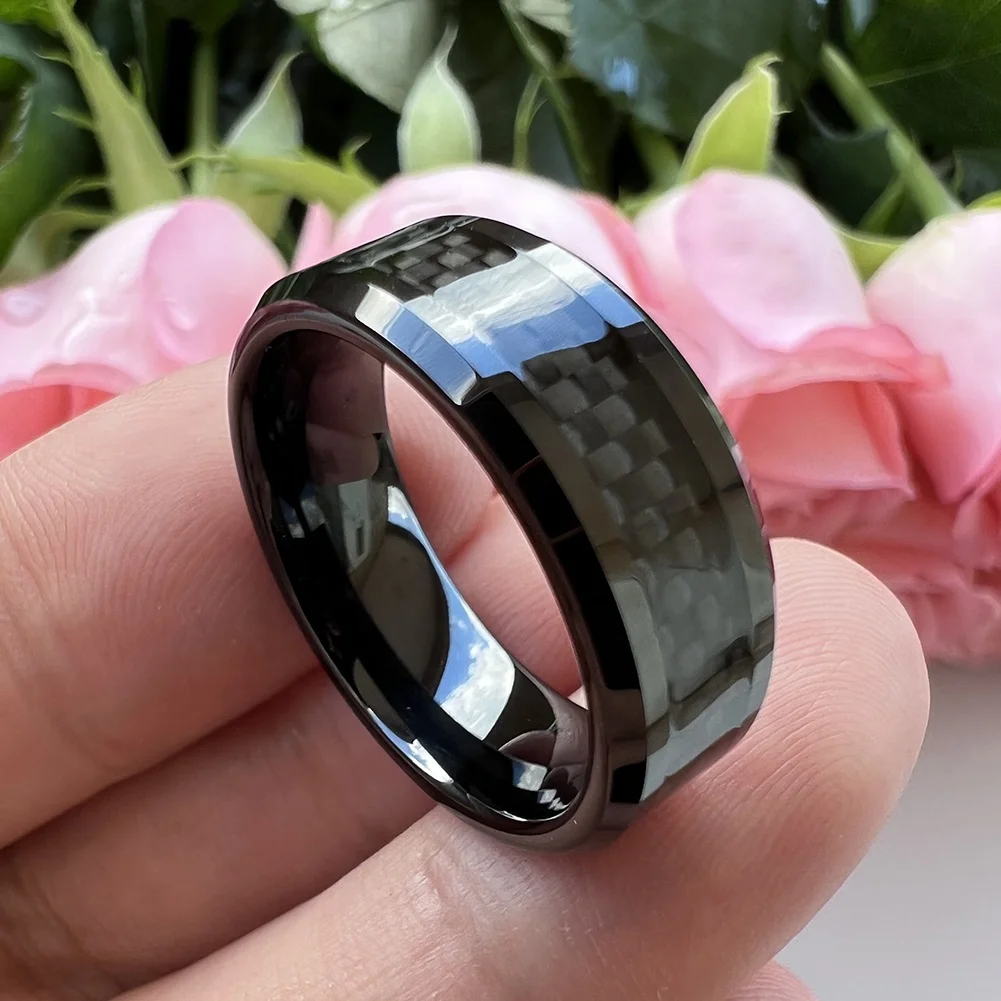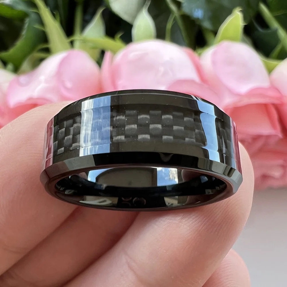 Coolstyle Jewelry 8mm Tungsten Ring for Men Women Engagement Wedding Band Black Carbon Fiber Inlay Beveled Edges Comfort Fit