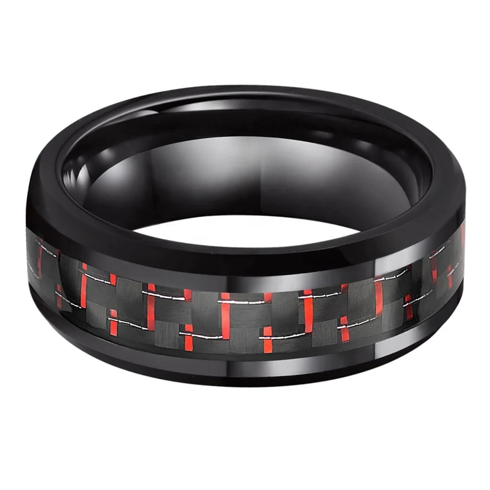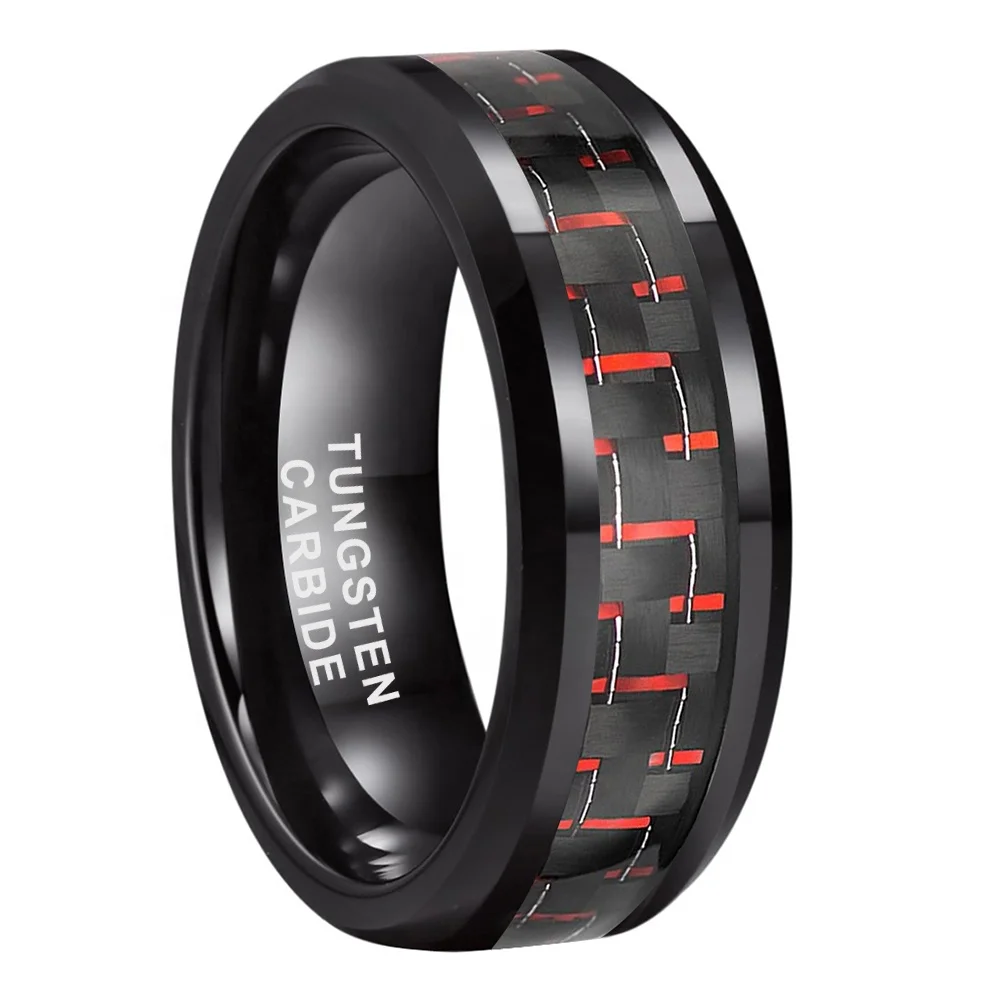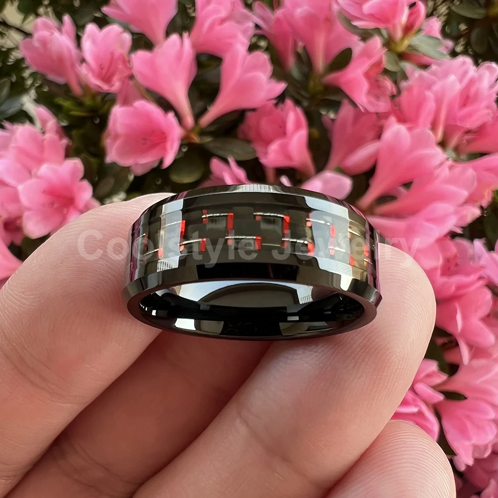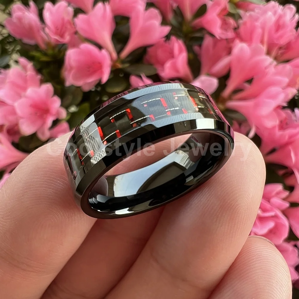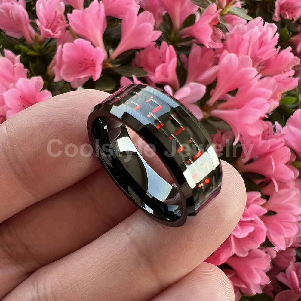 Coolstyle Jewelry 8mm Black Tungsten Ring for Men Women Engagement Wedding Band Black Red Carbon Fiber Inlay Beveled Comfort Fit