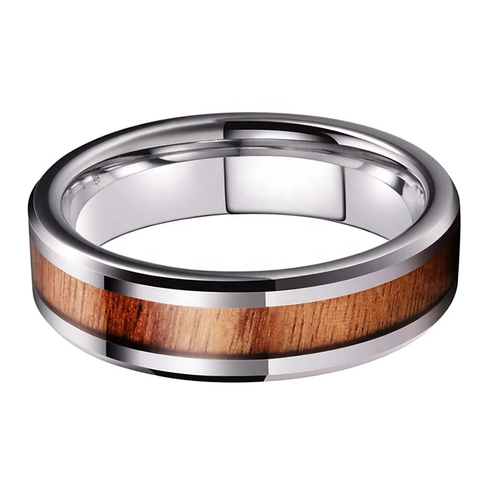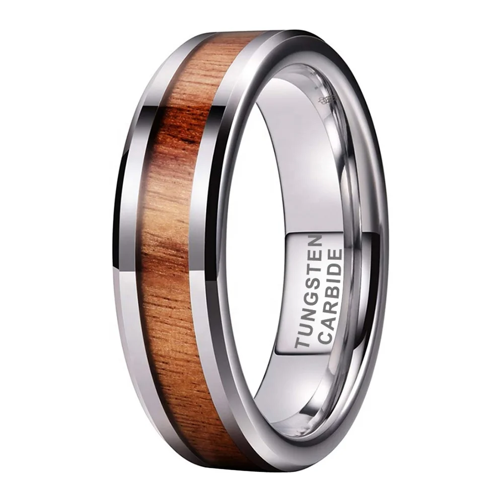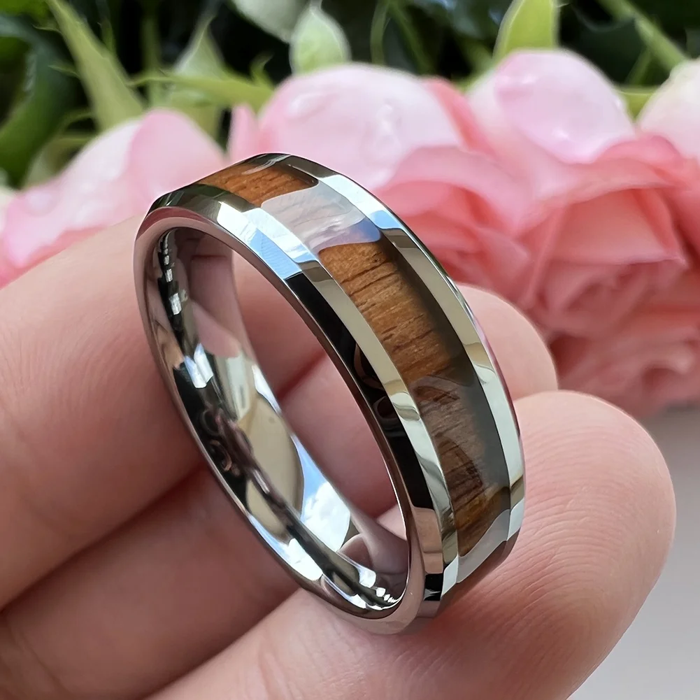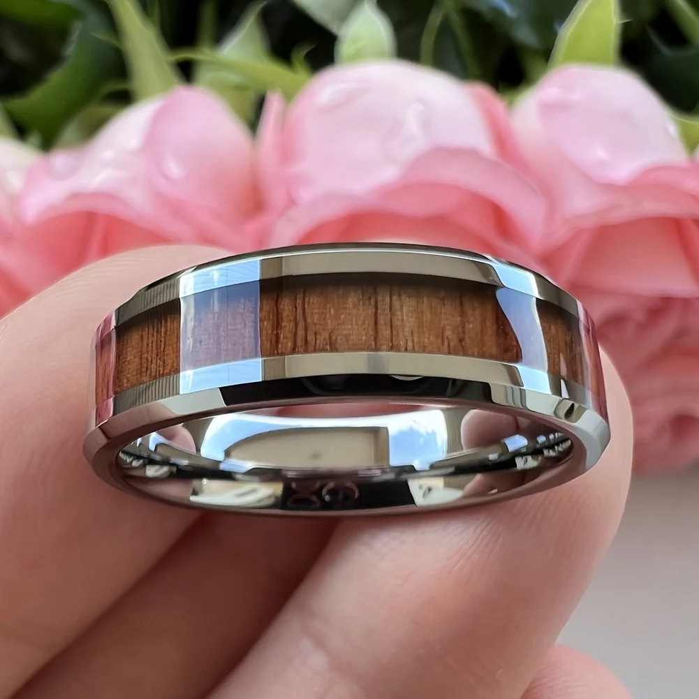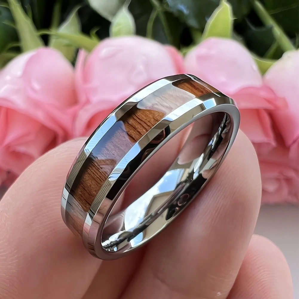 Coolstyle Jewelry 6mm Tungsten Carbide Ring for Men Women Engagement Wedding Band Koa Wood Inlay Beveled Edges Comfort Fit