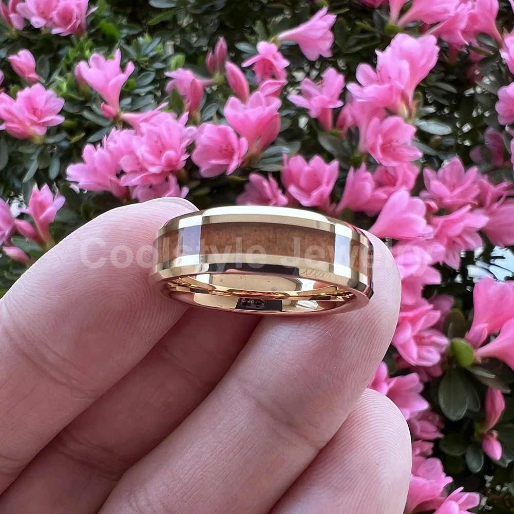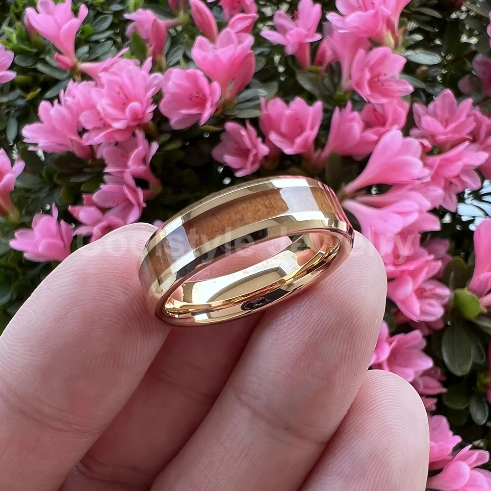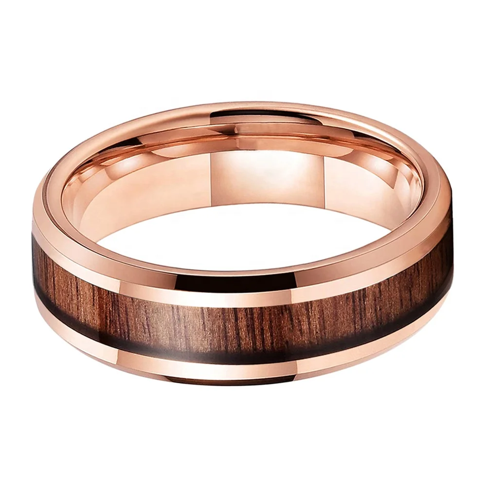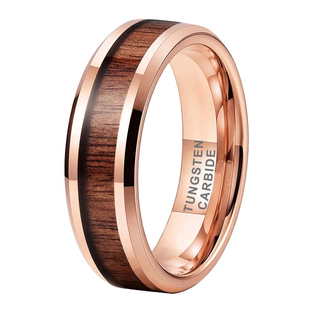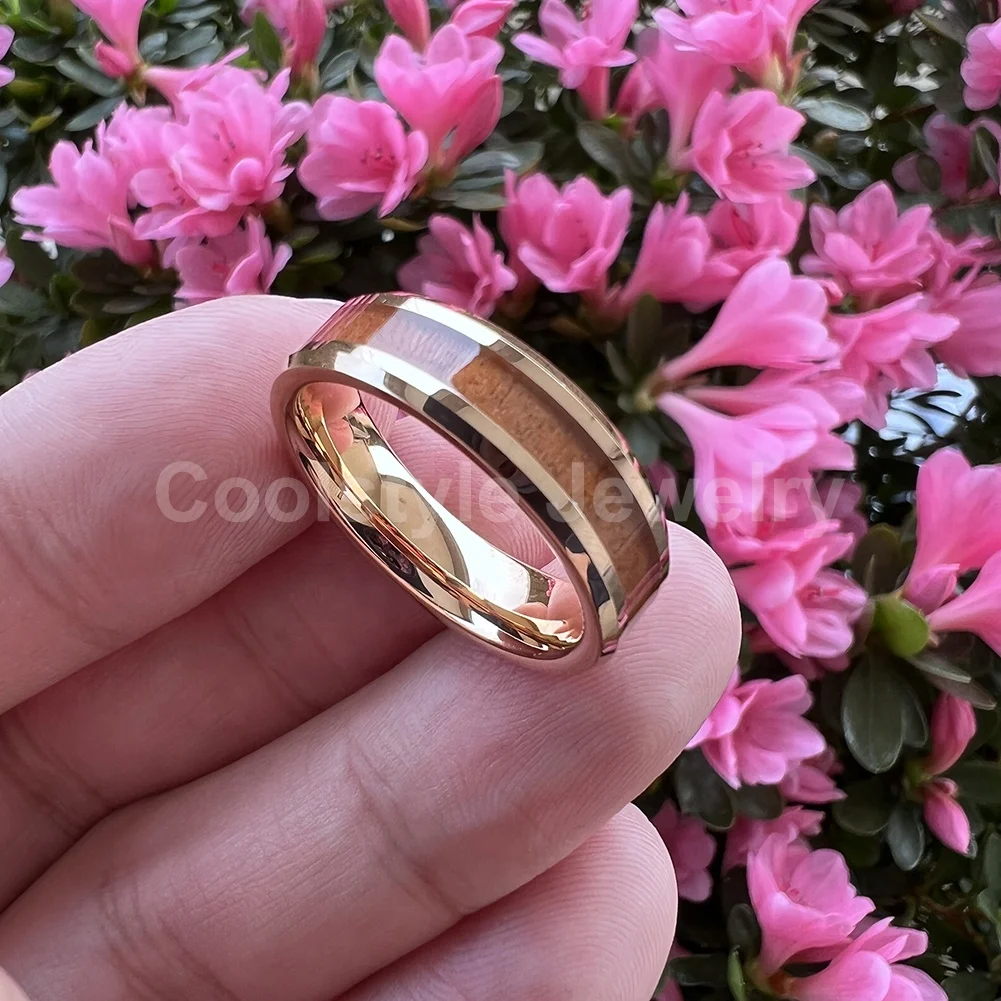 Coolstyle Jewelry 6mm Rose Gold Tungsten Ring for Men Women Engagement Wedding Band Koa Wood Inlay Beveled Edges Comfort Fit