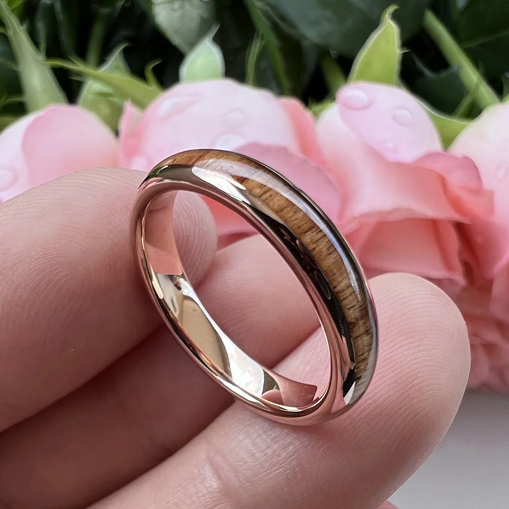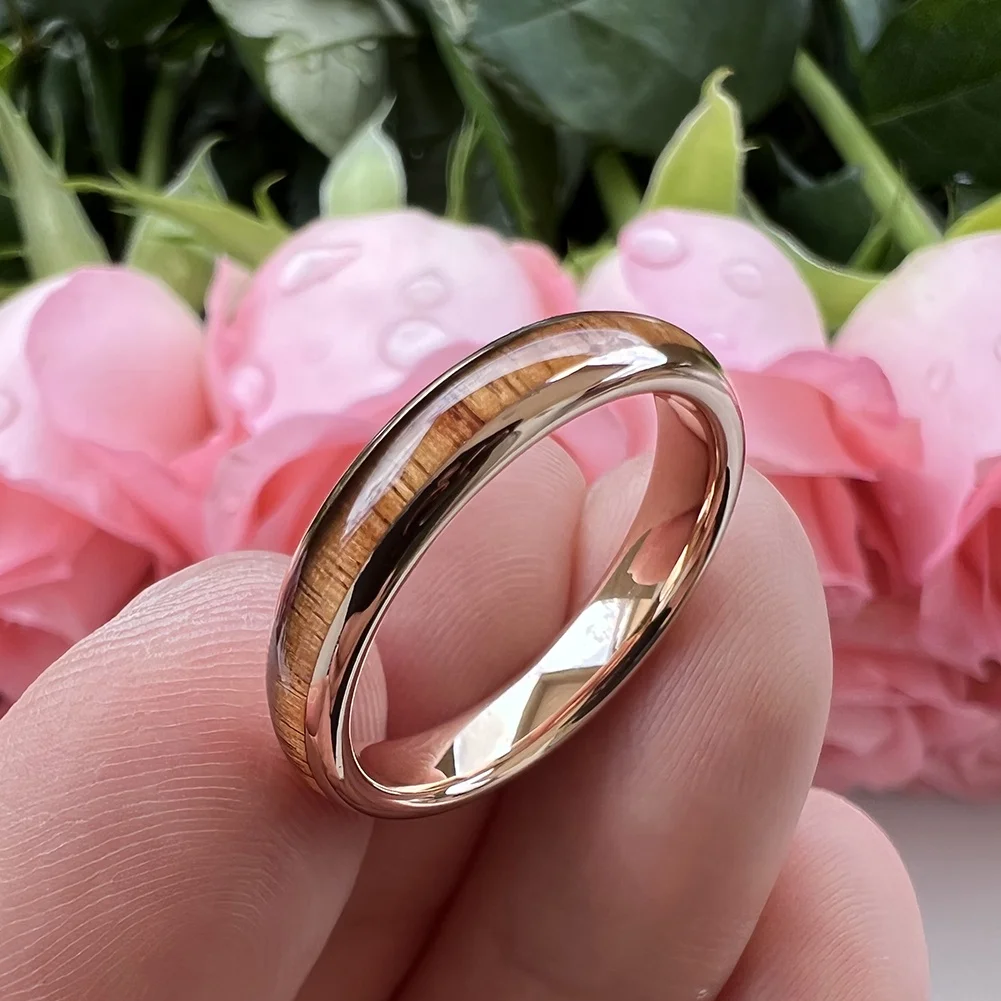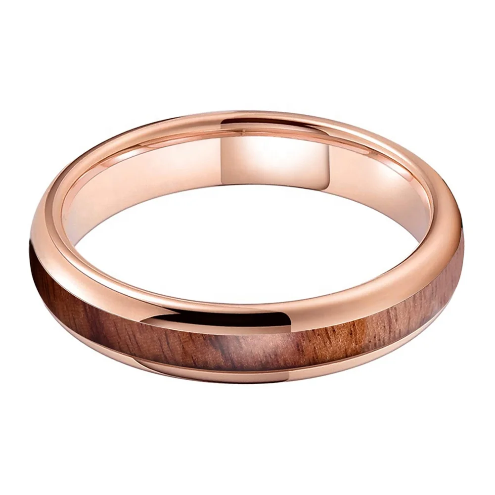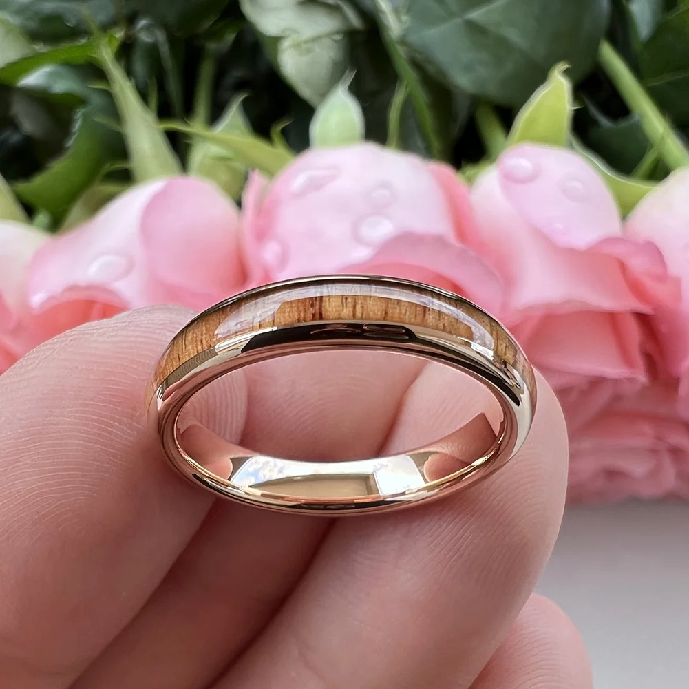Coolstyle Jewelry 4mm Rose Gold Tungsten Ring for Women Men Engagement Wedding Band Koa Wood Inlay Domed Polished Comfort Fit