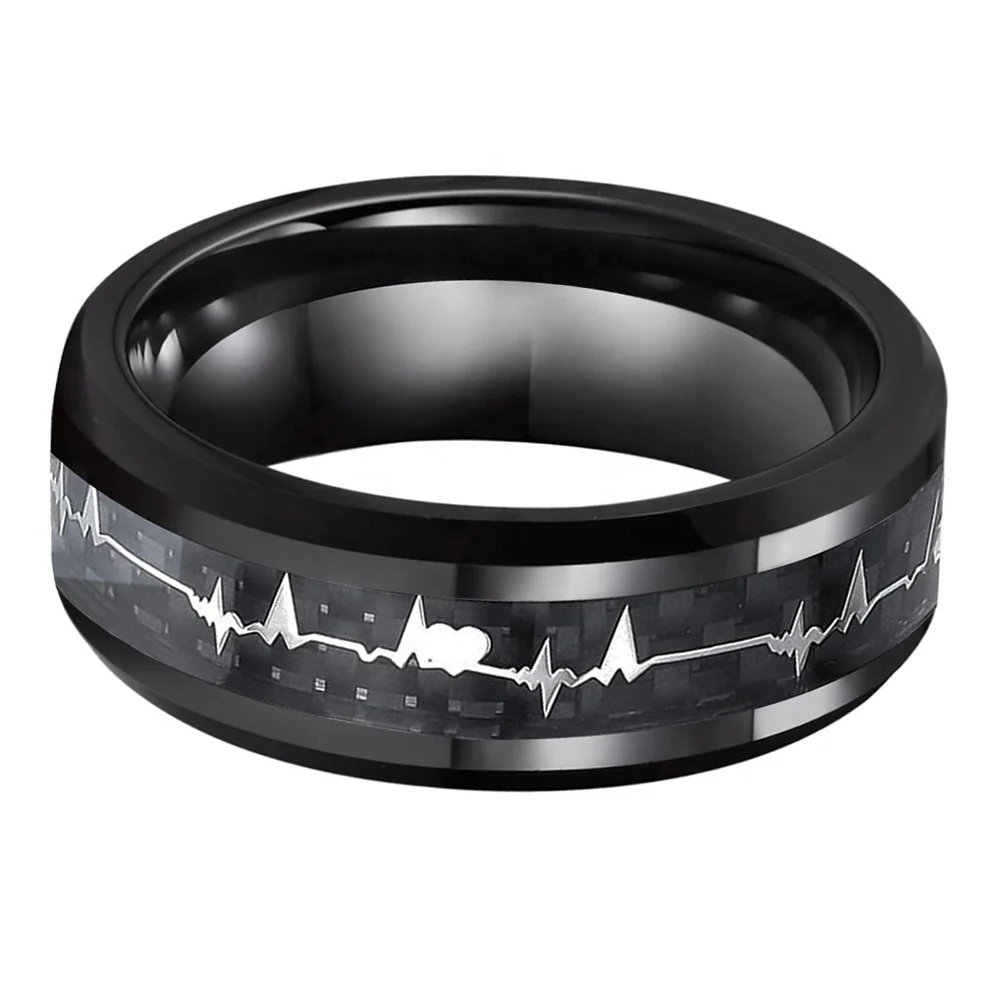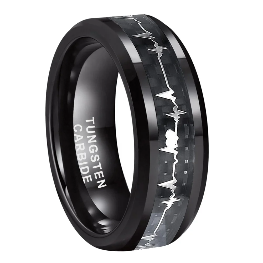 Coolstyle Jewelry 8mm Black Tungsten Carbide Ring for Men Women Black Carbon Fiber Heartbeat Inlay Beveled Polished Comfort Fit